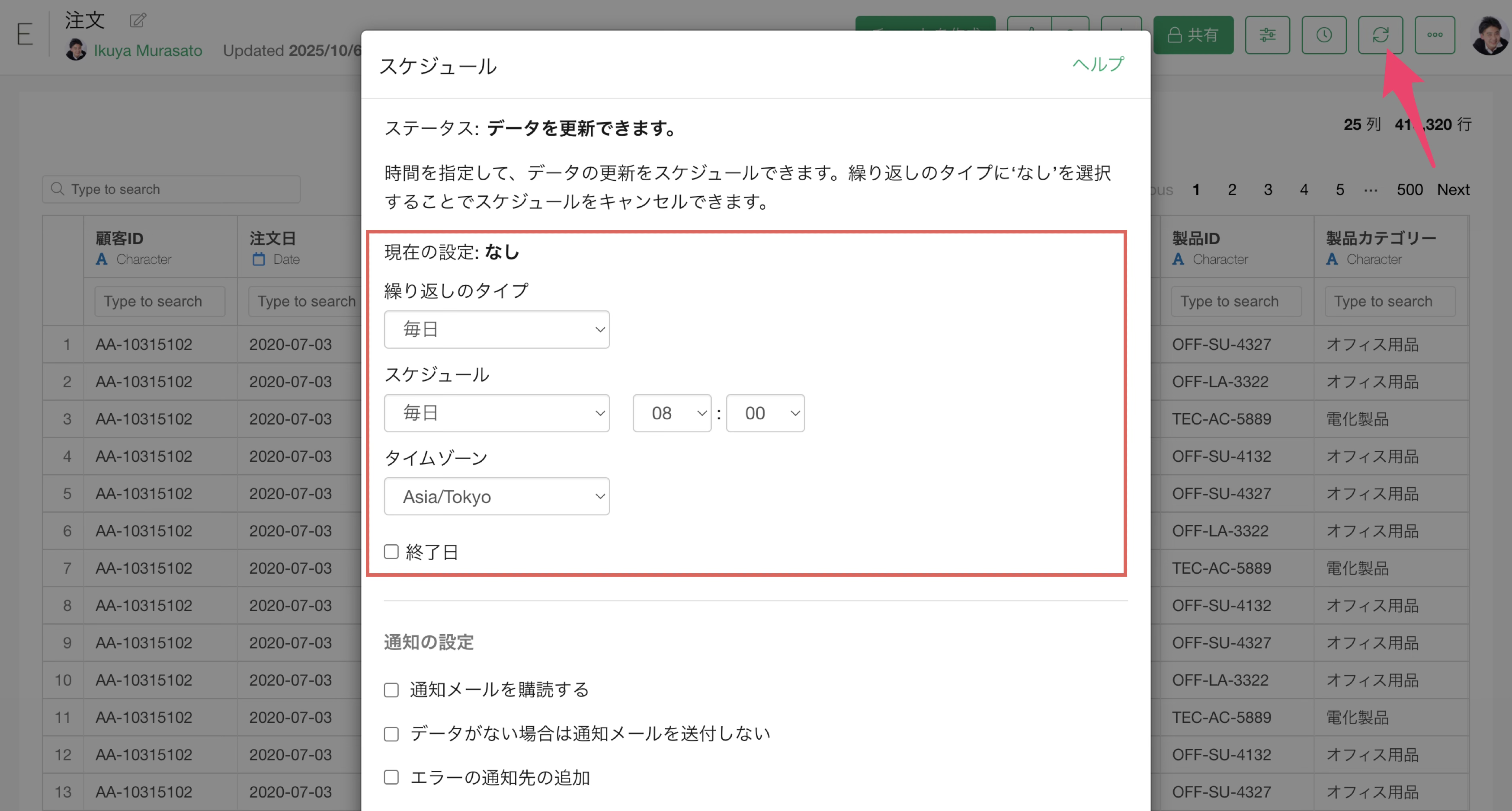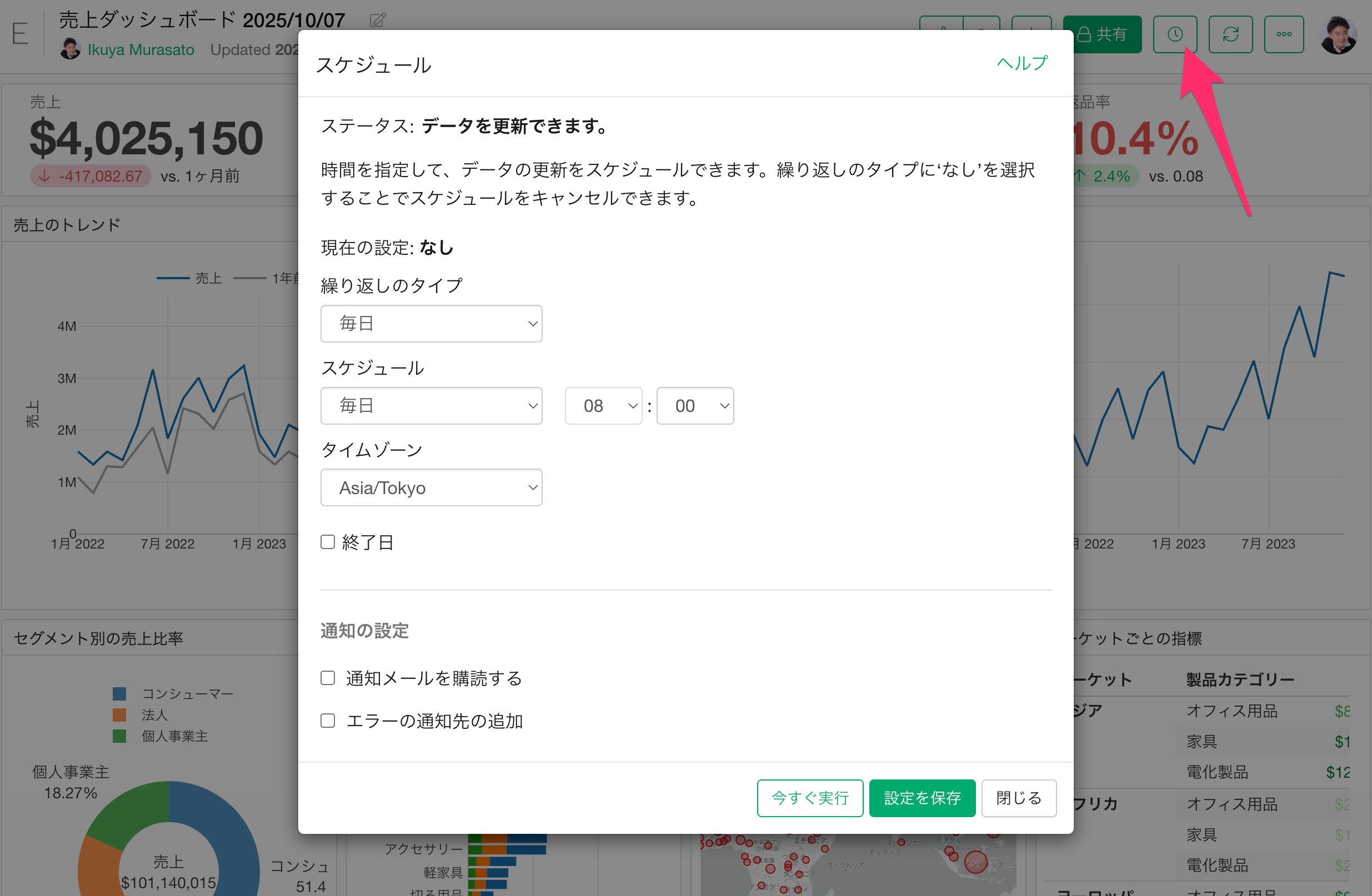 例えば、データカタログは毎朝8時に更新するように設定し、ダッシュボードの更新は毎朝9時に設定することで、期待通りの処理を実現できます。