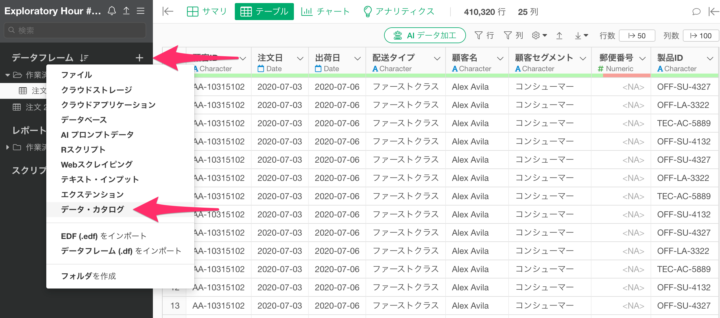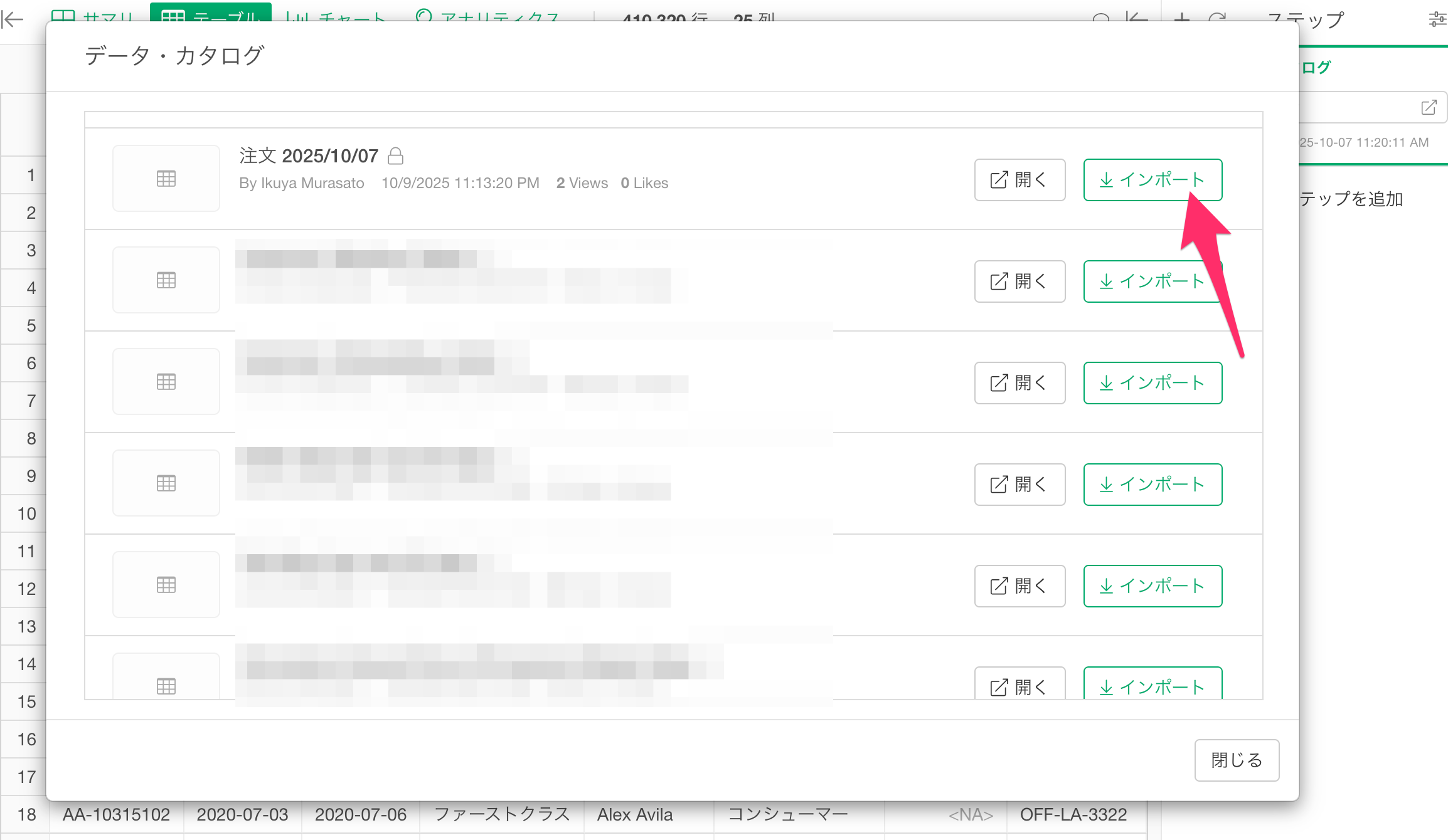 最後に、パブリッシュしたデータカタログをデータソースとしてインポートします。