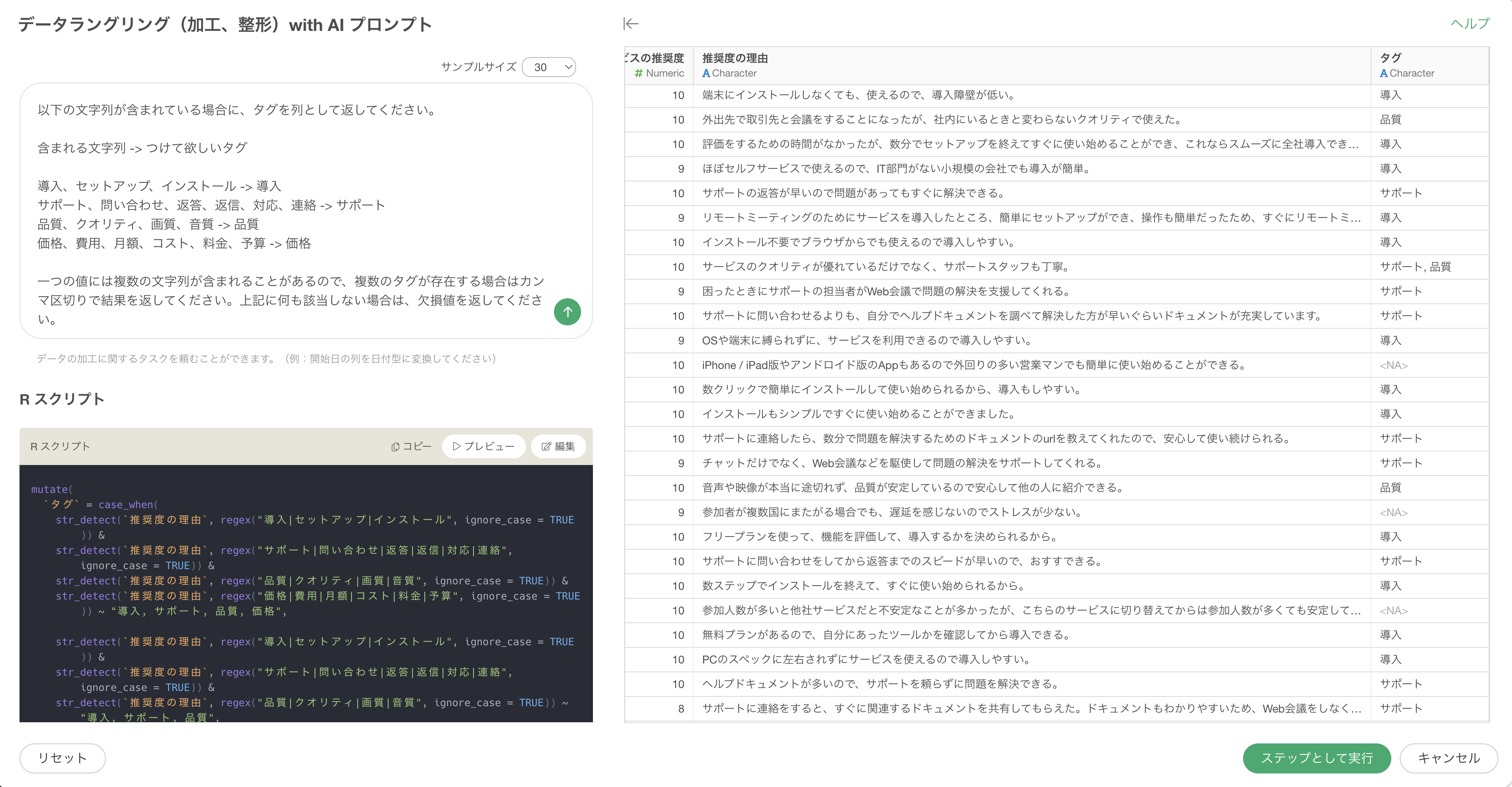 このステップを実行することで、アンケートの自由回答データに対して、指定されたキーワードに基づくタグ付けが自動的に行われます。
