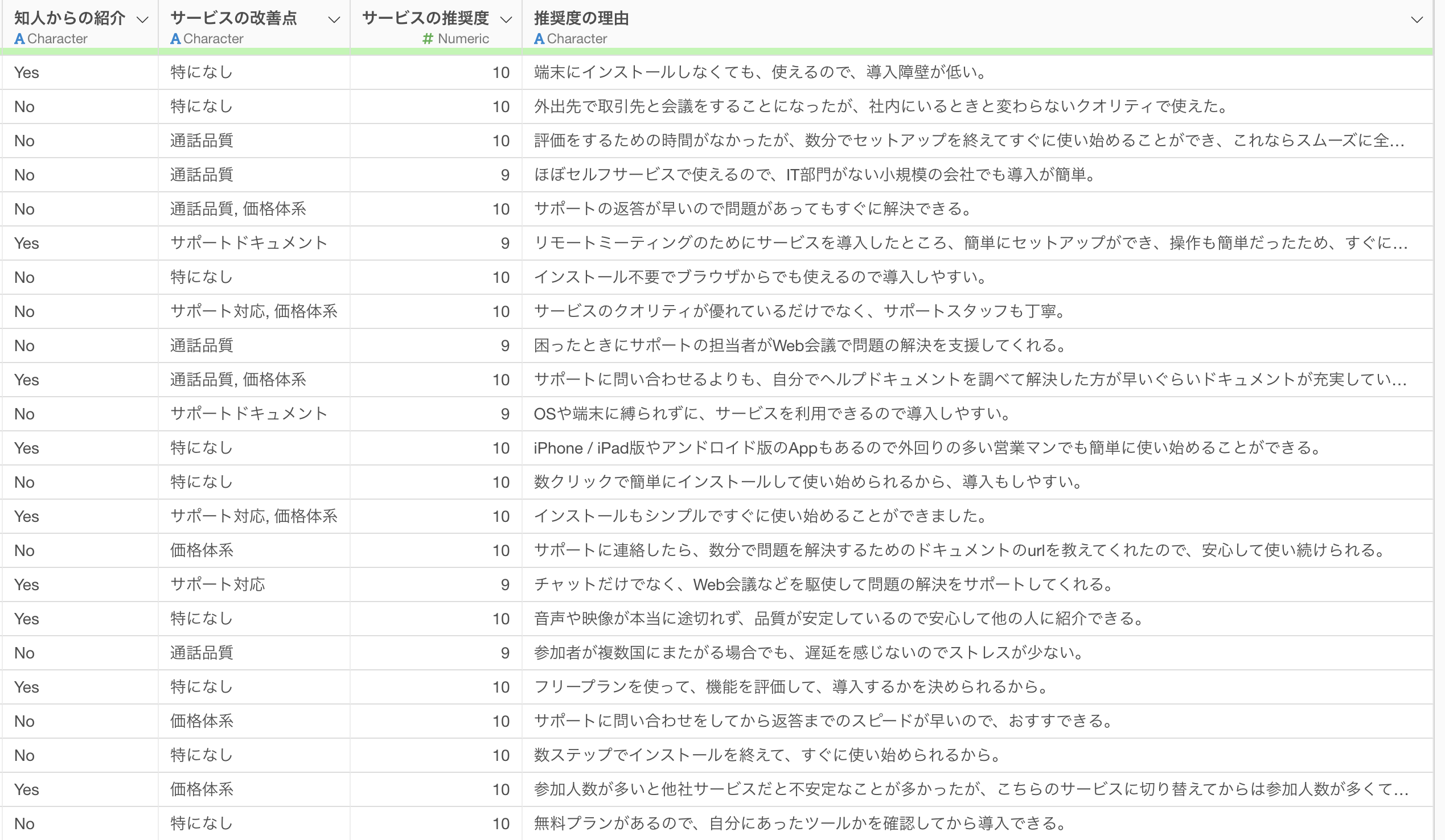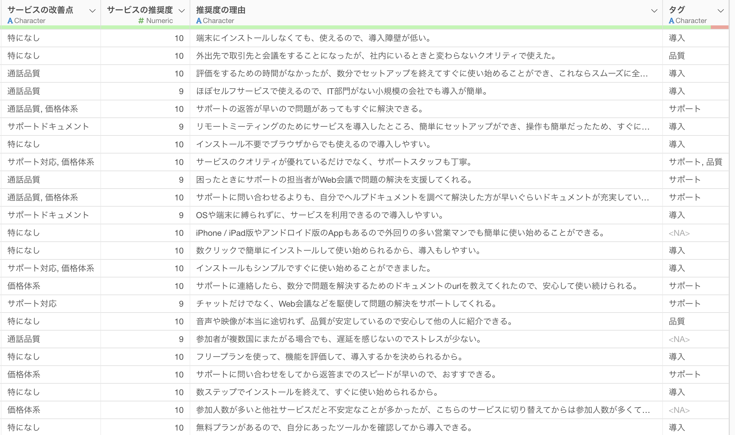 まず、今回使用するデータは、1行が1回答者に対応するアンケートデータです。このデータには「推奨度の理由」という自由記述形式の列が含まれており、この列のテキスト内容に基づいてタグ付けを行います。