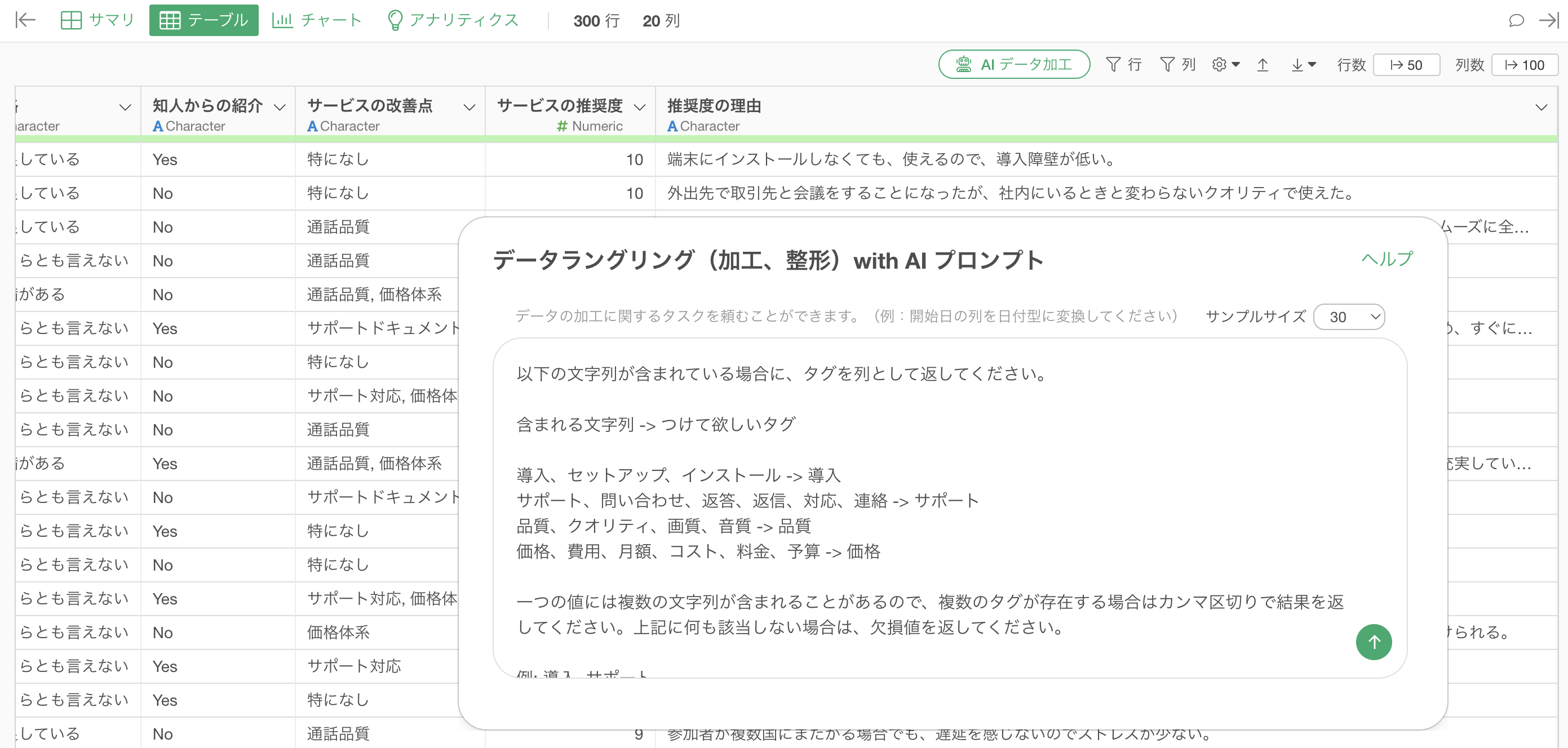テーブルビューから「AIデータ 加工」のボタンをクリックし、プロンプトには以下を指定します。