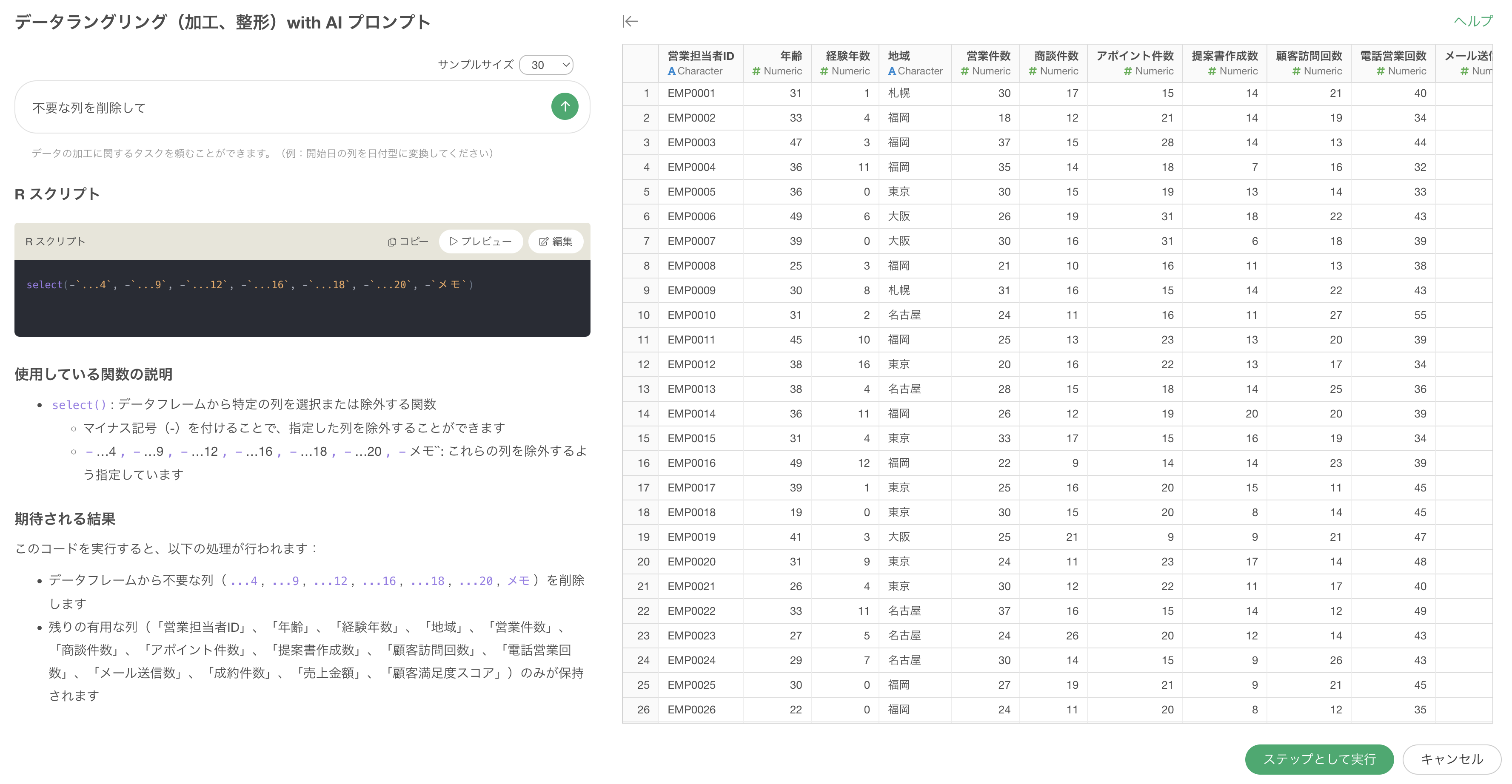 これらの不要な列を一括で削除するために、ExploratoryのAIプロンプト機能を使用します。