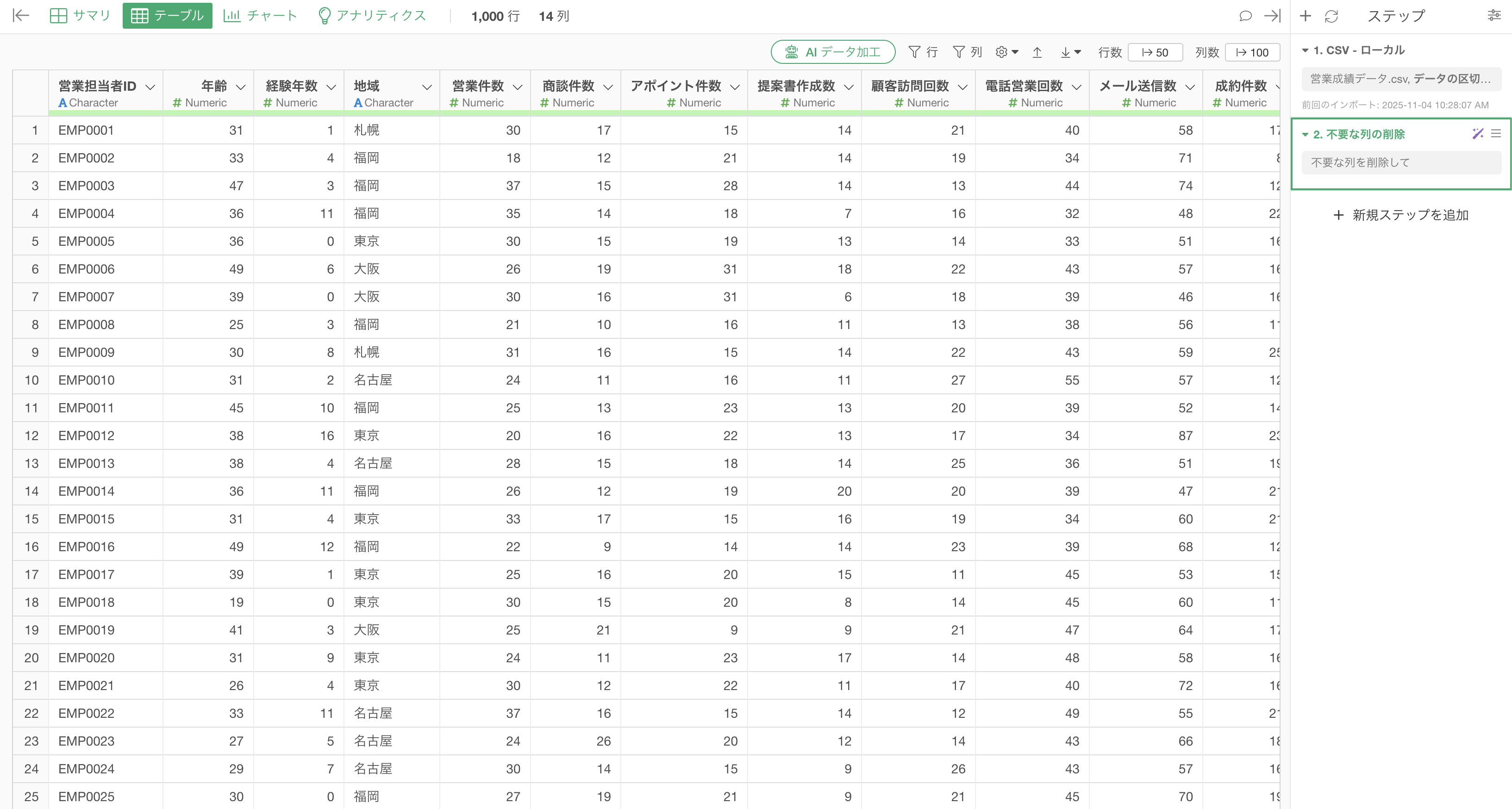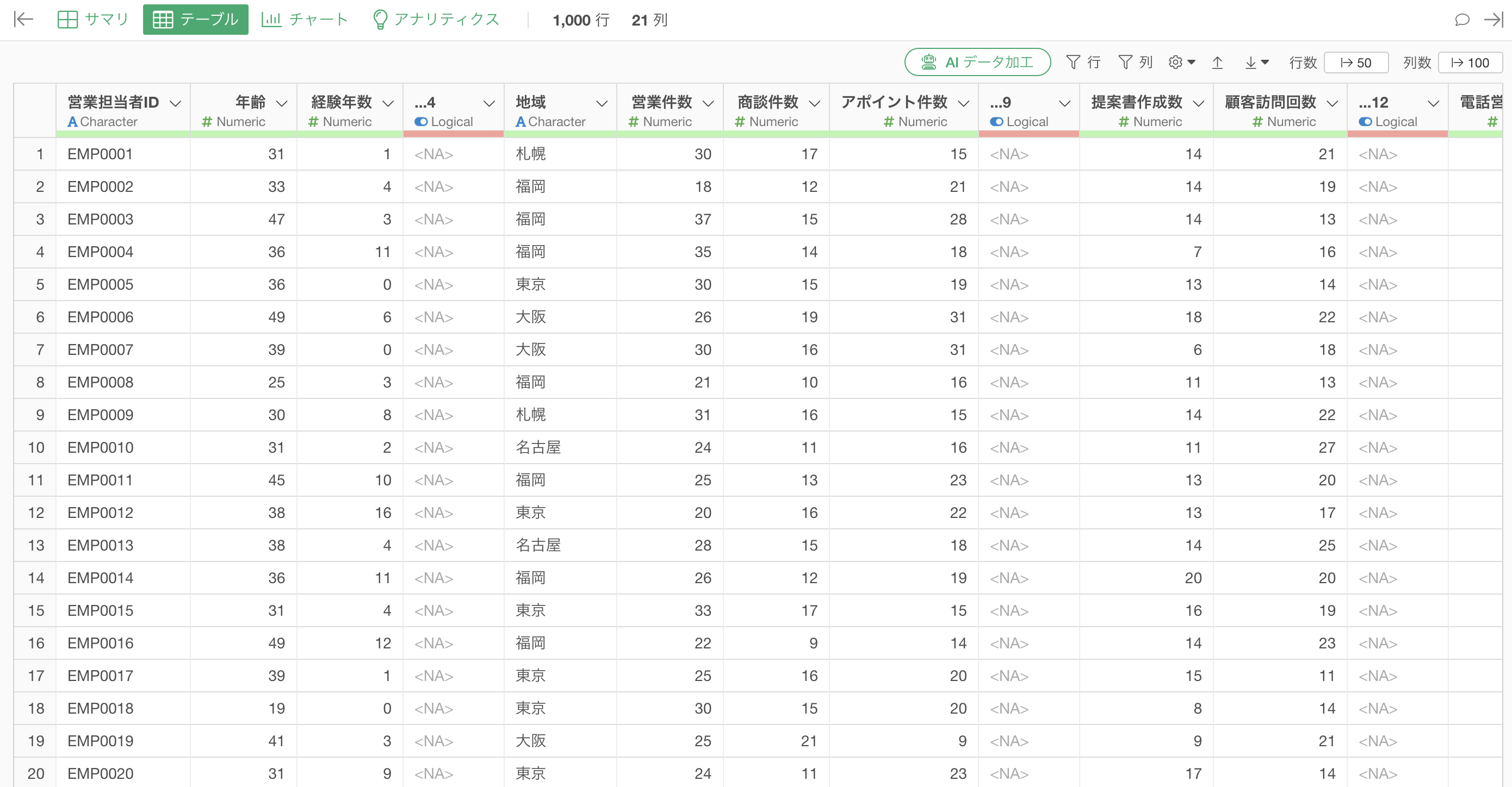 今回使用するデータは「営業成績データ」であり、1行が営業担当者のデータに対応し、年齢、経験年数、地域などの属性情報や営業成績に関する列が含まれています。このデータには、Excelからのインポート時に生成された「…4」や「…9」といった完全に空白の不要な列が存在します。