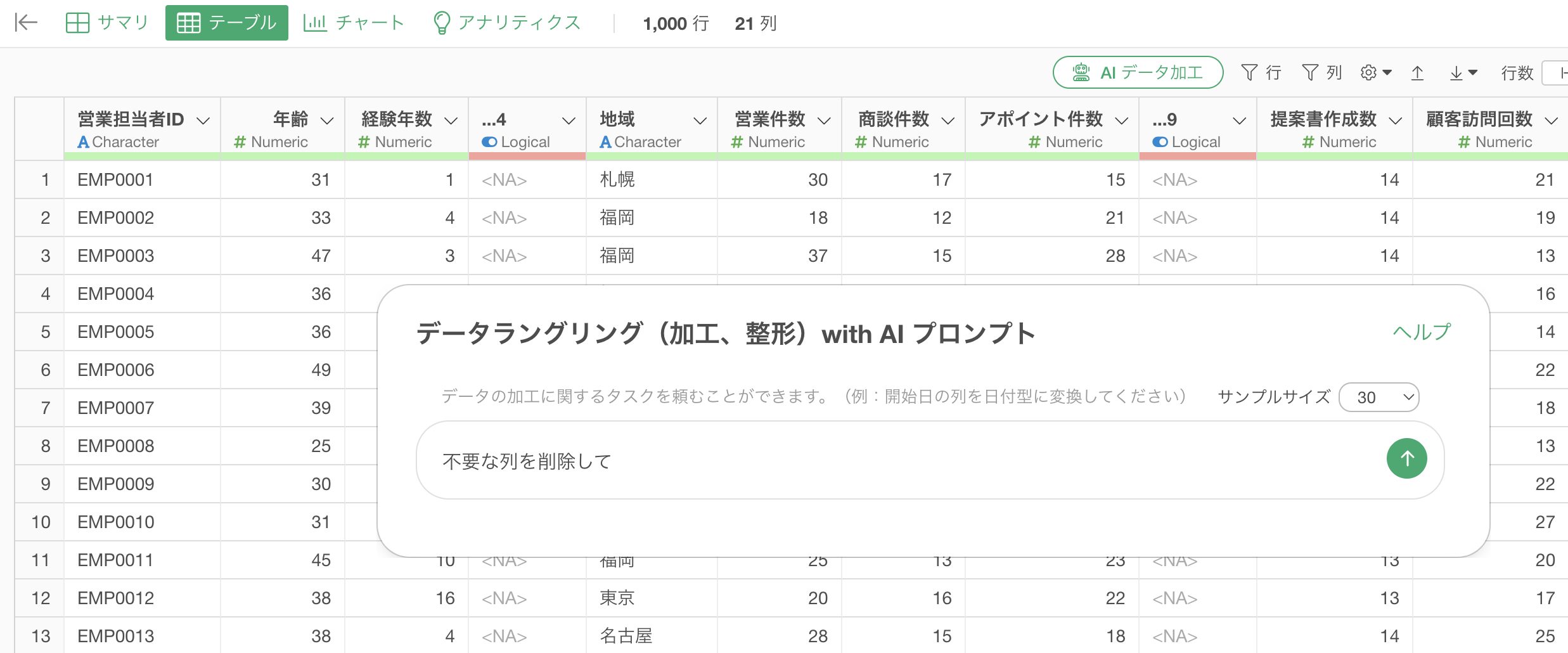 テーブルビューから「AI データ加工」ボタンをクリックし、プロンプトの入力欄に「不要な列を削除して」と入力します。