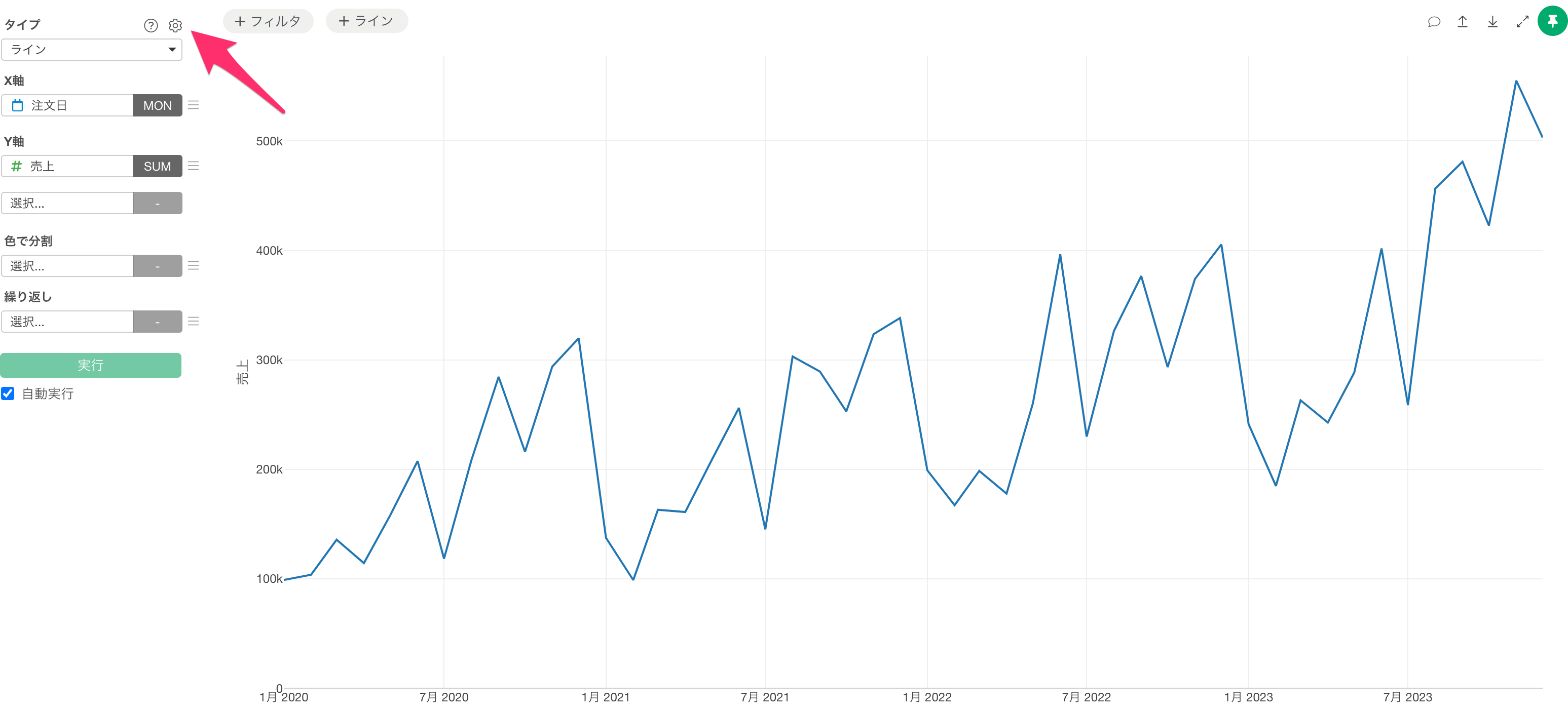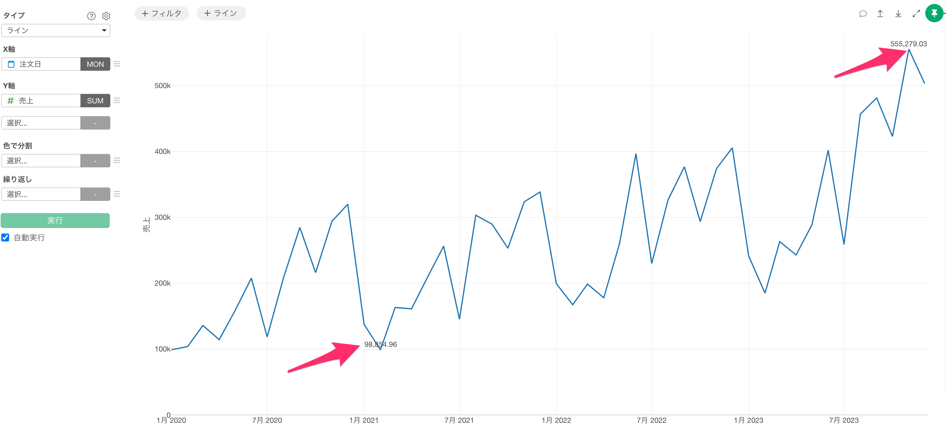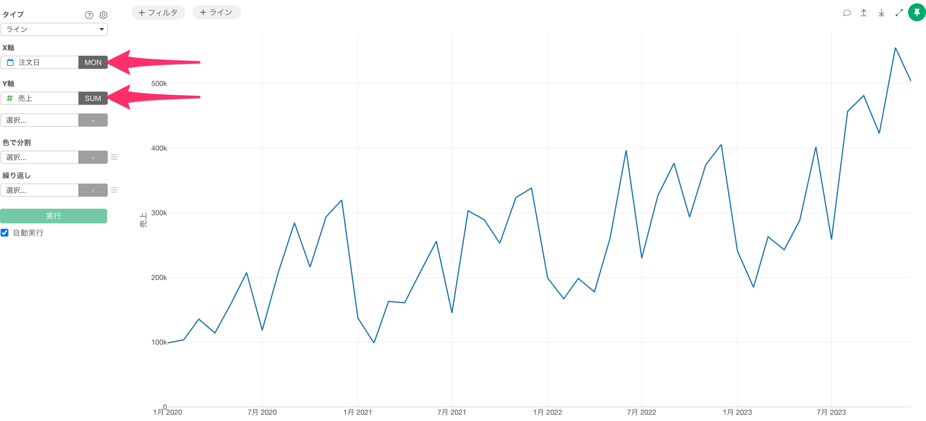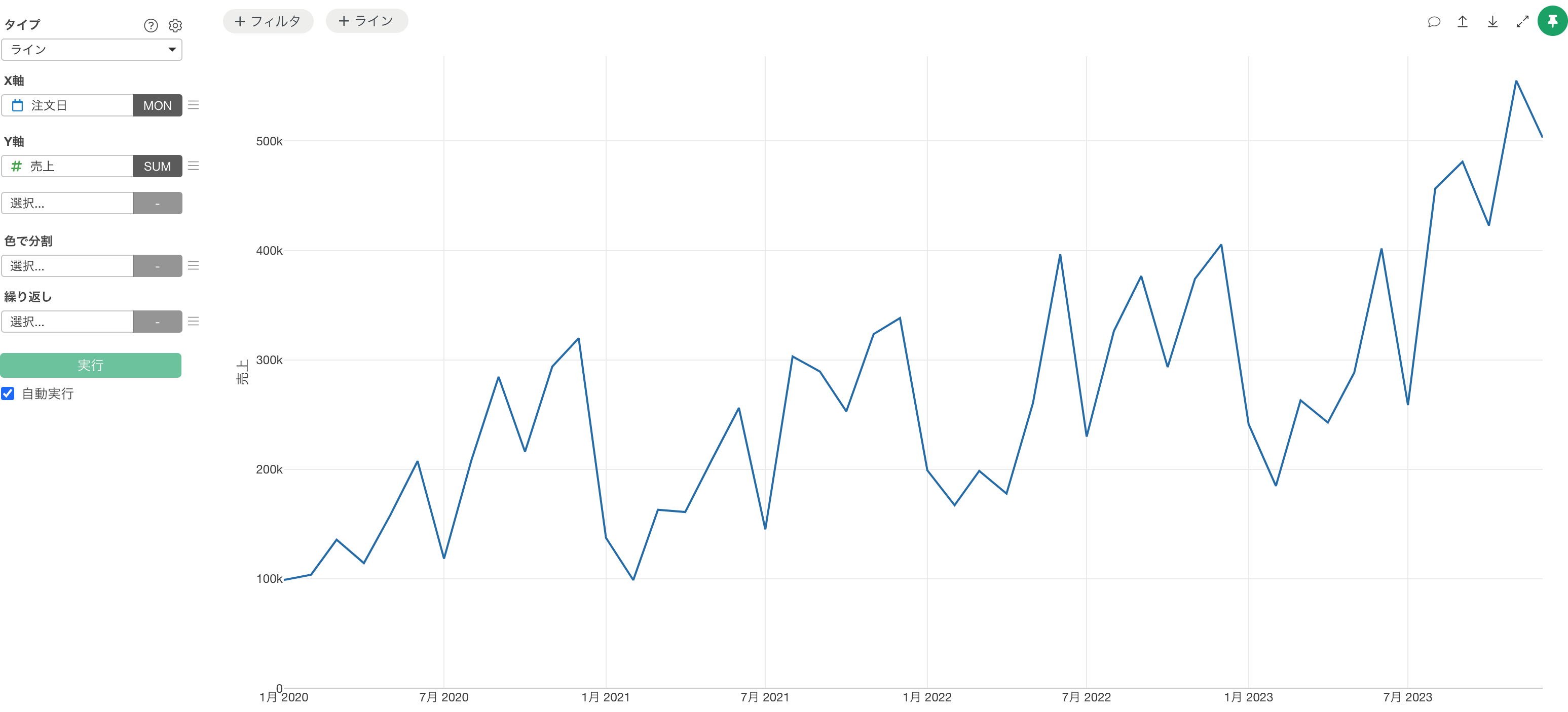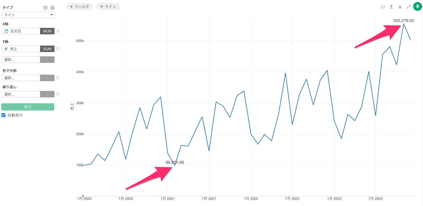 チャートビューに移動し、タイプに「ライン」を選択し、X軸に「注文日」を設定して日付の単位を「月」にし、Y軸には「売上」を選択します。
