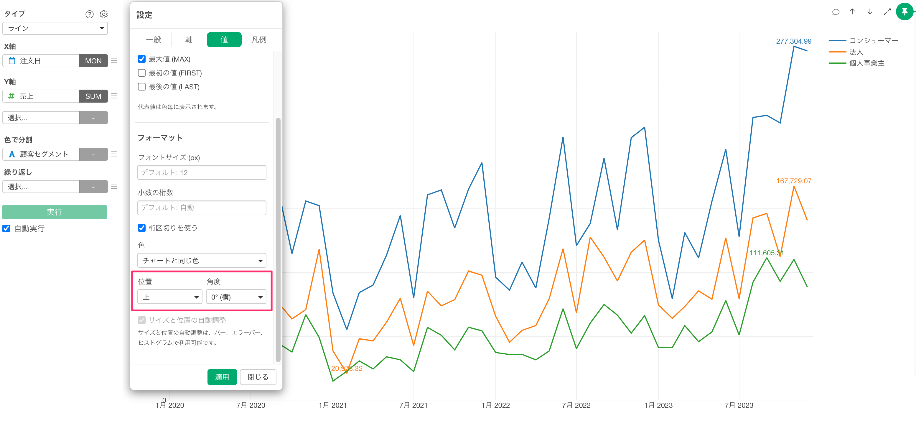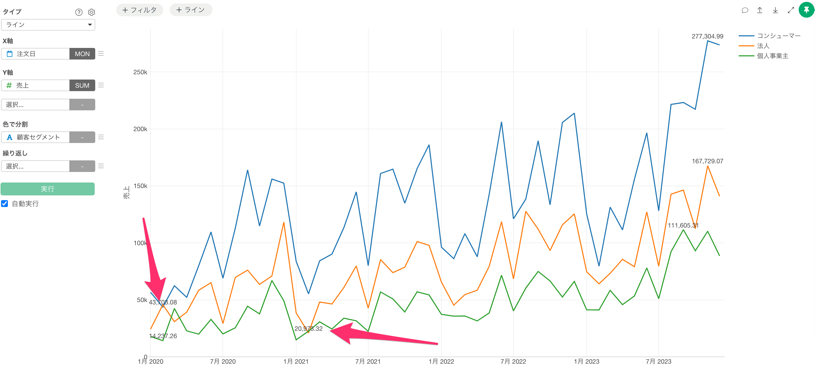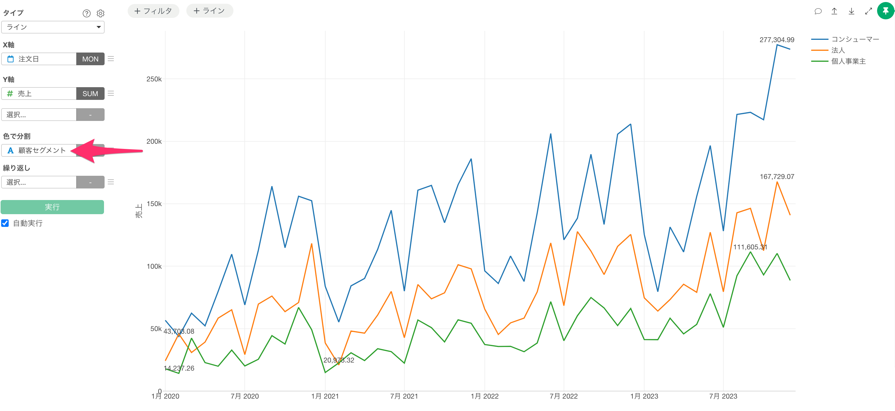 これで顧客セグメントごとにラインが色分けされ、各カテゴリーごとに最小値と最大値が表示されました。顧客セグメントによって最大値や最小値の発生時期が異なるため、それぞれのカテゴリーに対して適切な値が表示されています。