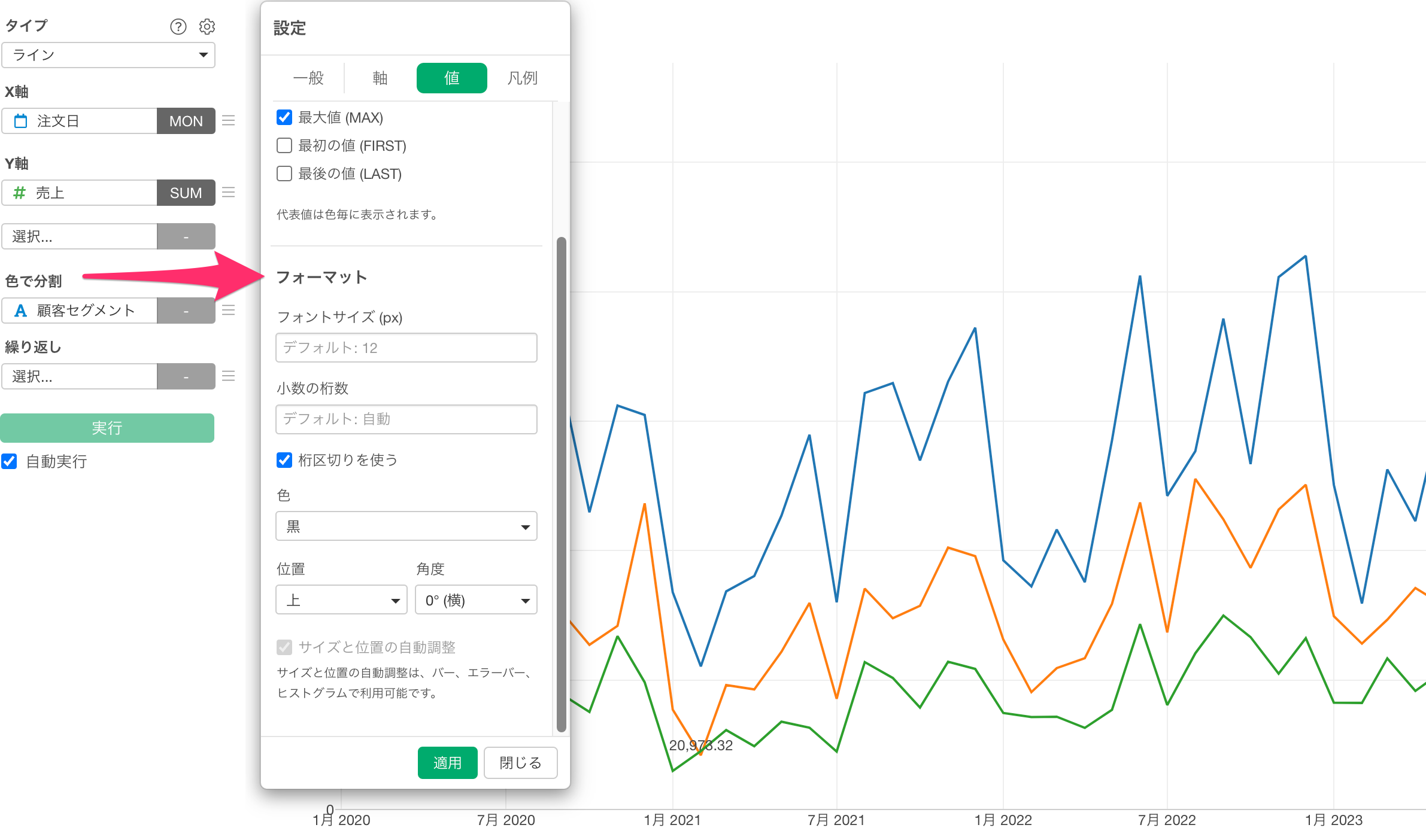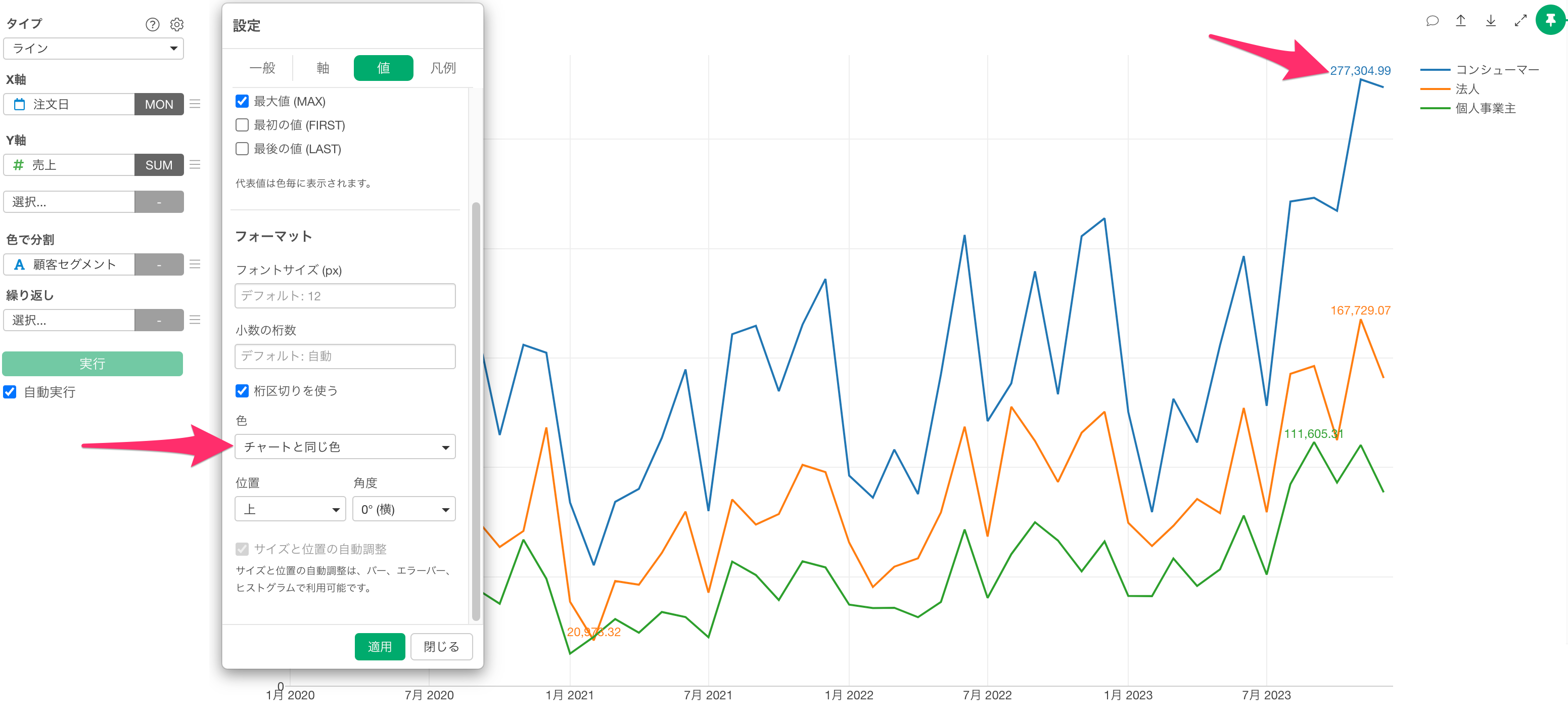 例えば「色」の項目で「チャートと同じ色」を選択すると、表示される値の色がチャートの線の色と一致するように設定できます。