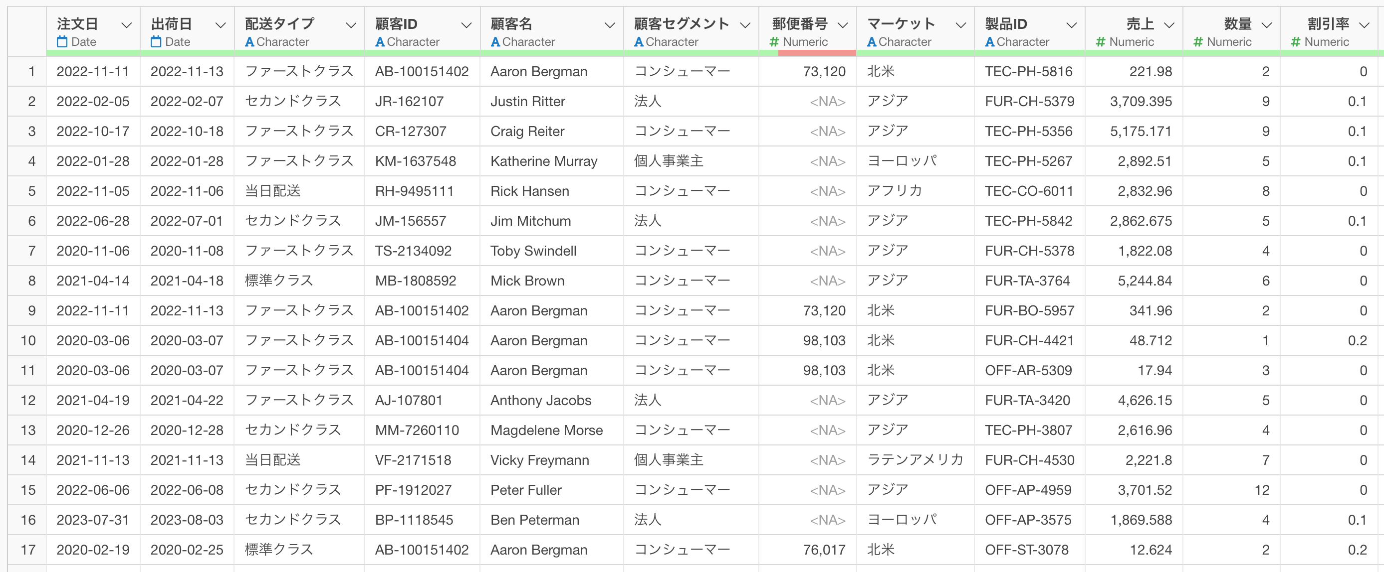 今回は1行が1つの注文を表し、列には注文日や売上などの情報が含まれている注文データを利用します。