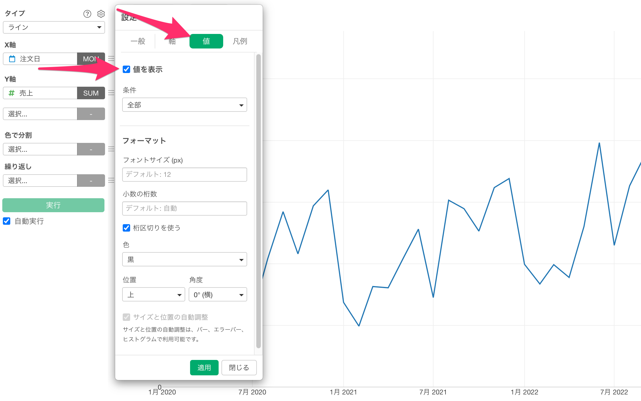 チャートの設定ダイアログが開いたら、タブを「値」に切り替え 、「値を表示」チェックを付けます。