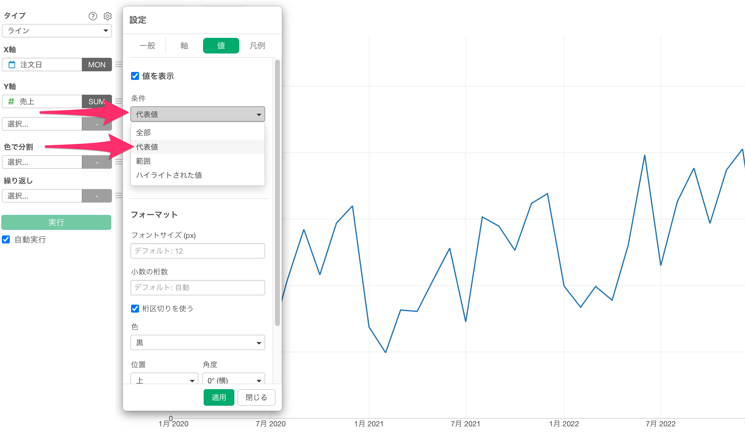 「値を表示」の項目で、条件のドロップダウンをクリックし、オプションメニューから「代表値」を選択します。