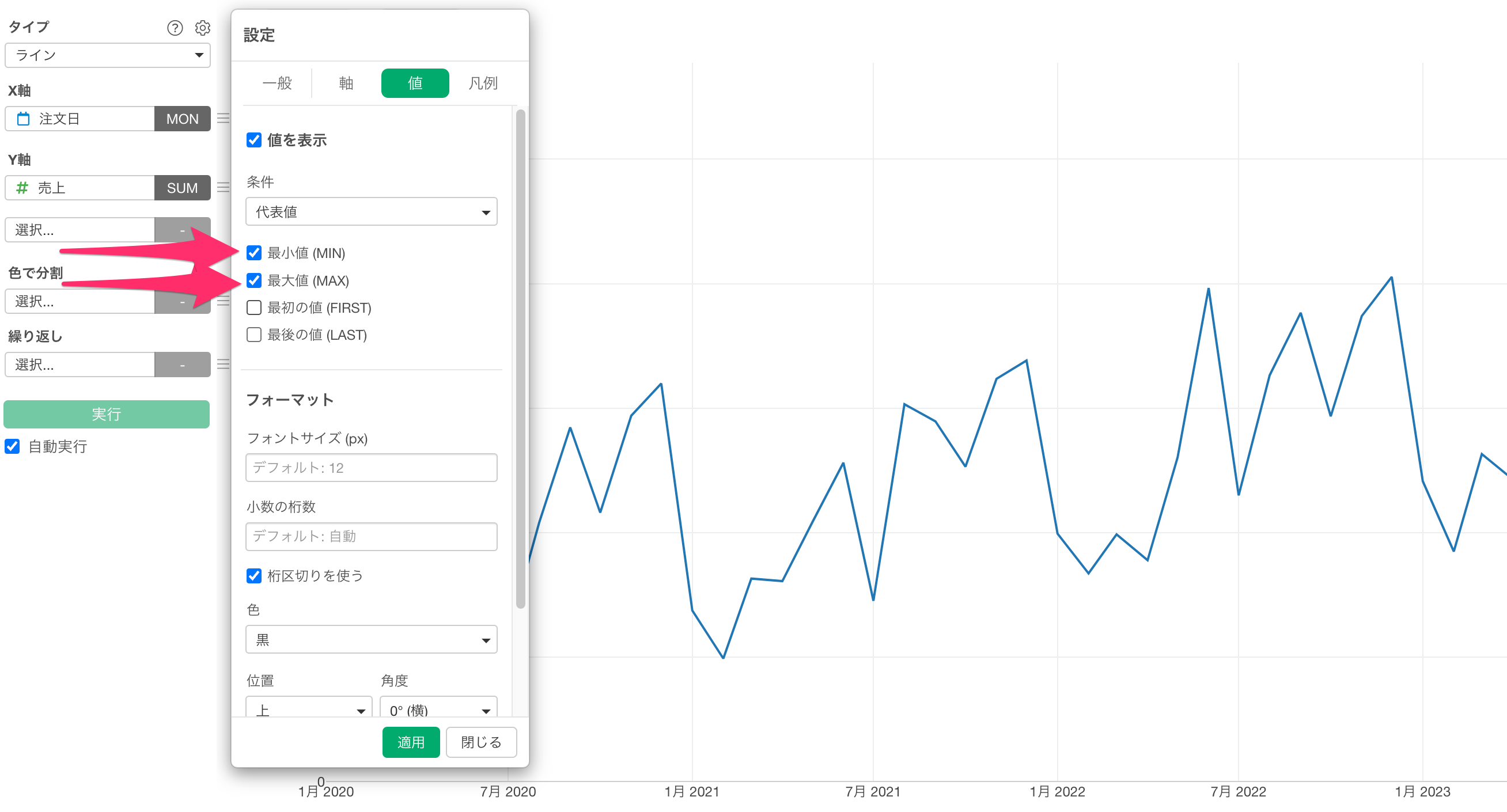 Exploratoryでは、表示する値の条件を指定できる機能があり、代表値として最小値と最大値を選択することで、チャート上にこれらの値のみを表示させることができます。
