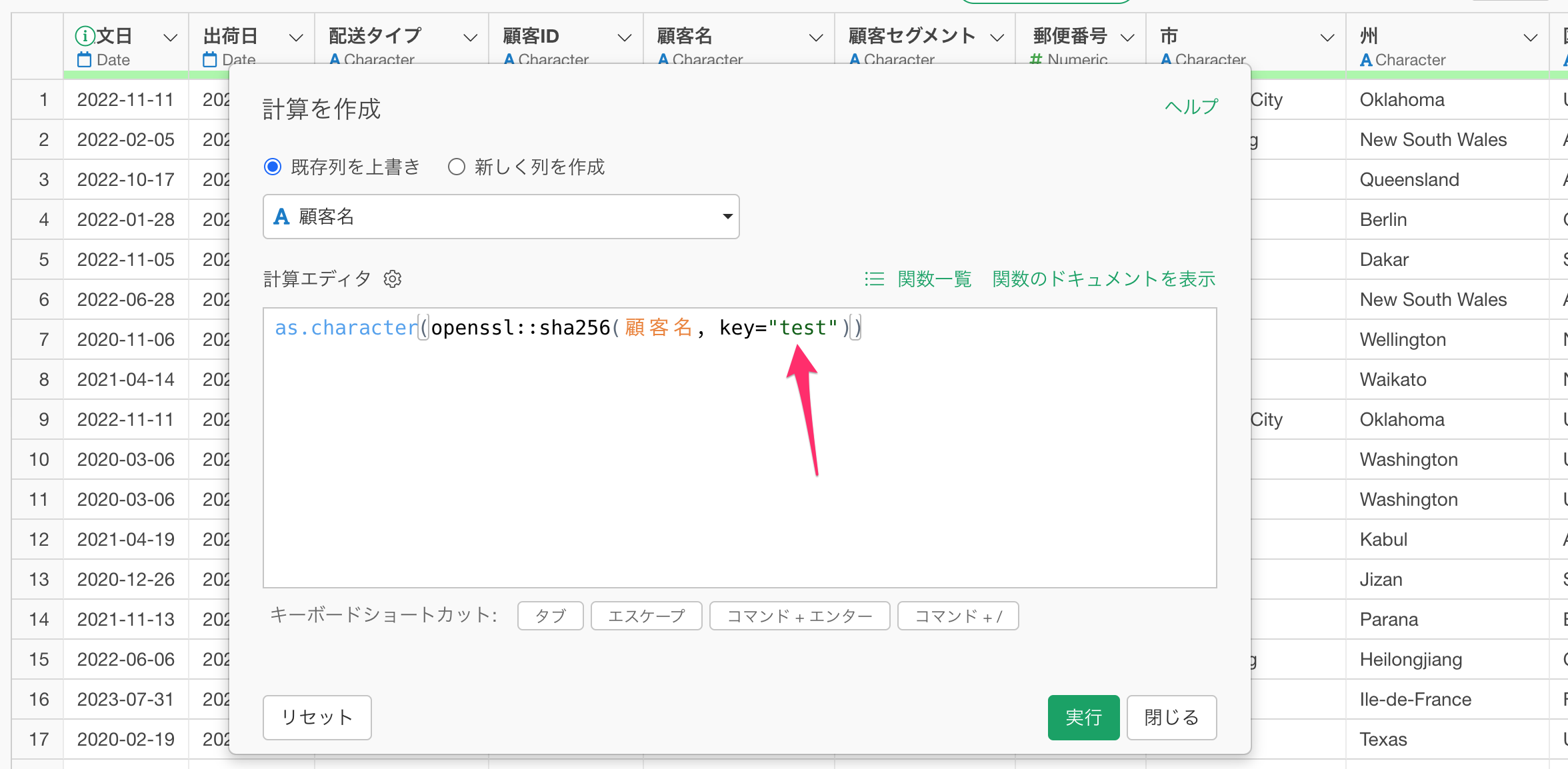 例えば、sha256を使って、顧客名の列を”test”というキーを使ってハッシュ化したい場合、計算を作成のダイアログの中で、as.character(openssl::sha256(顧客名, key="test"))と記述することで対応が可能です。