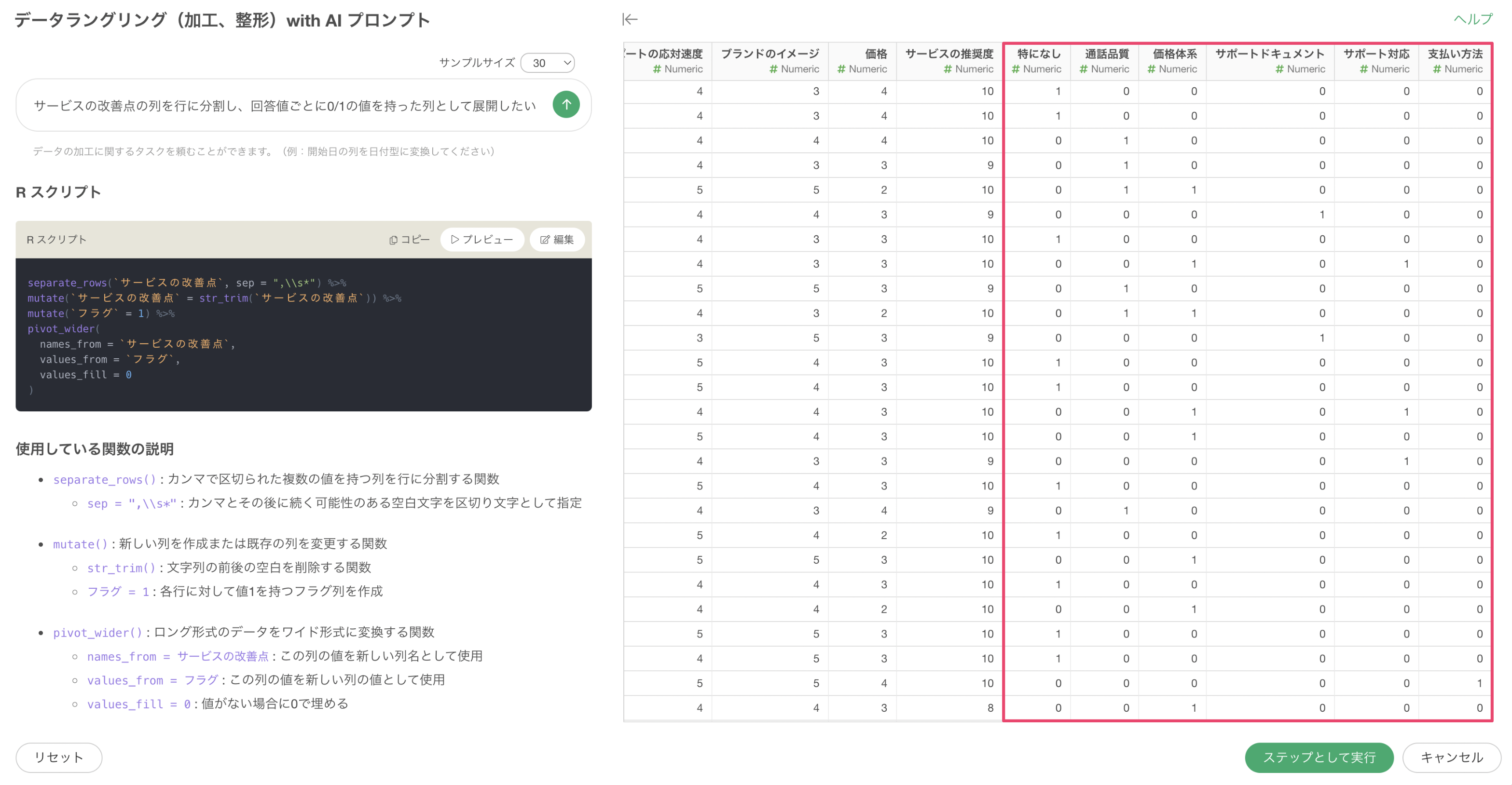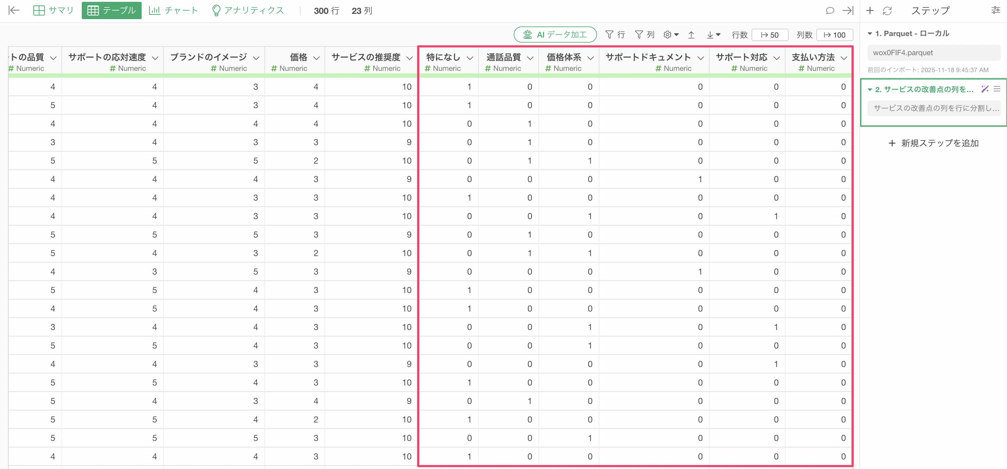 このプロンプトは、「サービスの改善点」列の複数回答をまず行に分割し、次に各回答選択肢を個別の列として展開し、回答の有無を0または1で表現するようAIに指示しています。