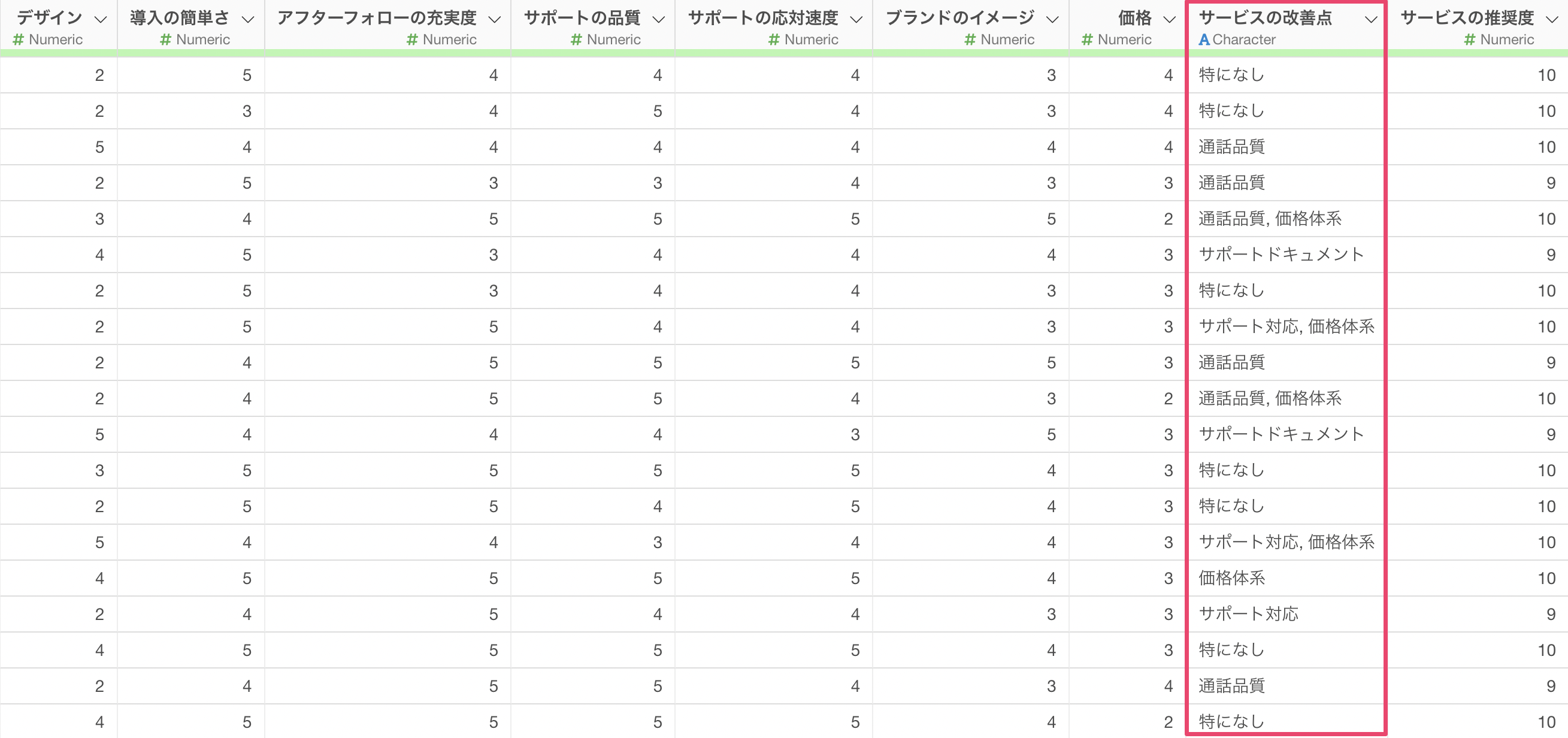 「サービスの改善点」という列には、カンマ区切りで複数の回答が格納されています。