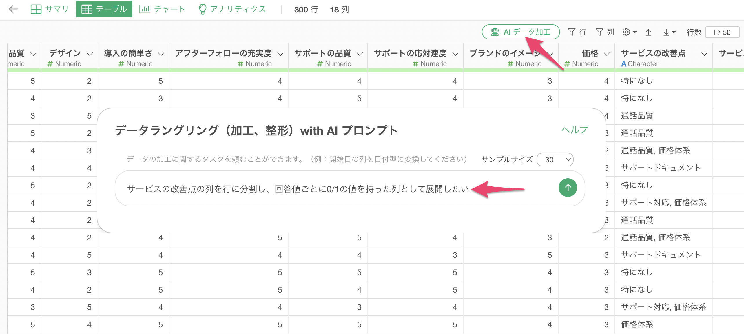 テーブルビューから「AI データ加工」ボタンをクリックします。表示されるプロンプト入力欄に、以下の指示を入力します。