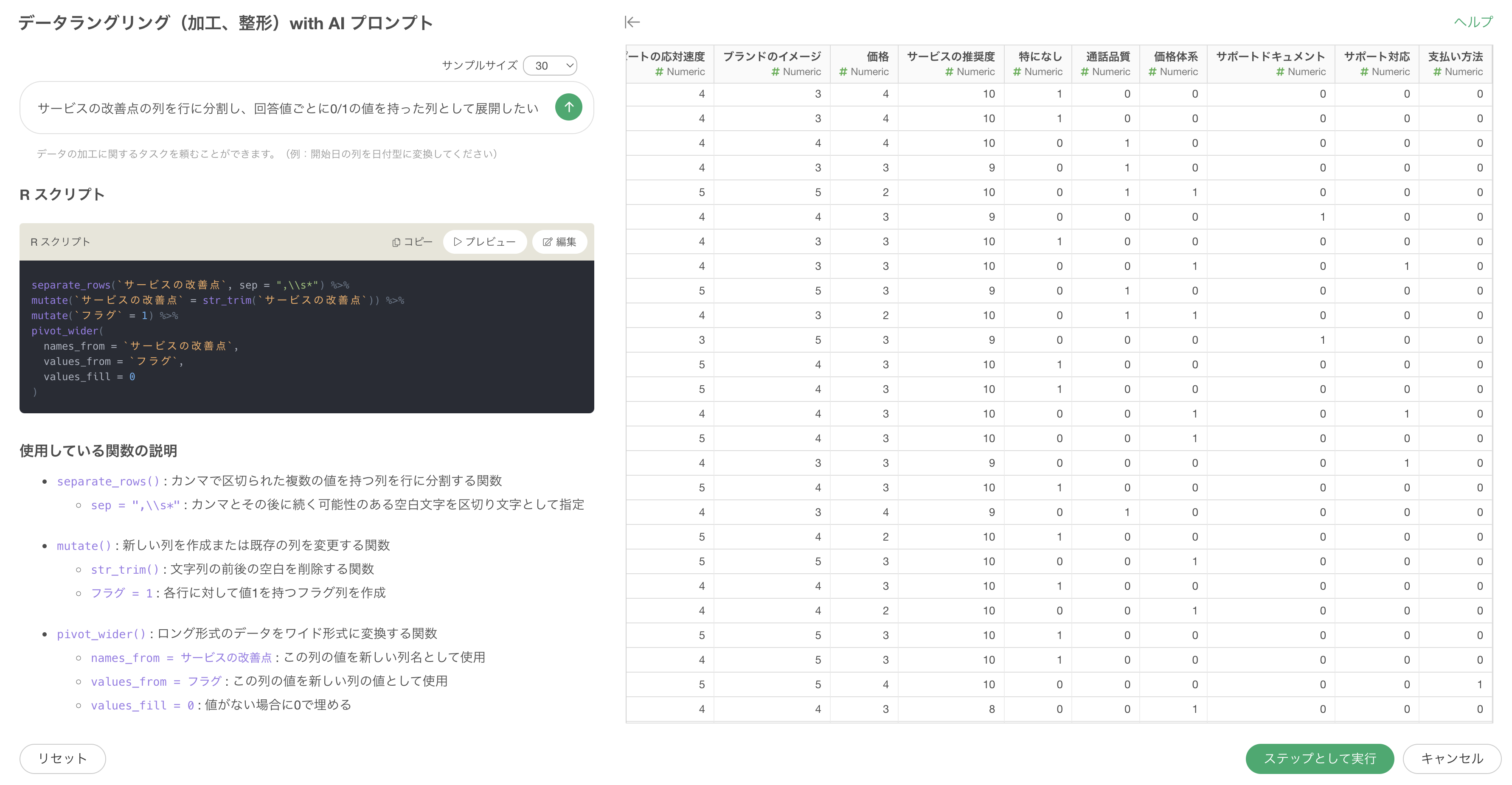 今回は、ExploratoryのAI プロンプトを利用して、複数回答のデータを各選択肢ごとの0/1形式の列に変換する手順を詳細に解説します。この方法により、UI上での複雑な複数ステップの操作を一つのプロンプトで効率的に実行することが可能になります。