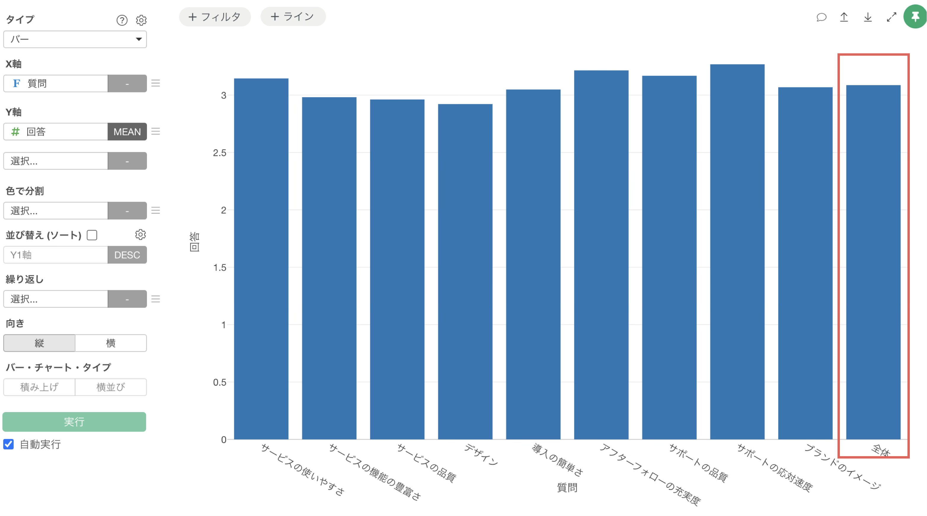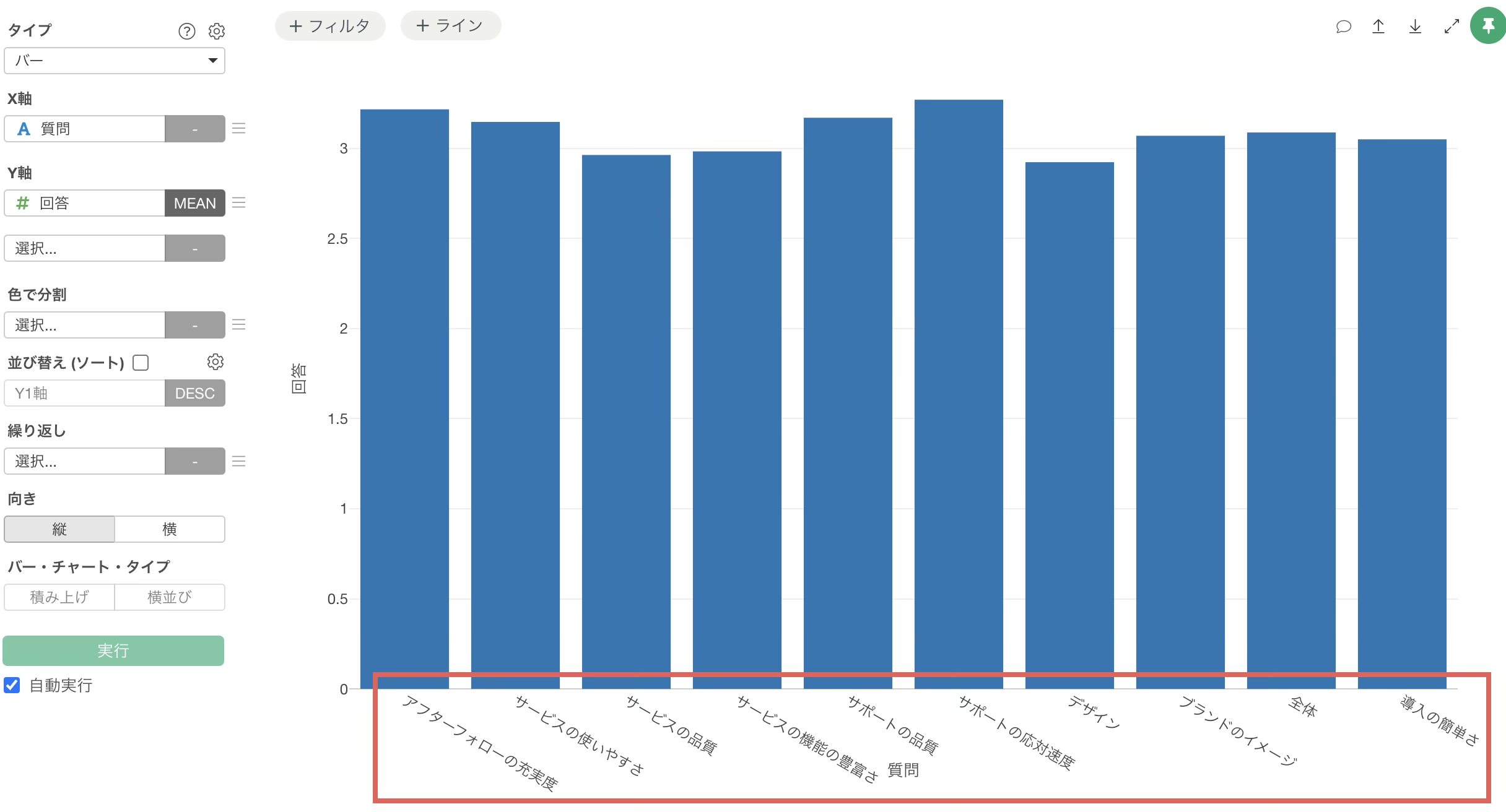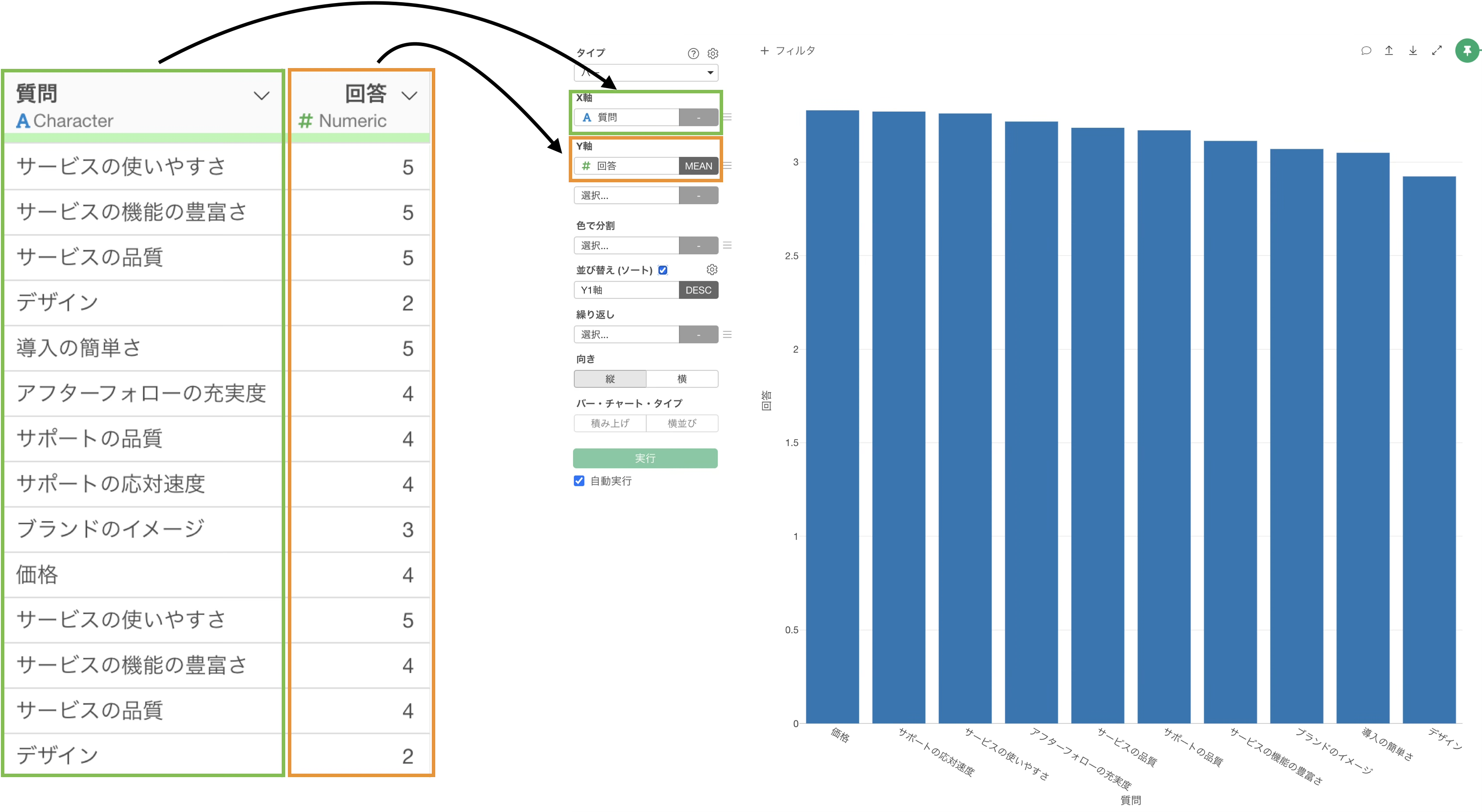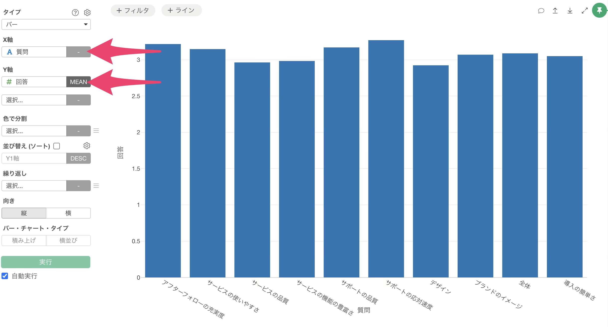 チャートビューに移動し、X軸に設問(質問)、Y軸に回答を選択し、集計関数に「平均値」を選択します。