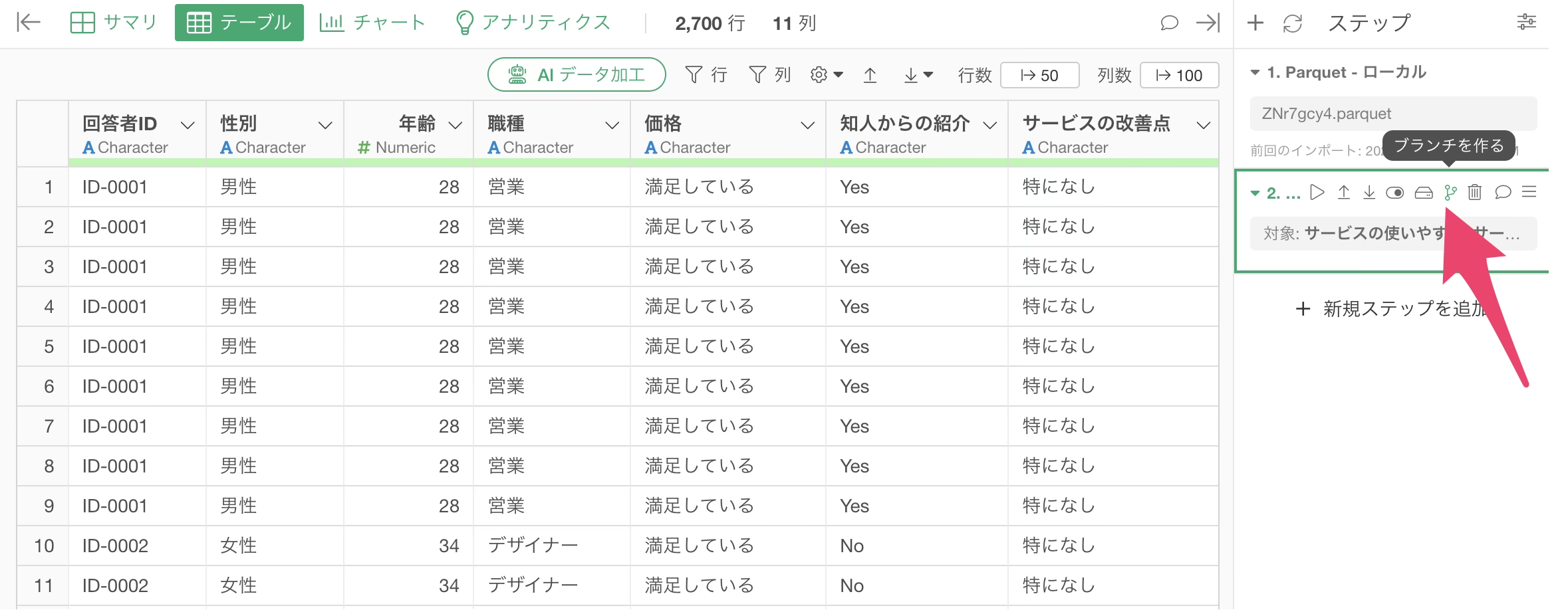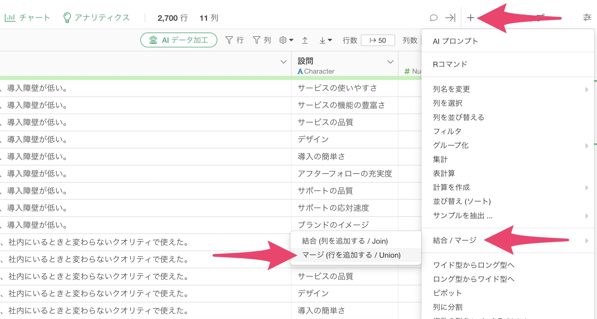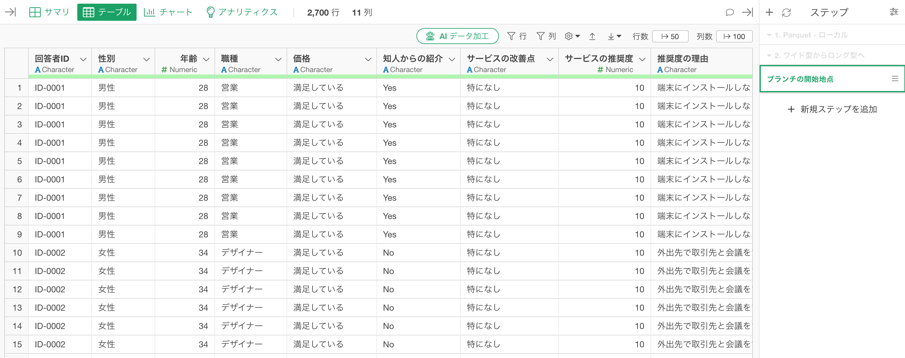 このアプローチを実現するために、データのブランチを作成し、質問列の値を「全体」に置き換えたデータを作成します。その後、元のデータとマージ(縦方向に結合)することで、個別の質問項目と全体の両方を含むデータセットを作成します。