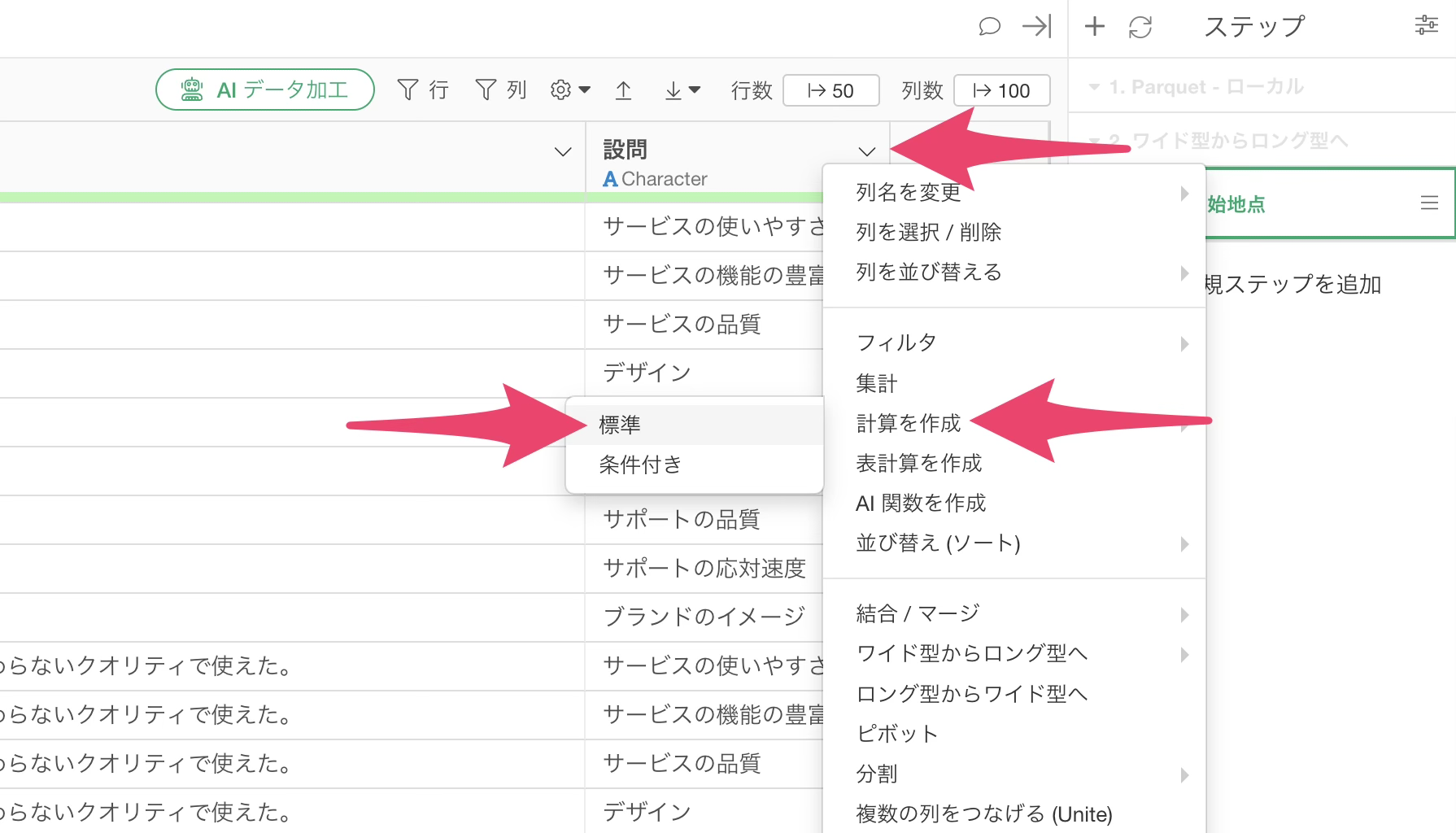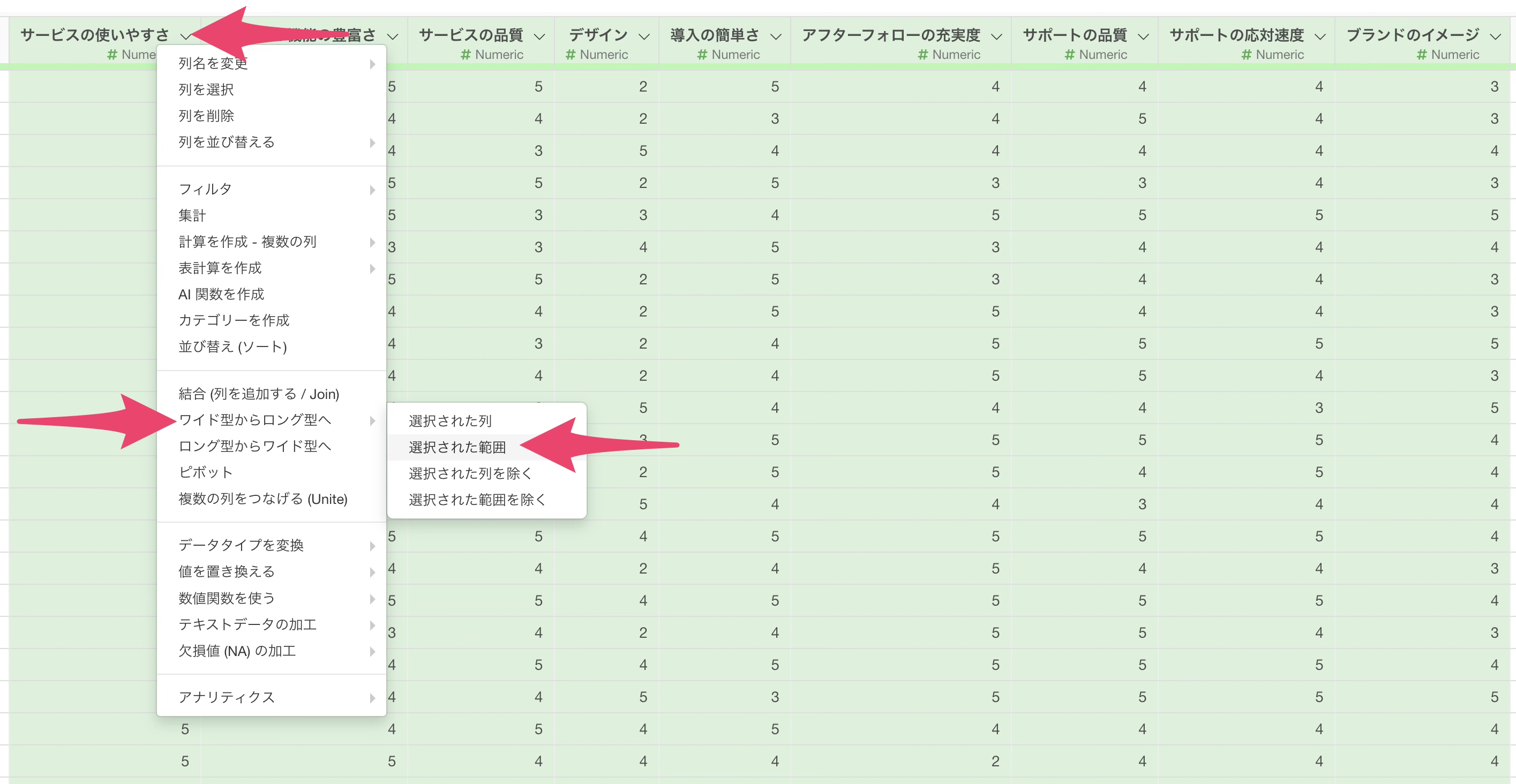 選択した列のヘッダーメニューから「ワイド型からロング型へ」を選択し、サブメニューで「選択された範囲」を選択します。