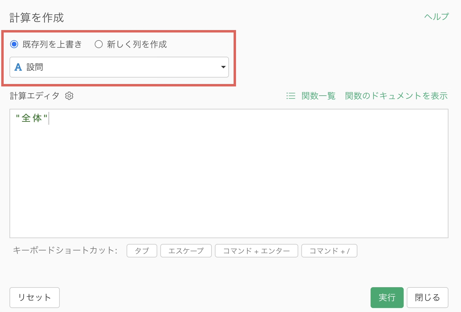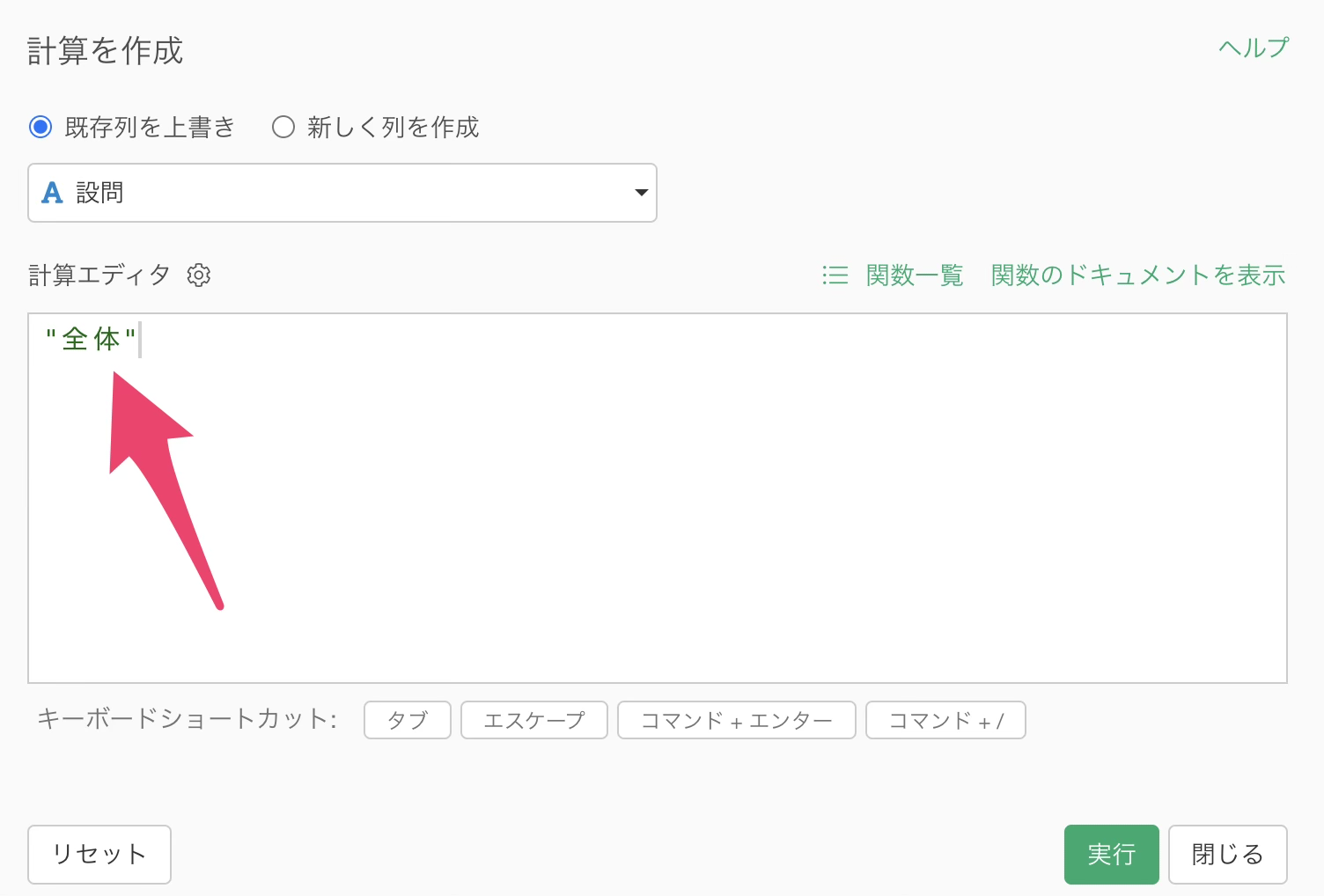 計算エディターのダイアログが開いたら、ダブルクォーテーションで囲って「全体」と入力します。