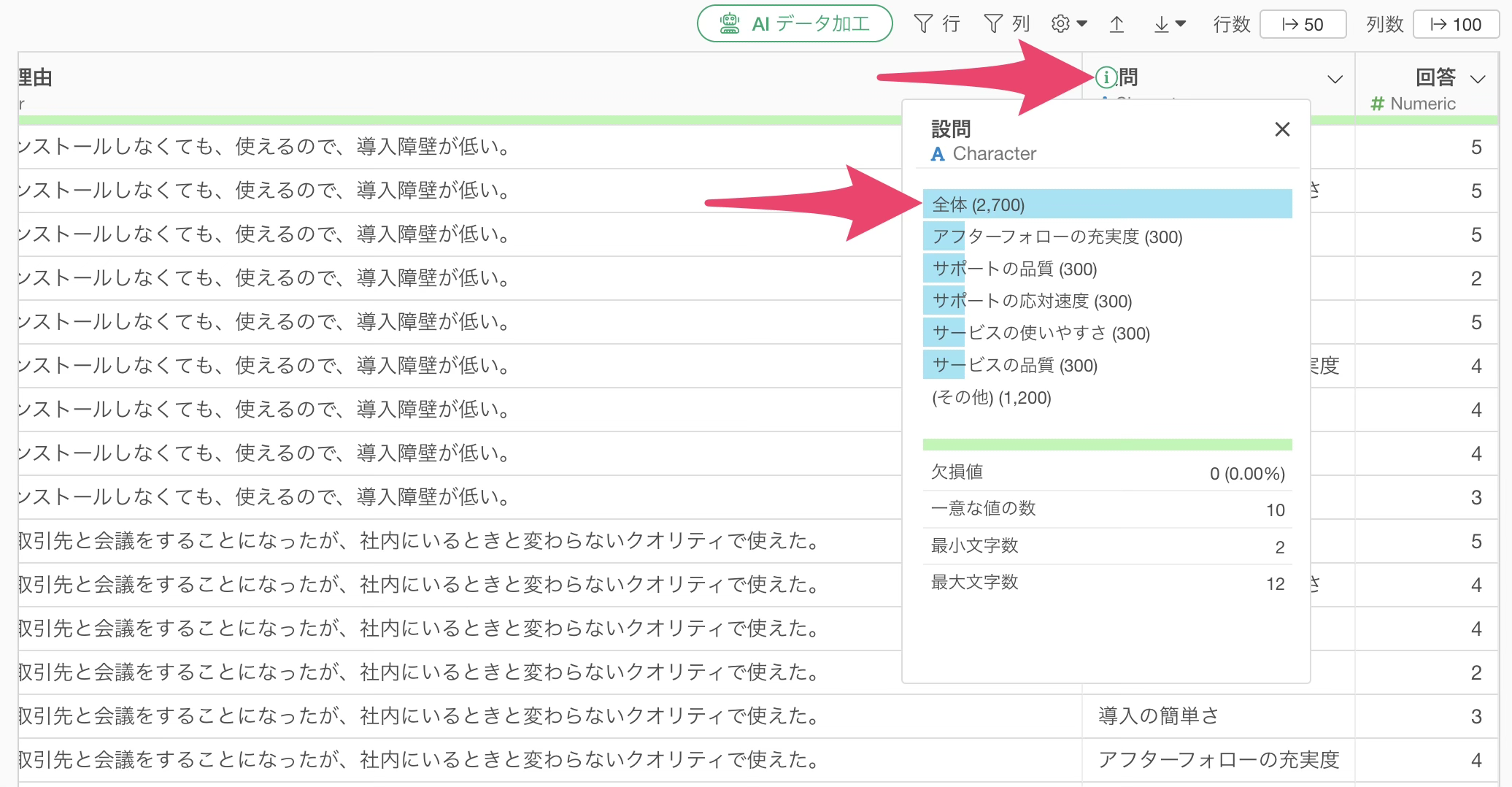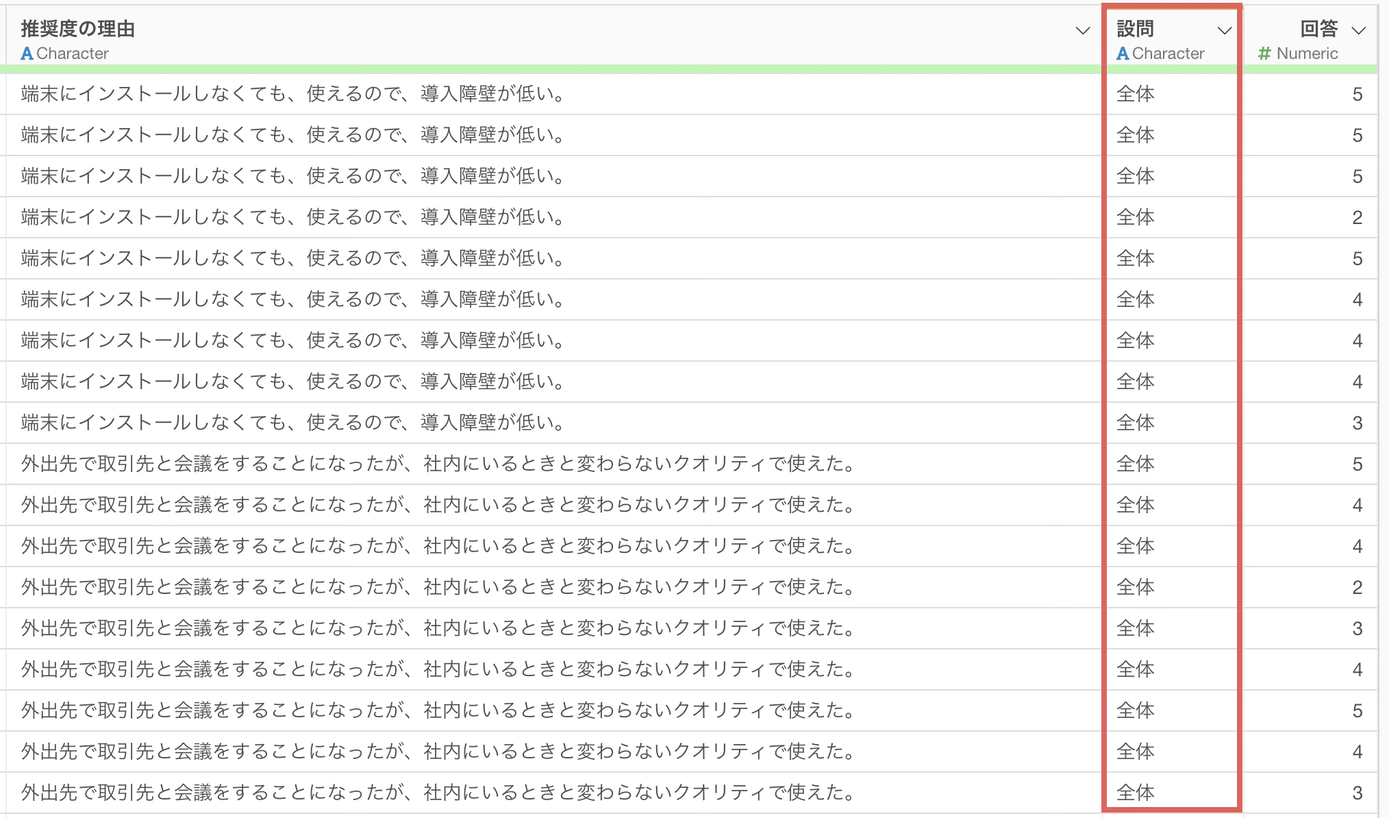 これで元々のデータ行数が2倍になり、質問列のサマリー情報を確認すると「全体」のカテゴリーが追加されていることが確認できました。