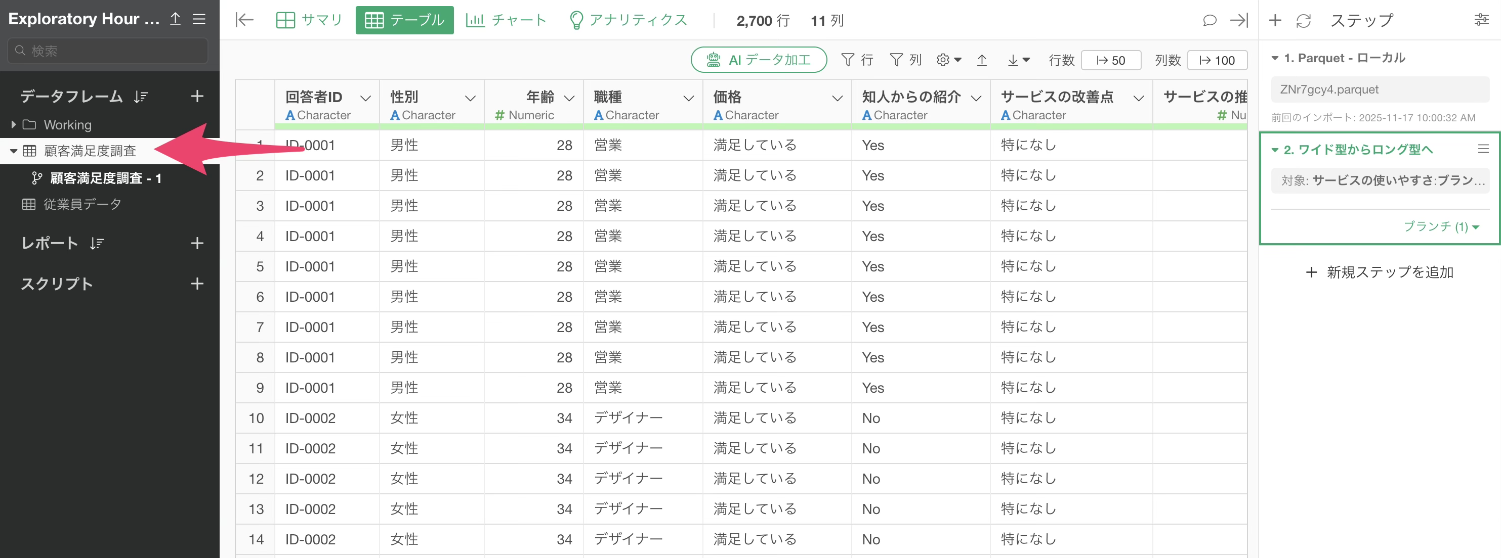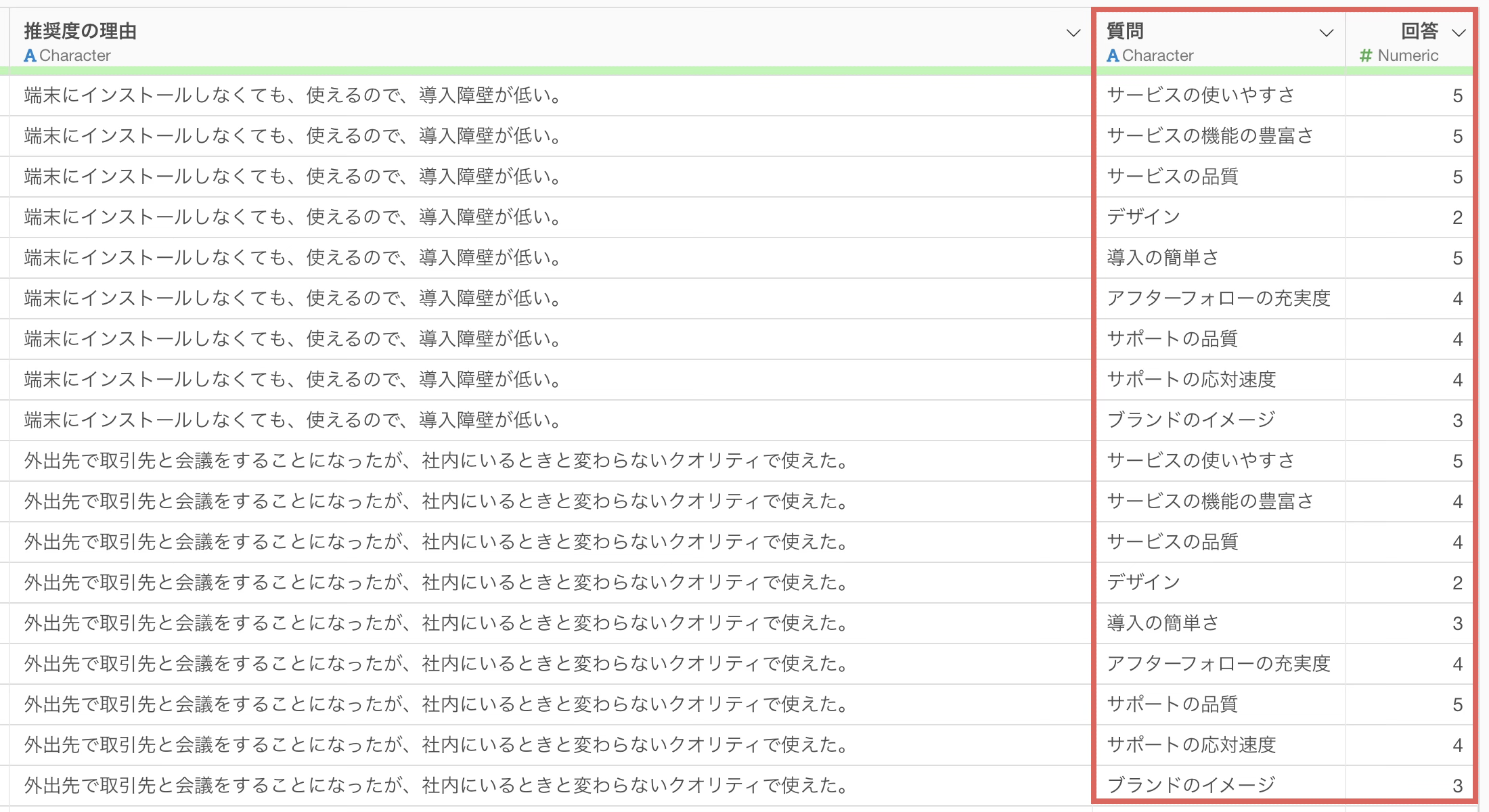 これでデータがロング型に変換され、質問と回答の2列にそれぞれ情報がまとまりました。