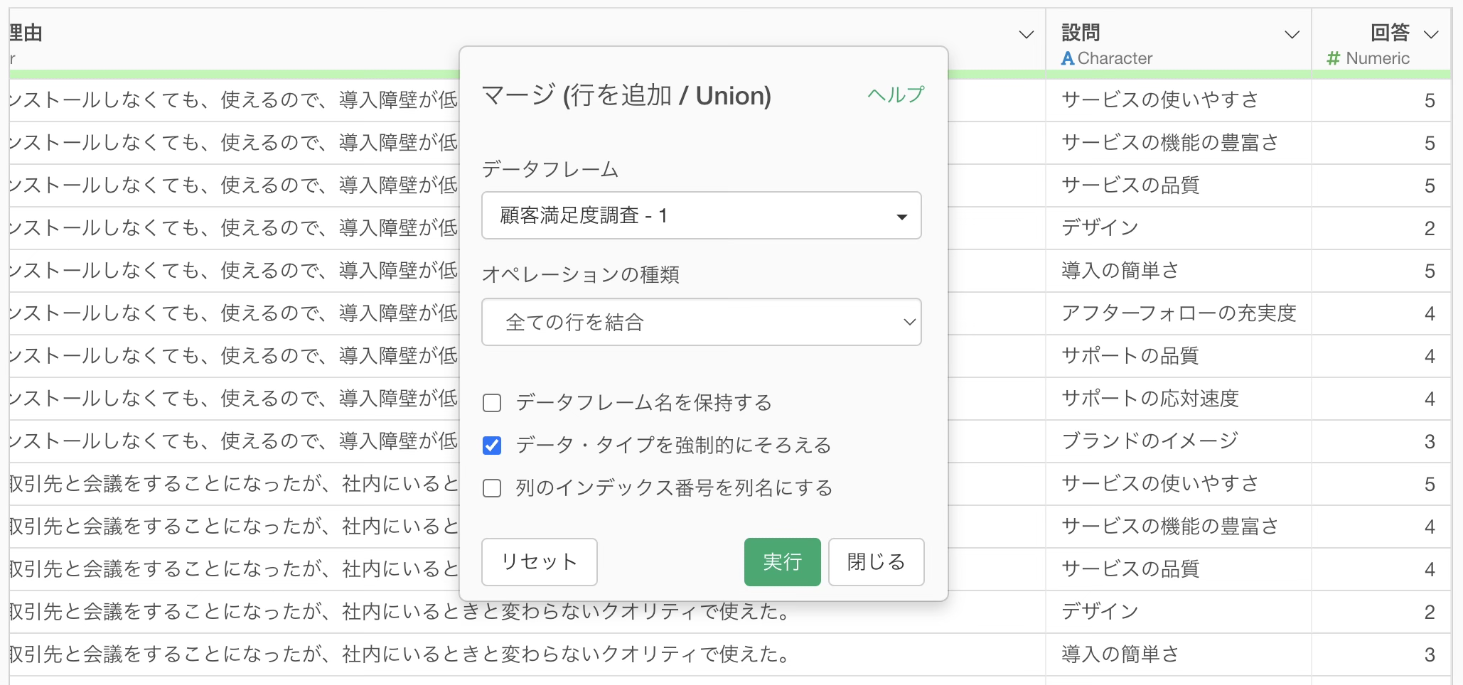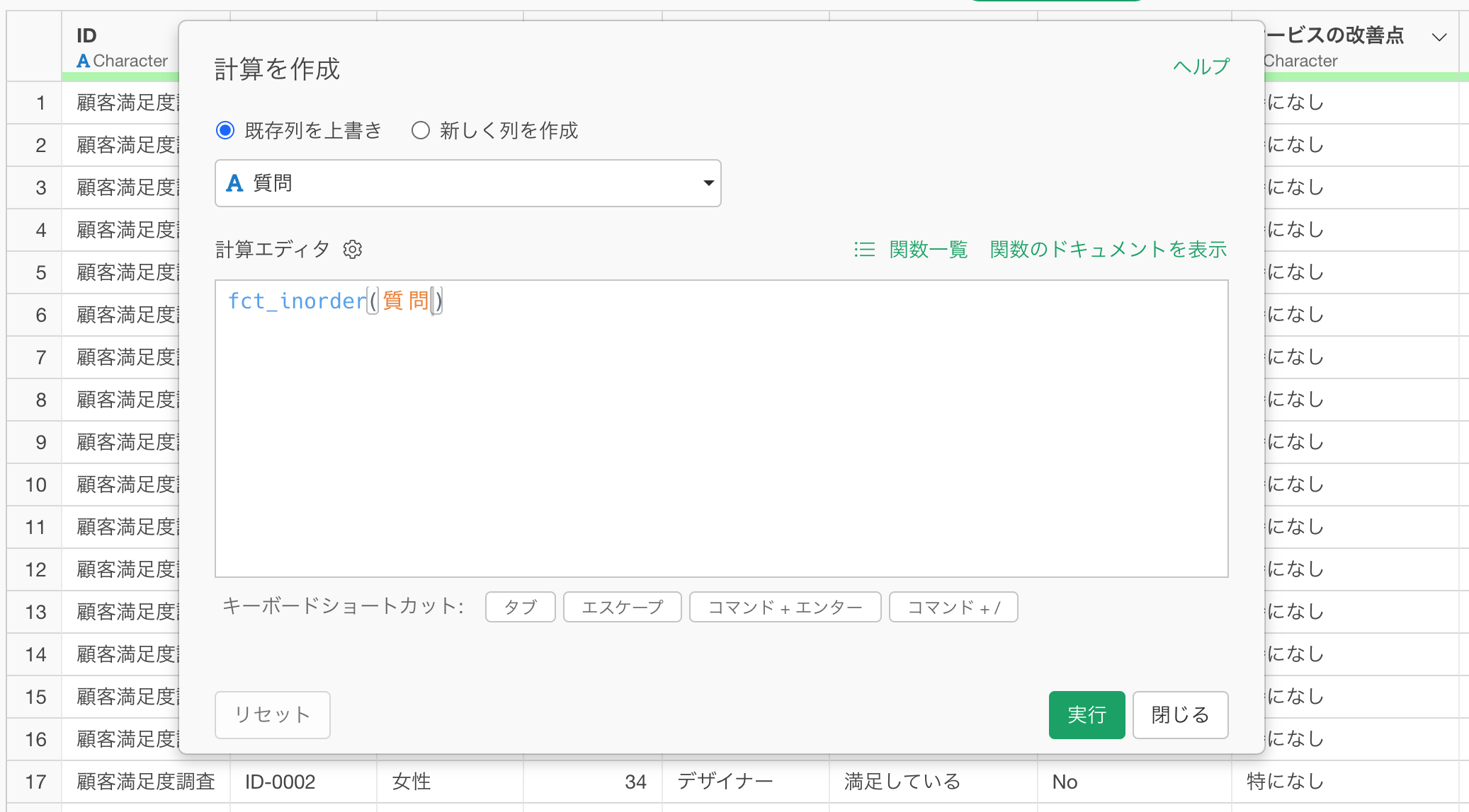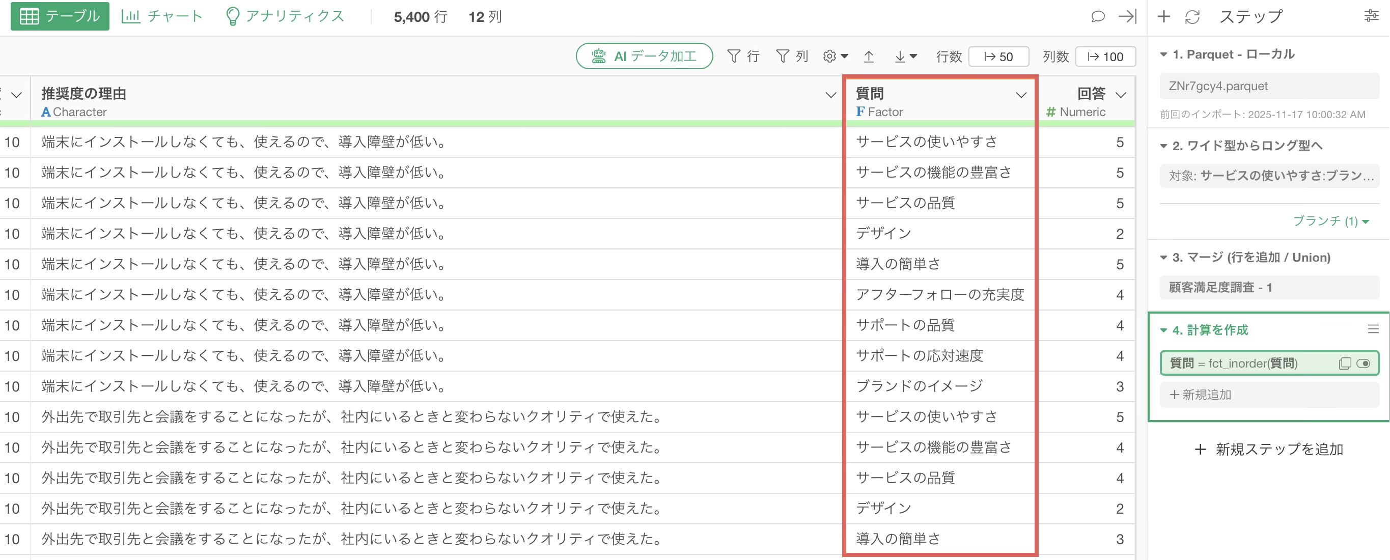 これでデータに順序を設定するためのステップが追加され、質問列が元々の文字列型からファクター型(順序付きカテゴリー)に変換されました。