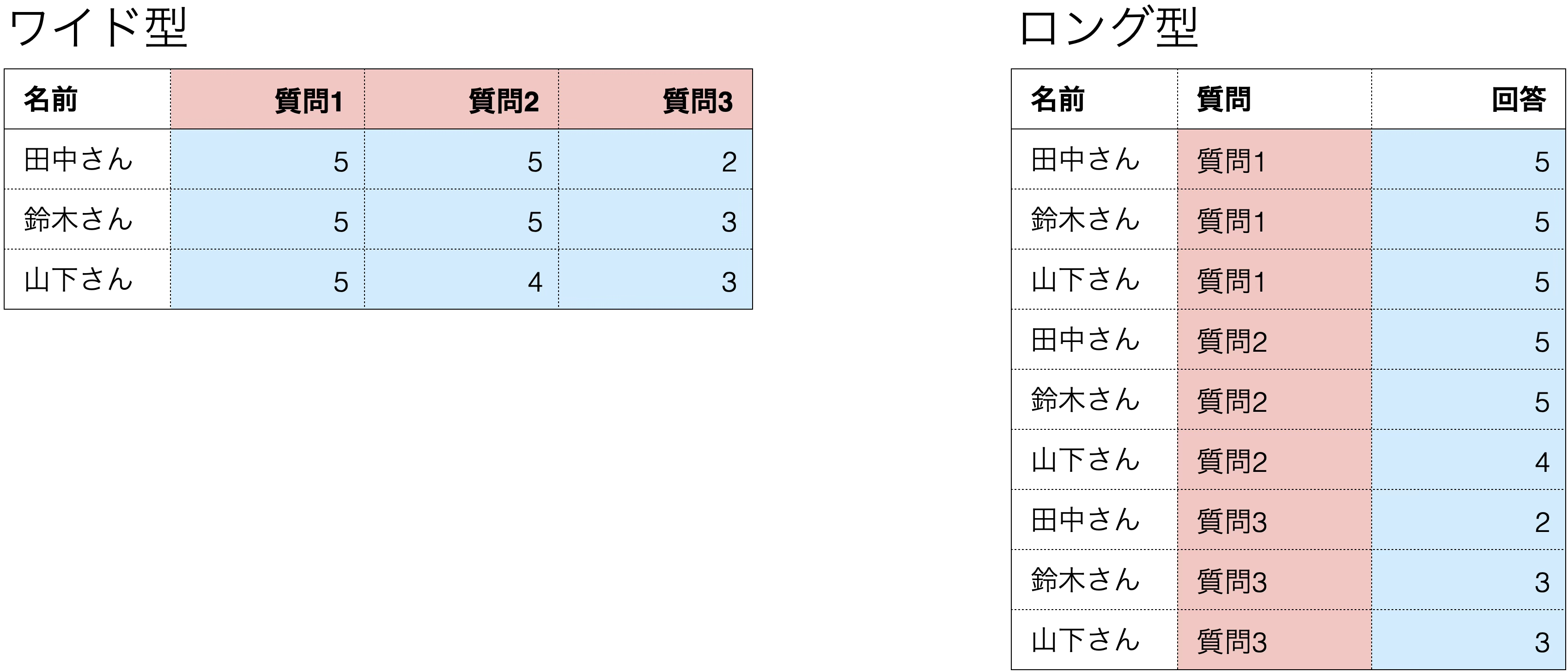 アンケートデータには、ワイド型とロング型という2つの代表的なデータ形式があります。