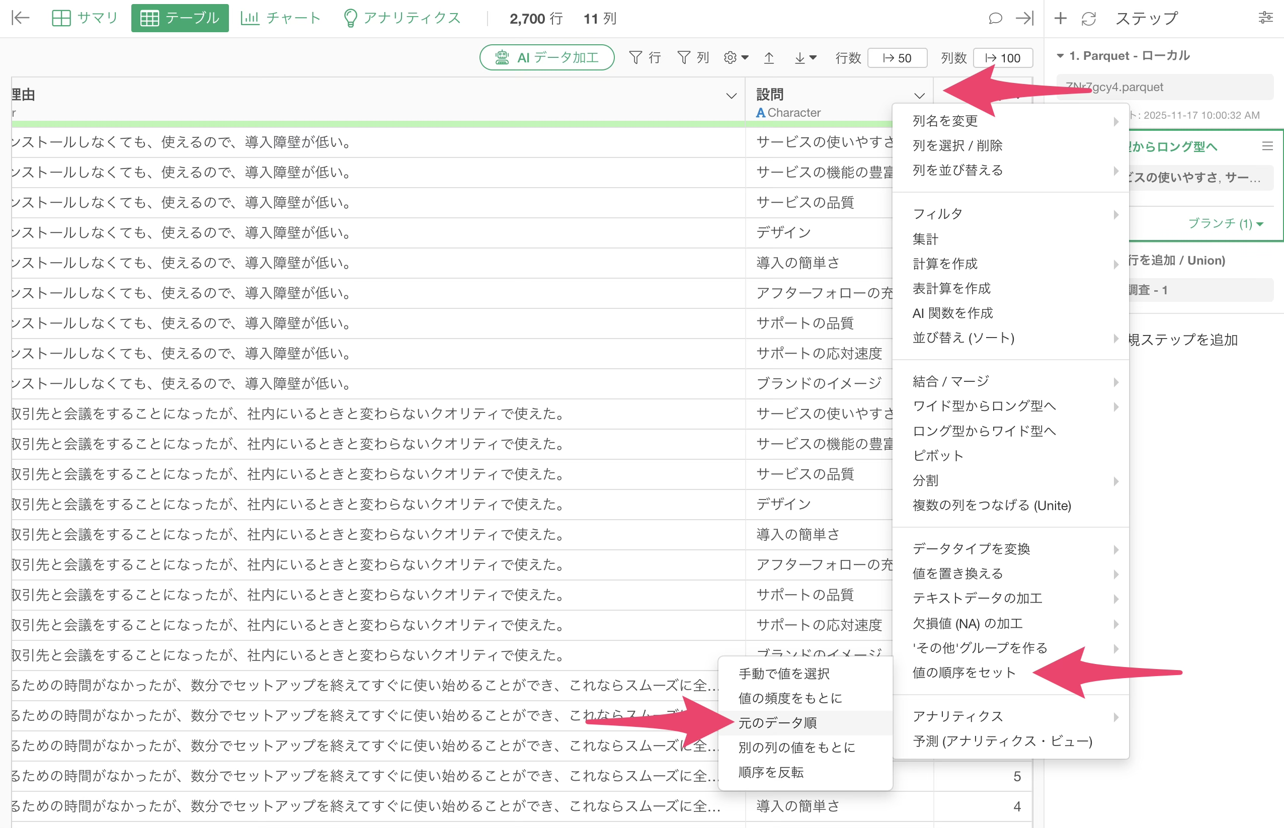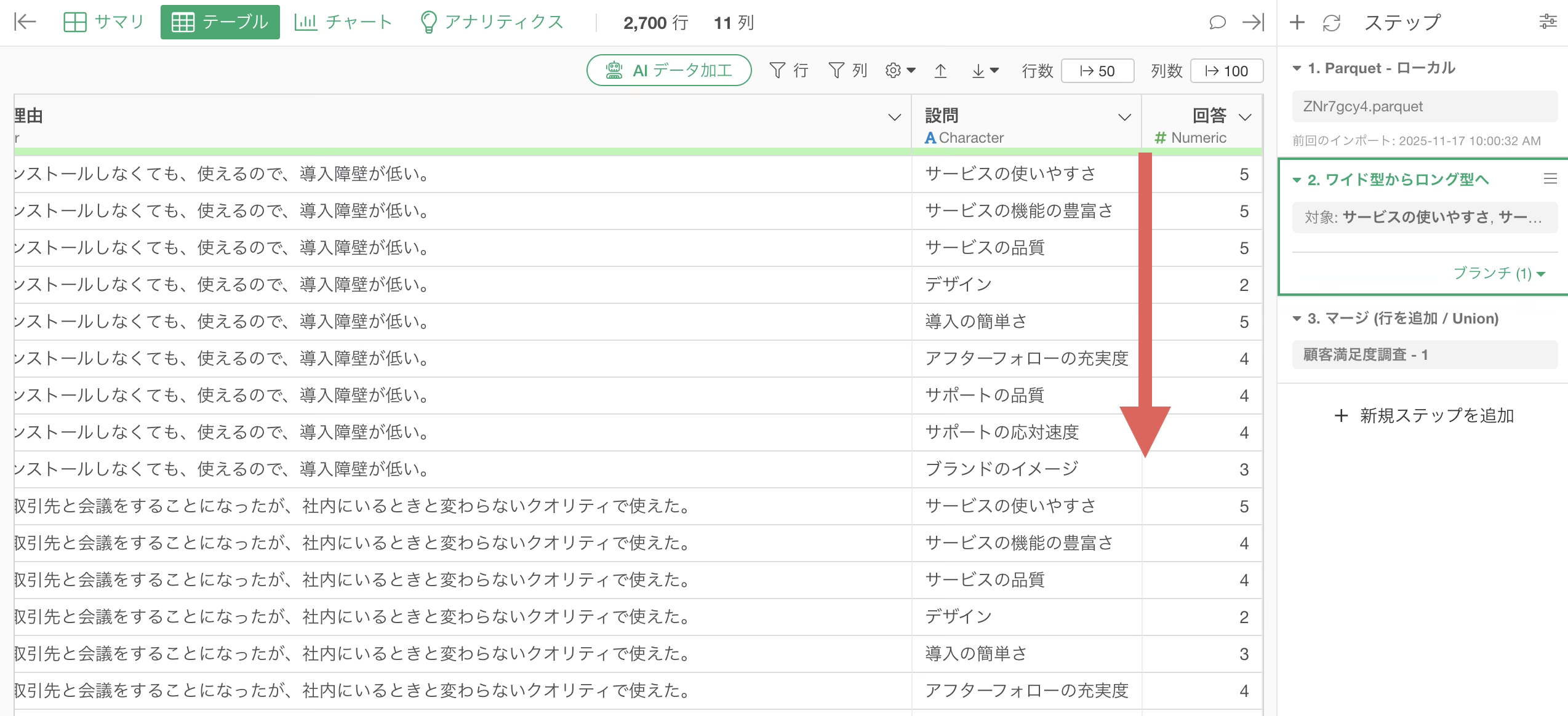 なお、ワイド型からロング型に変換すると、元の列の並び順をもとに質問の並びが形成されます。そのため、質問列を上から見ていった時に登場する順序で値の順序を設定すれば、元の並び順を保ちながら最後に全体を配置できます。