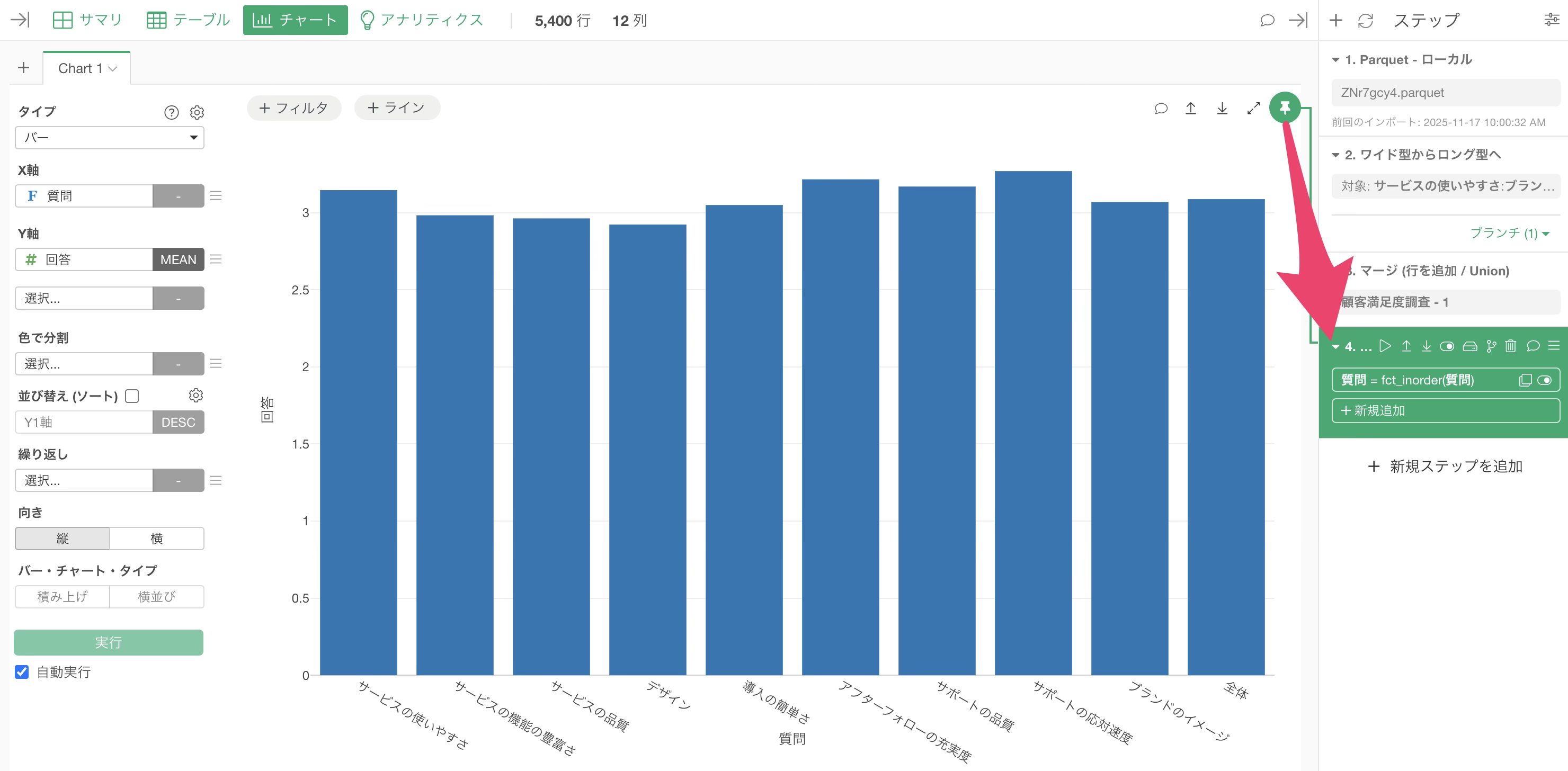 Exploratoryでは、ブランチとマージ機能を活用することで、各アンケート項目の平均スコアと全体の平均スコアを1つのチャートに表示することができます。これにより、個別項目の評価と全体傾向を同時に把握でき、より包括的なデータ分析が可能になります。