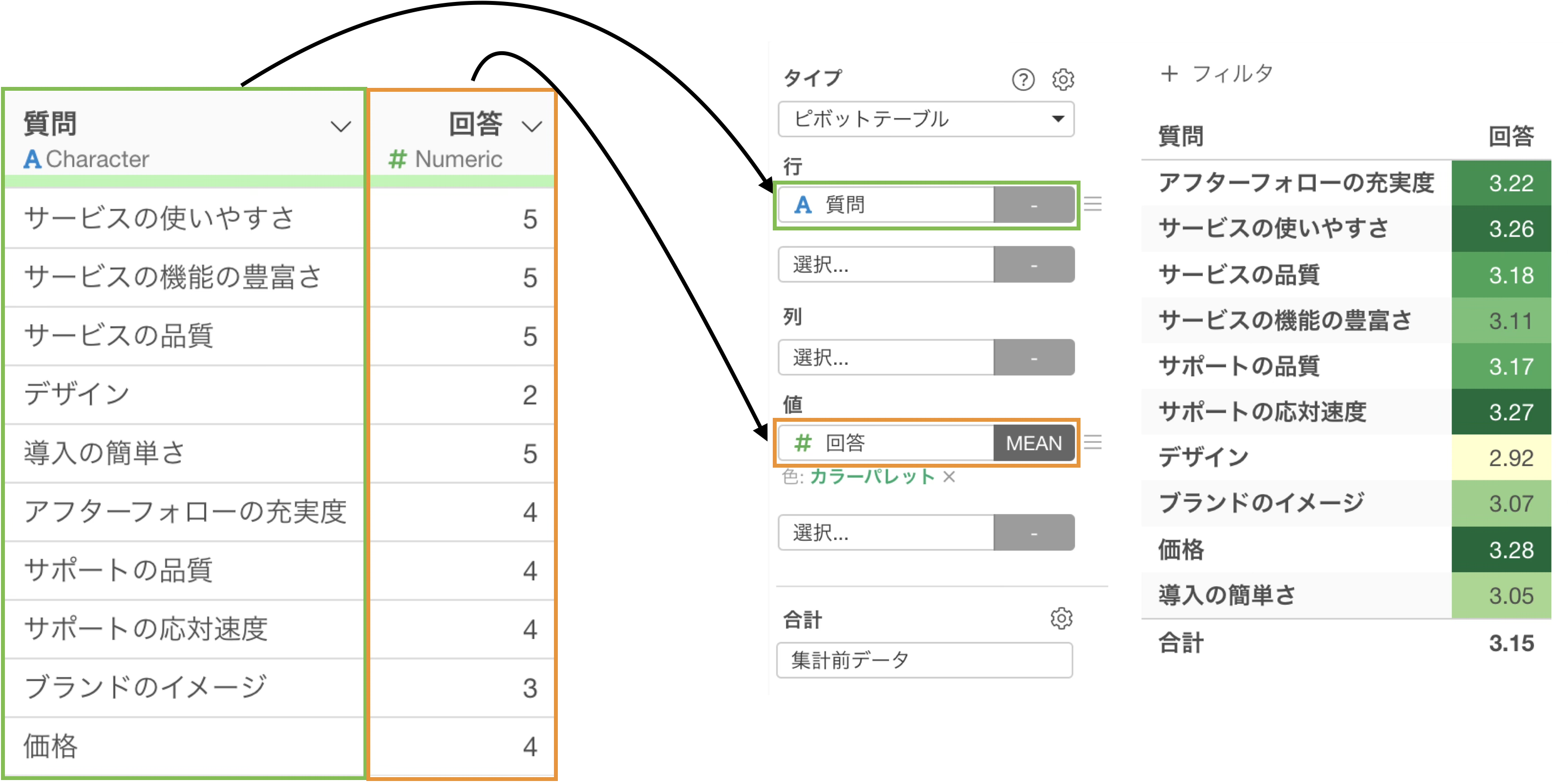 なぜなら、ピボットテーブルで集計する際に、行に質問列を選択し、値に回答を選んで平均を指定するだけで、各質問ごとの平均が計算されるからです。