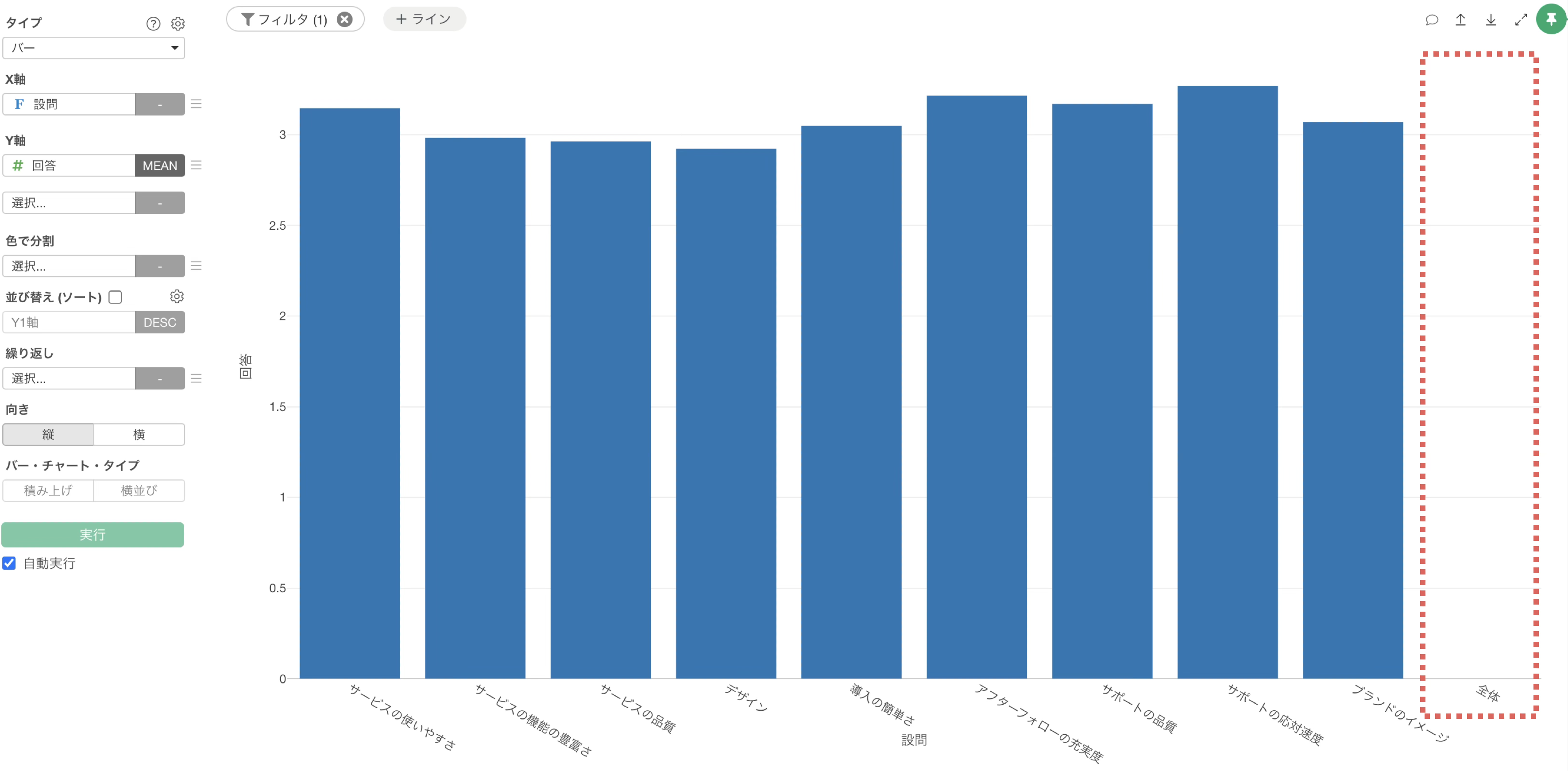 しかし、今回の課題は、バーチャートで各質問の平均スコアを表示した時に、全体の平均スコアもバーとして追加したいというものです。