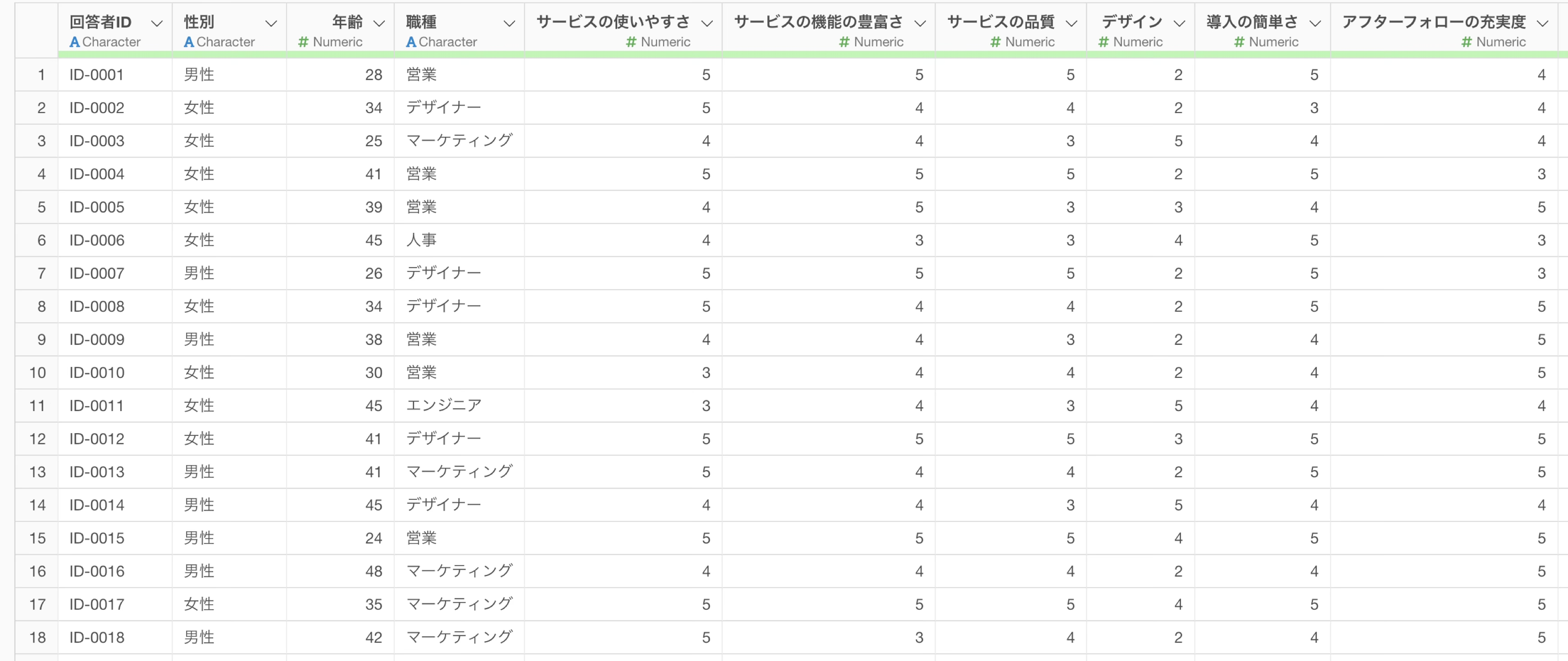 今回は1行が1人のアンケート回答者を表し、列には属性情報や各アンケート質問項目の評価値(5段階評価など)が含まれているデータを利用します。
