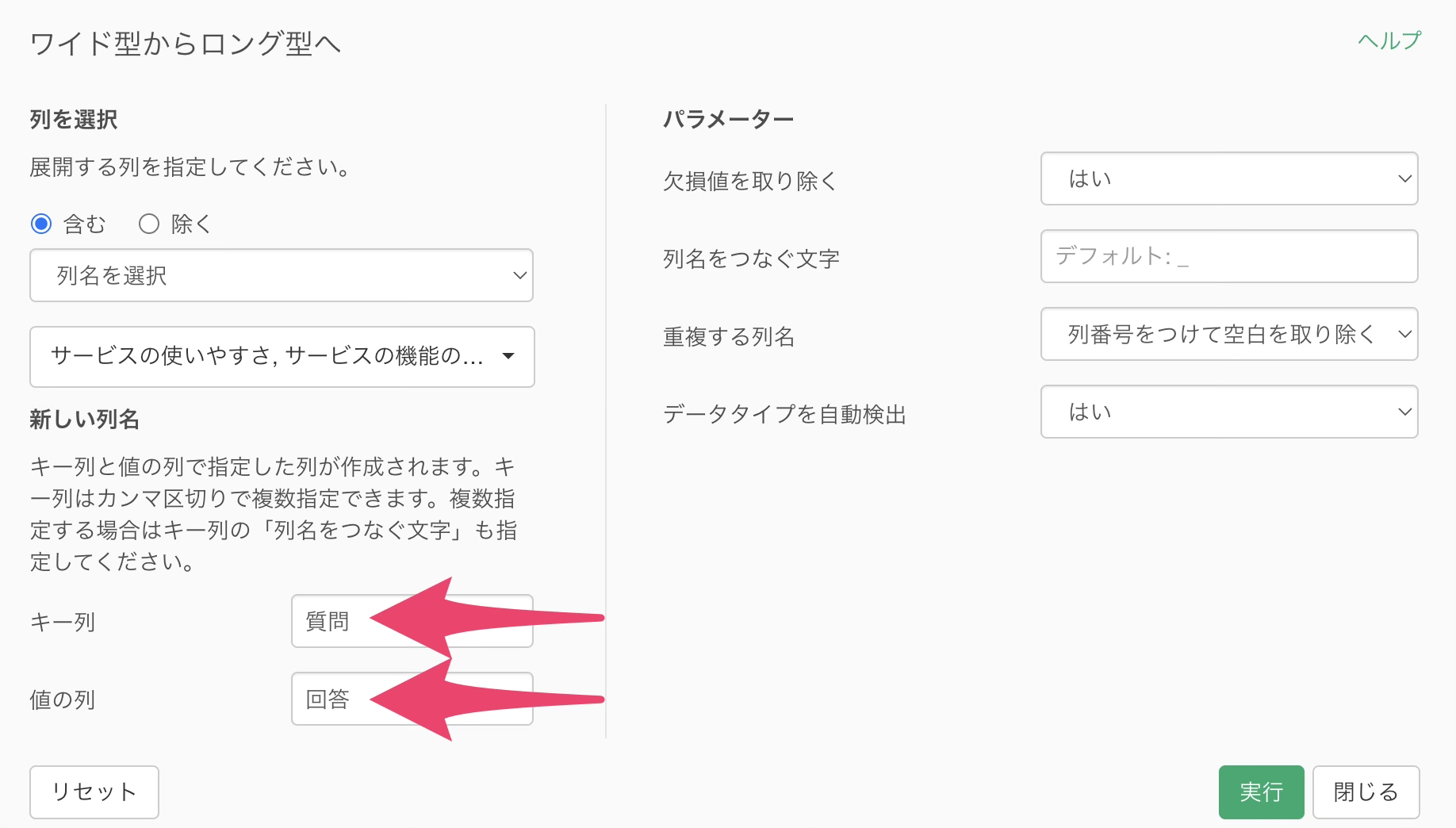 ワイド型からロング型への変換ダイアログが開いたら、キーに「質問」と入力し、値に「回答」と入力し、実行ボタンをクリックします。