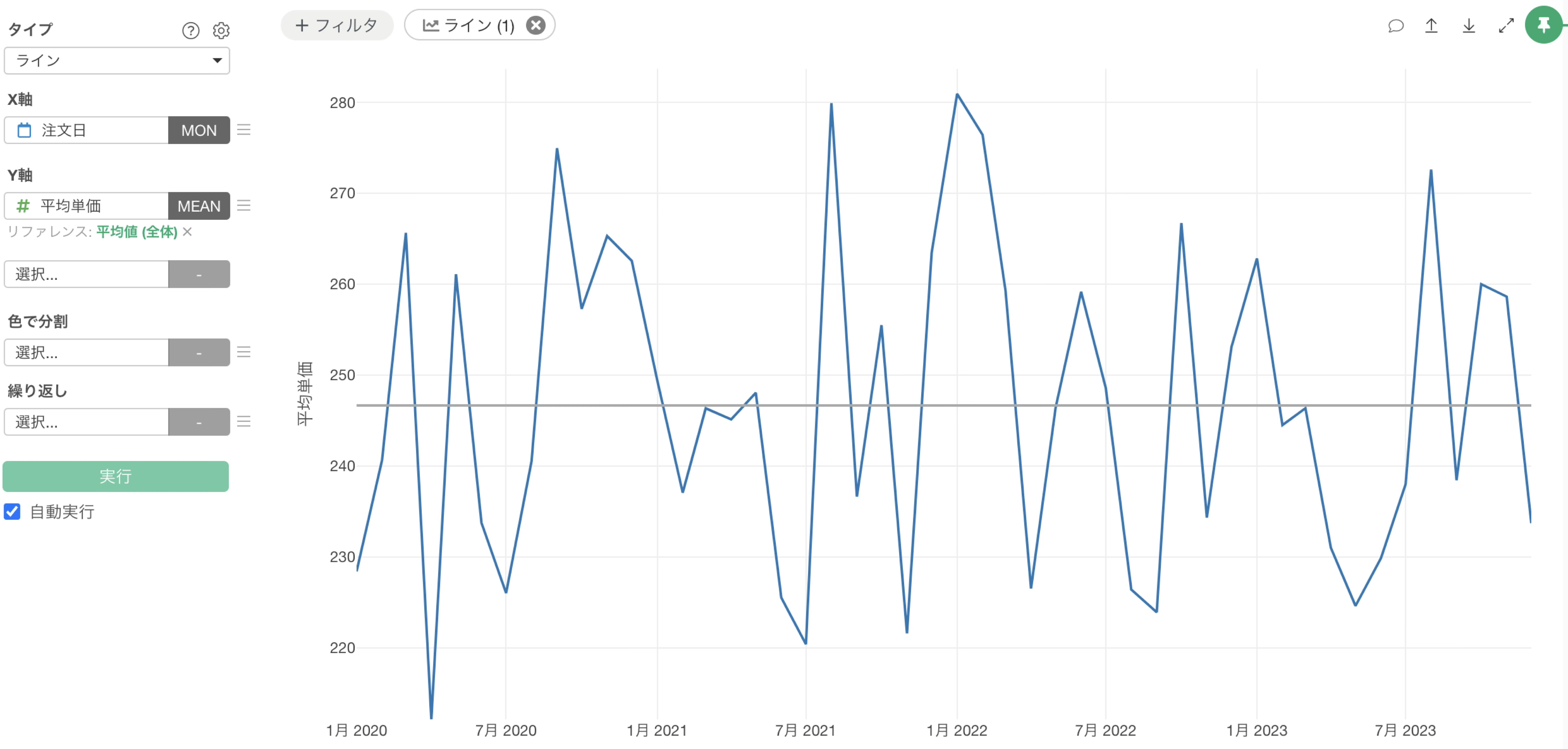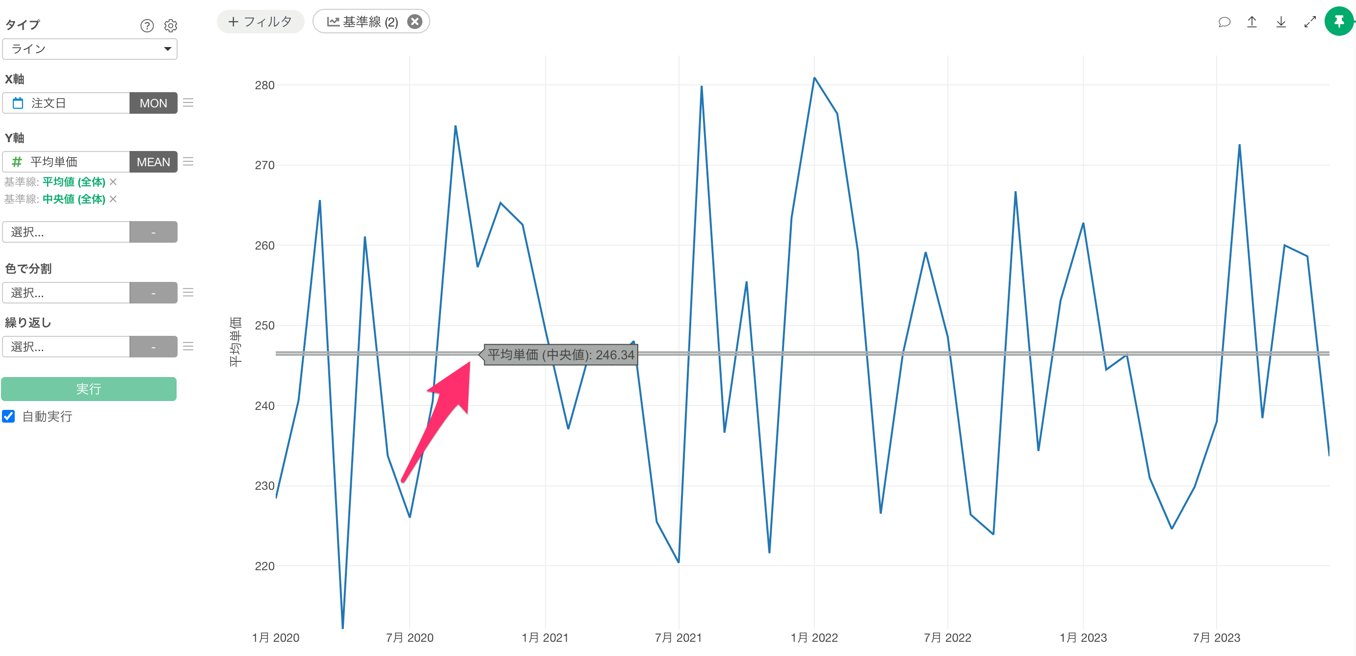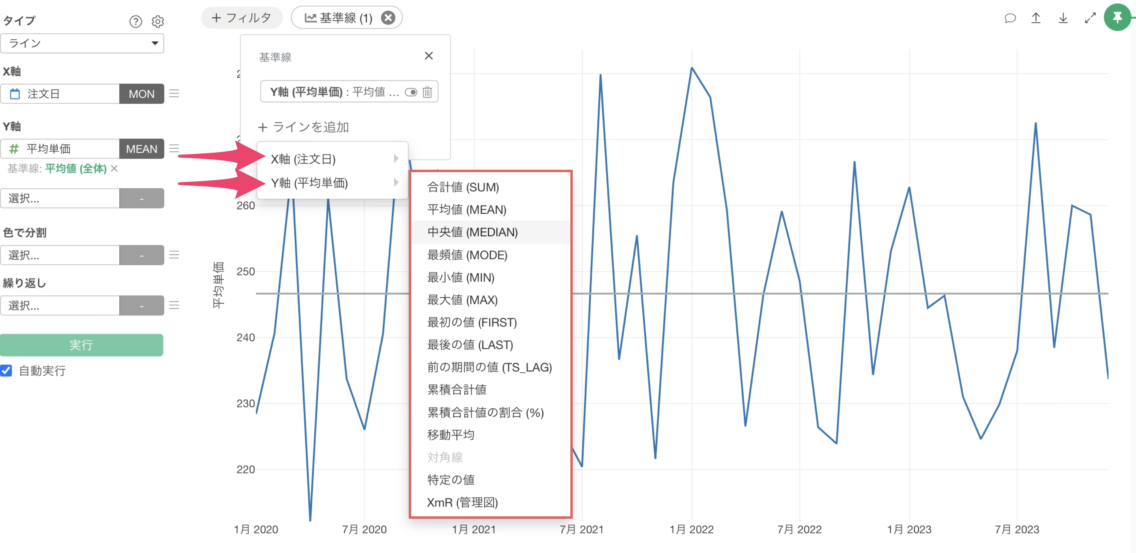 チャートにおける基準線(リファレンスライン)は、特定の基準値や目標値を視覚的に示すことで、データの傾向をより明確に理解するための重要なツールです。バージョン14からは、1つの指標に対して複数の基準線を設定できるようになり、より柔軟な可視化が可能になりました。
