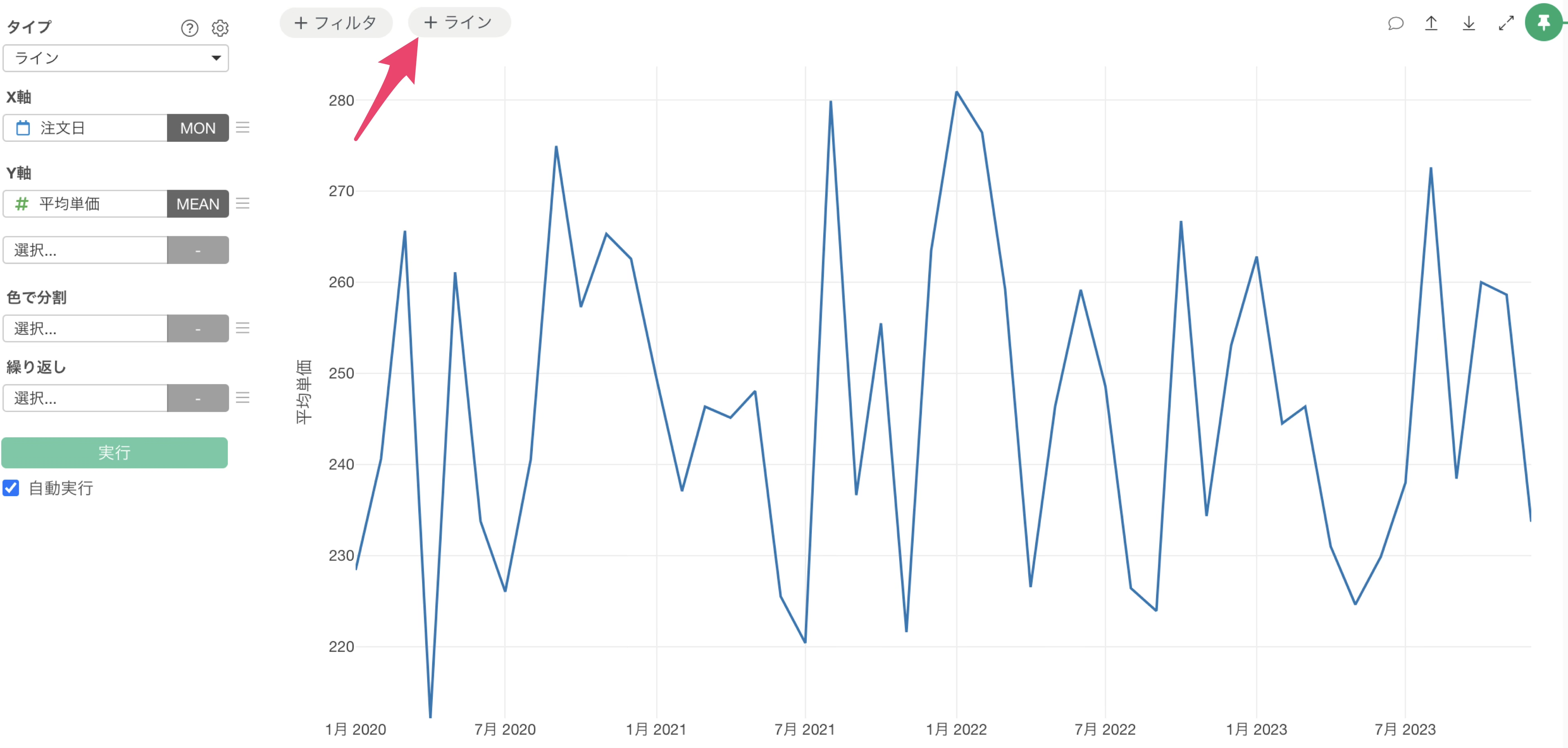 バージョン14から、1つの指標に対して複数の基準線を設定できるようになりました。画面上部の「ライン(基準線)」のボタンから簡単にアクセスでき、平均値や特定の値、前年比較など、様々な基準線を組み合わせて表示することが可能です。