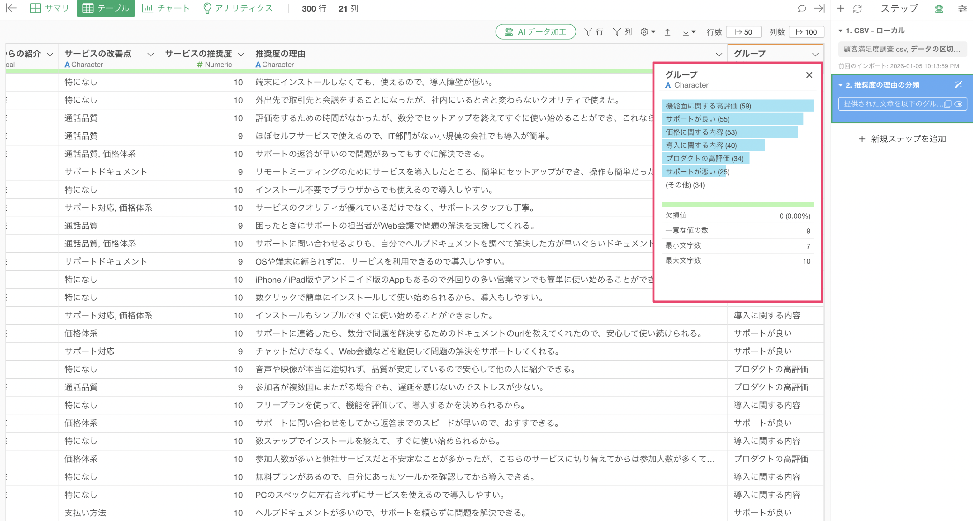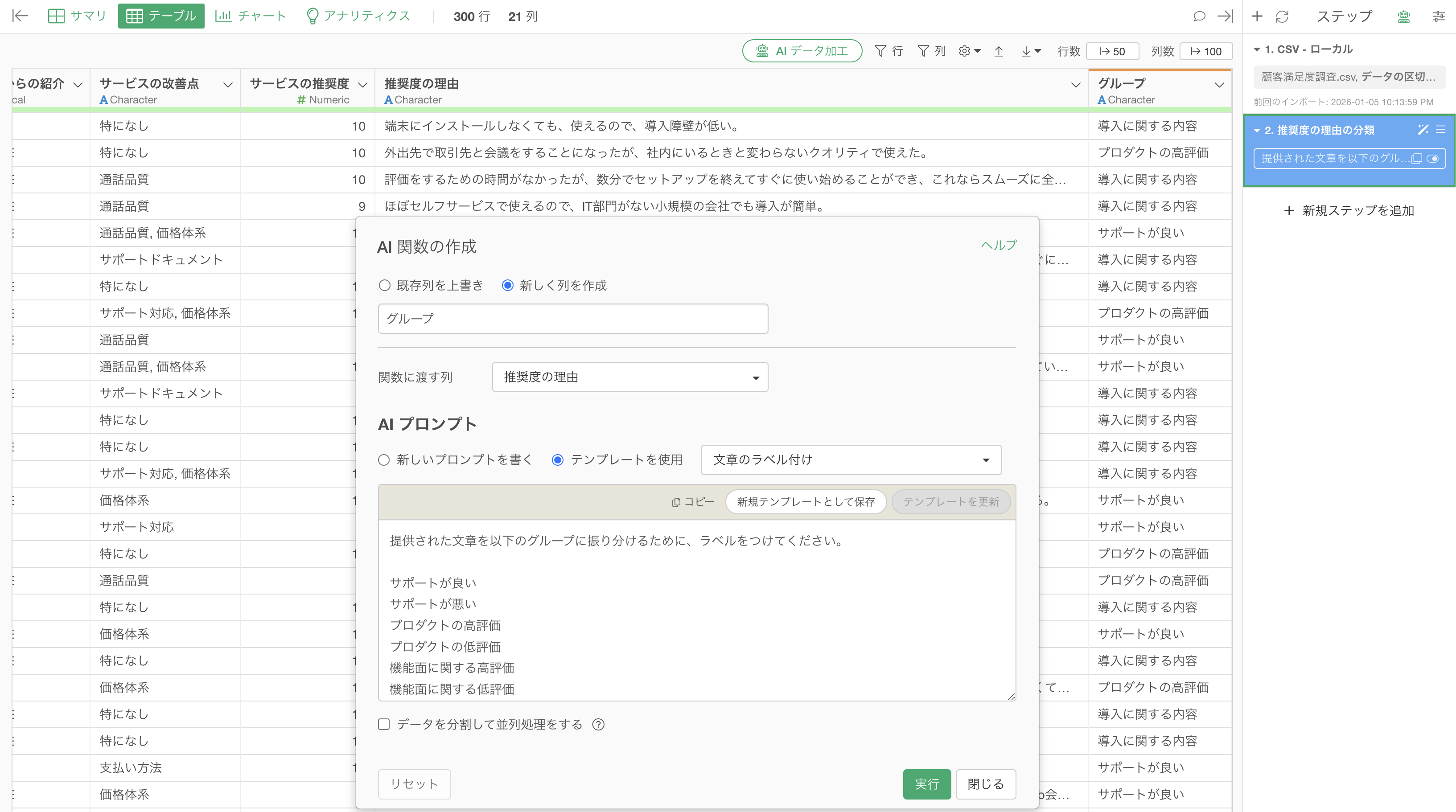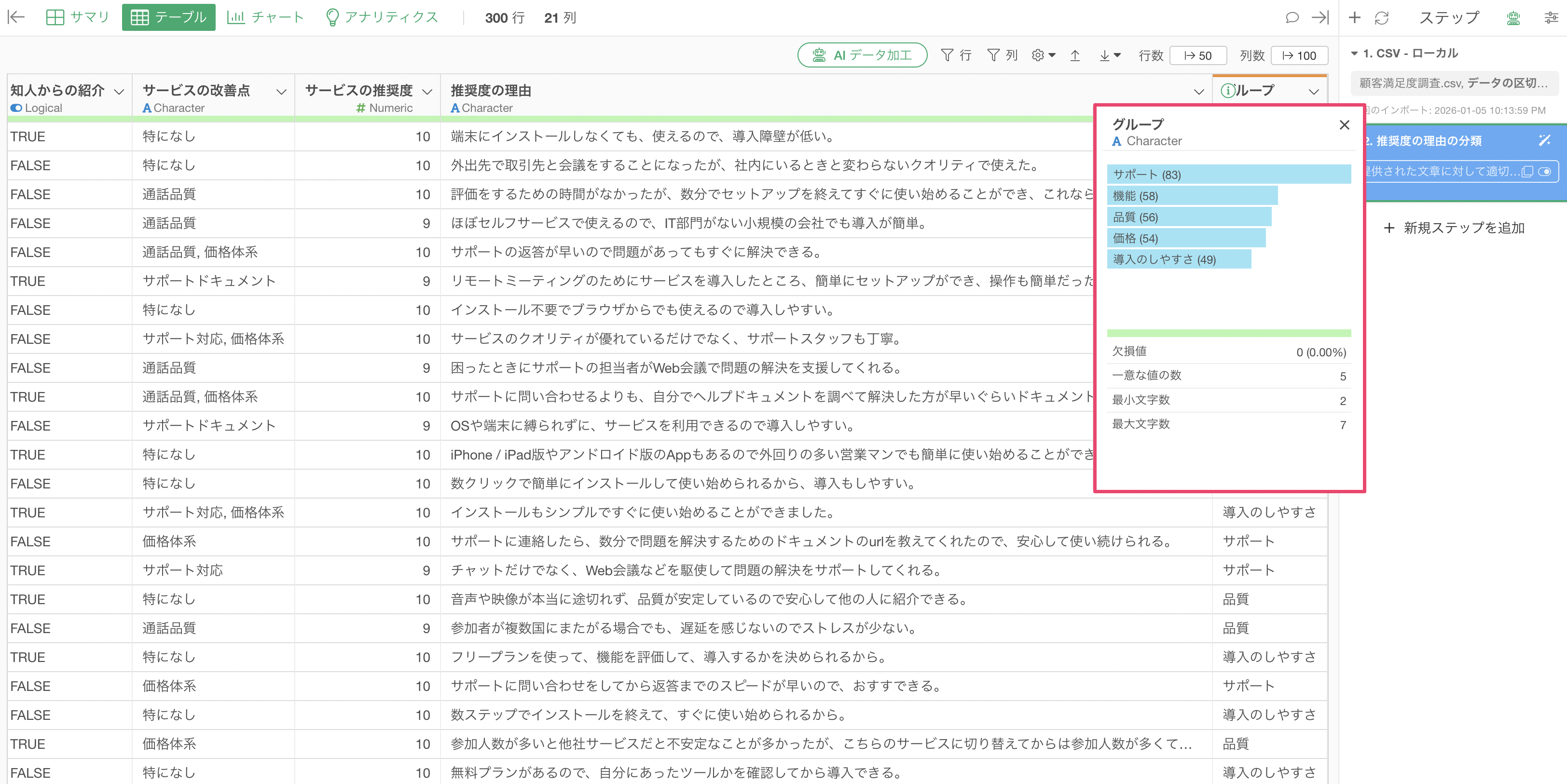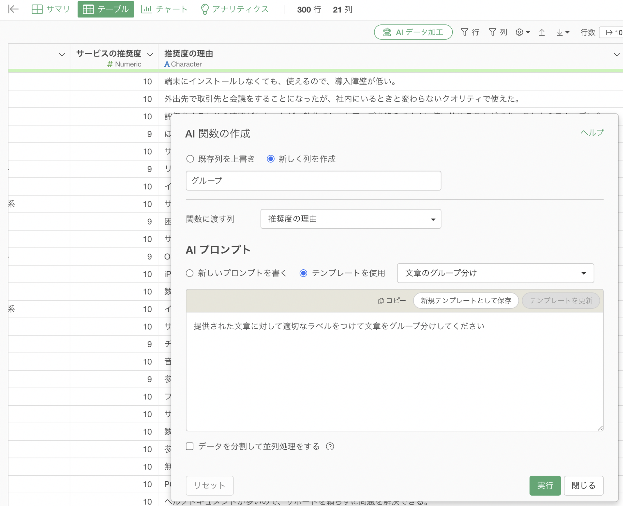 まず、ExploratoryのAI関数を使用して、アンケートの自由回答を文脈に基づいてグループ分けします。