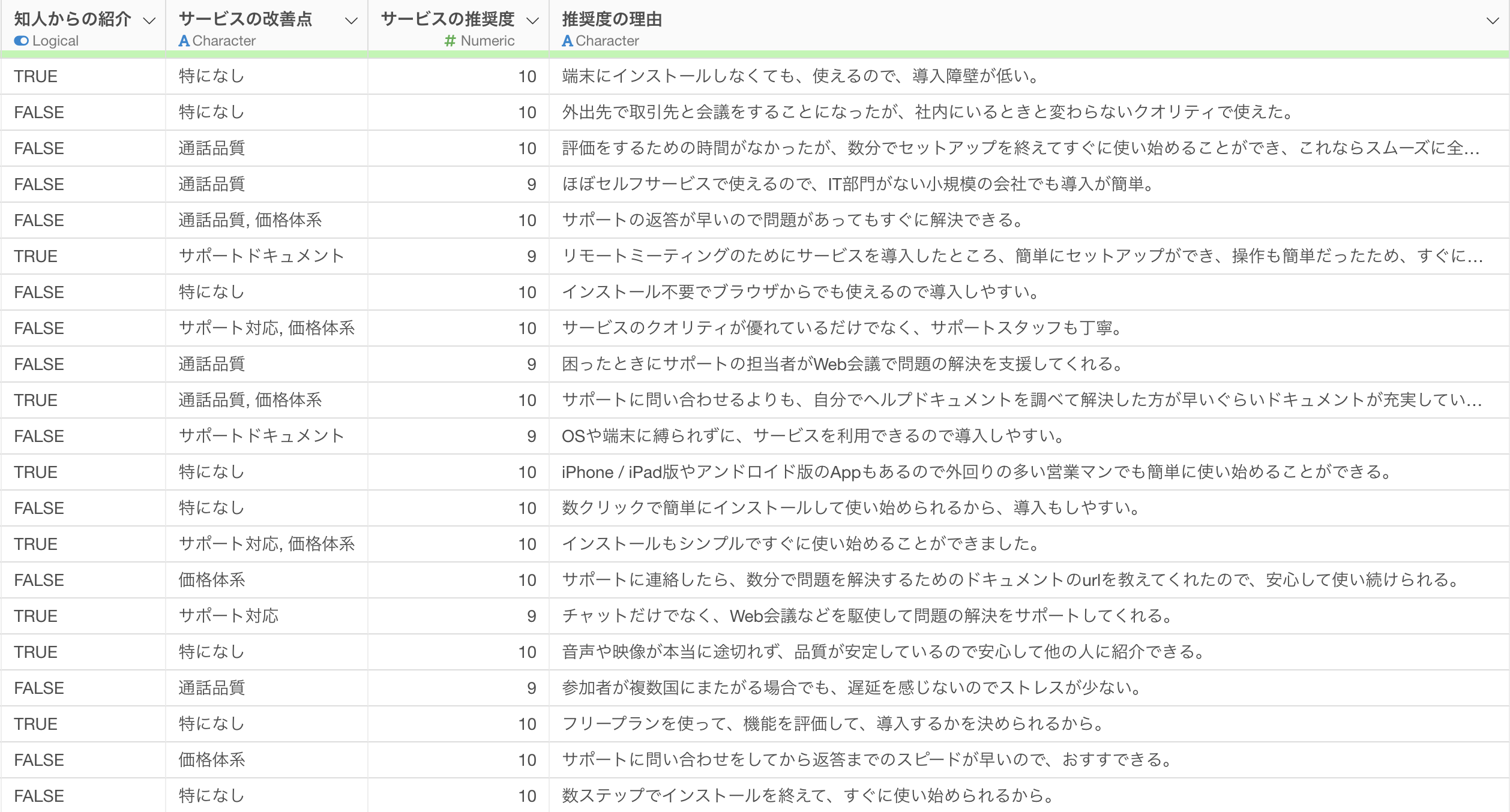 今回使用するデータは、1行が1回答者に対応し、各列にアンケートの質問が並んでいます。特に「推奨度の理由」という自由回答の列に注目します。