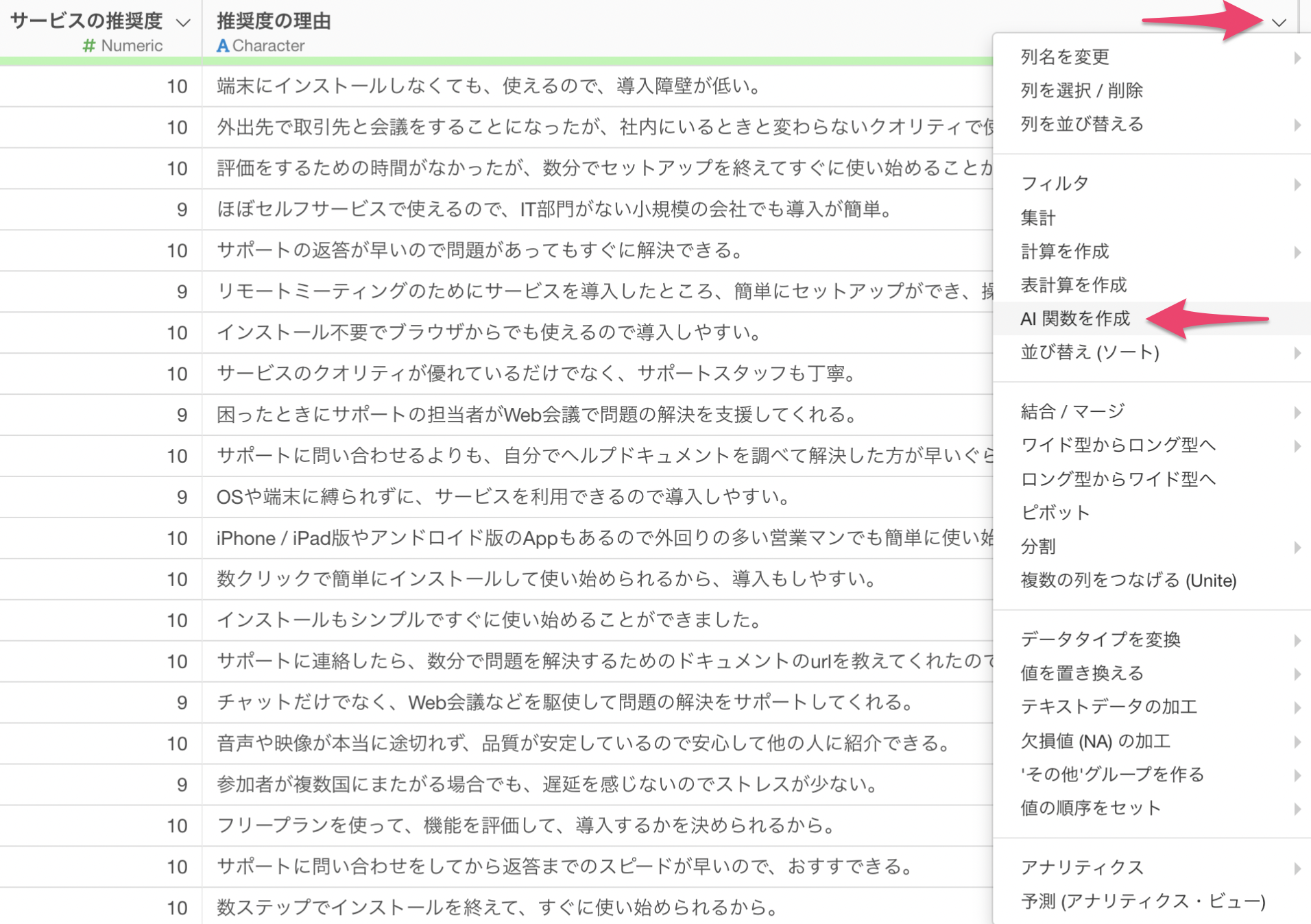 この「推奨度の理由」列のヘッダーメニューから「AI 関数を作成」を選択します。