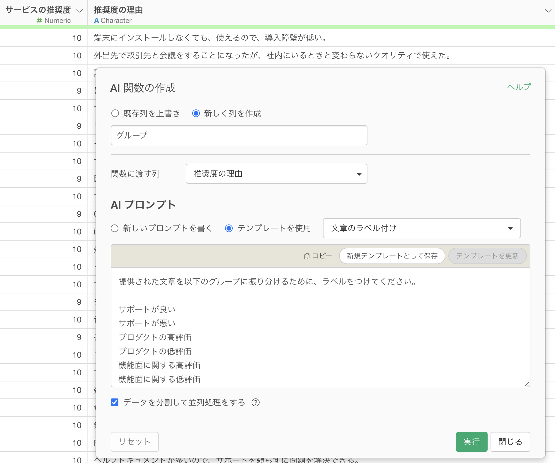 事前にラベルを定義せずにAIに対してグループを自由に作成してもらう時には、「データを分割して並列処理をする」のチェックは外して実行してください。
