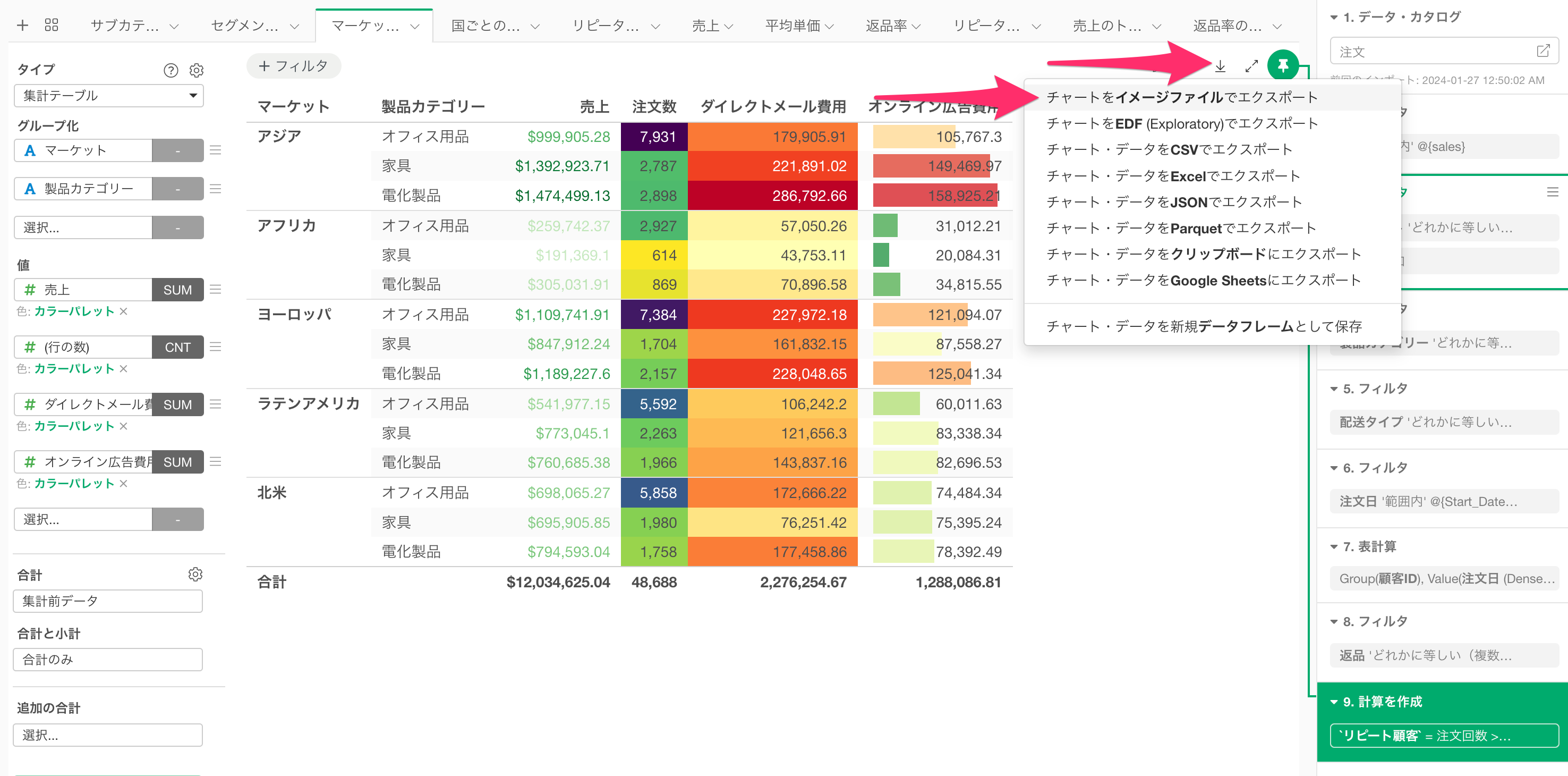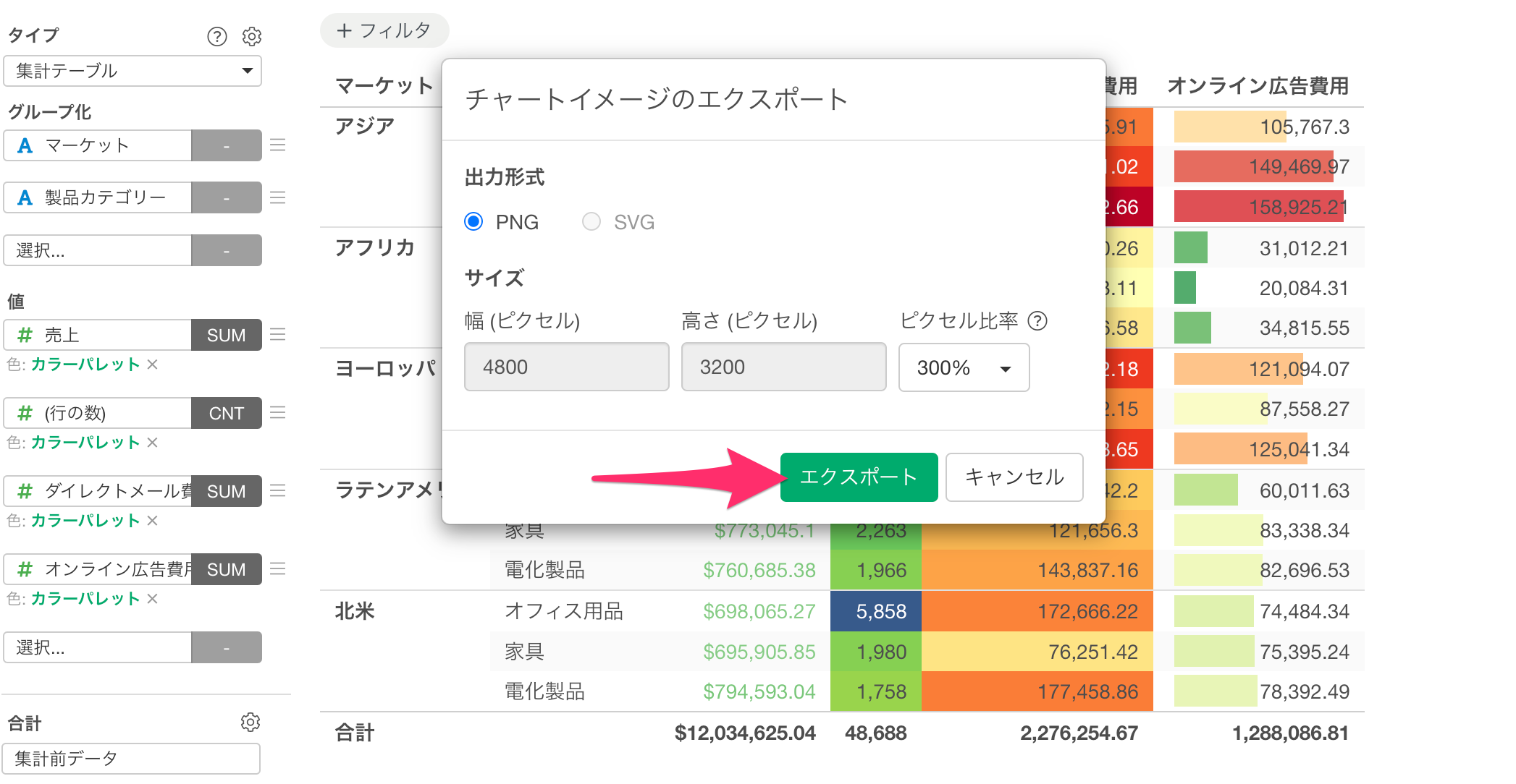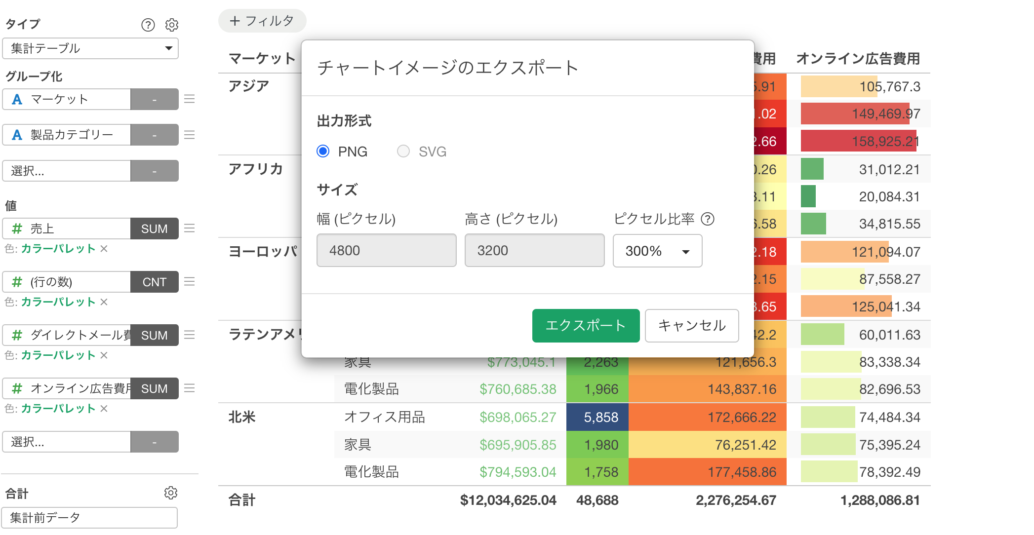 v14.3より前のExploratoryのテーブル形式のチャート(ピボットテーブル、集計テーブル、テーブル)をエクスポートする際には、CSVやExcelなどのデータファイル形式しか選択できませんでした。しかし、テーブルチャートには条件付き書式やビジュアルフォーマットを設定できるため、これらの見た目を保持したまま画像として保存したいというニーズが多くありました。