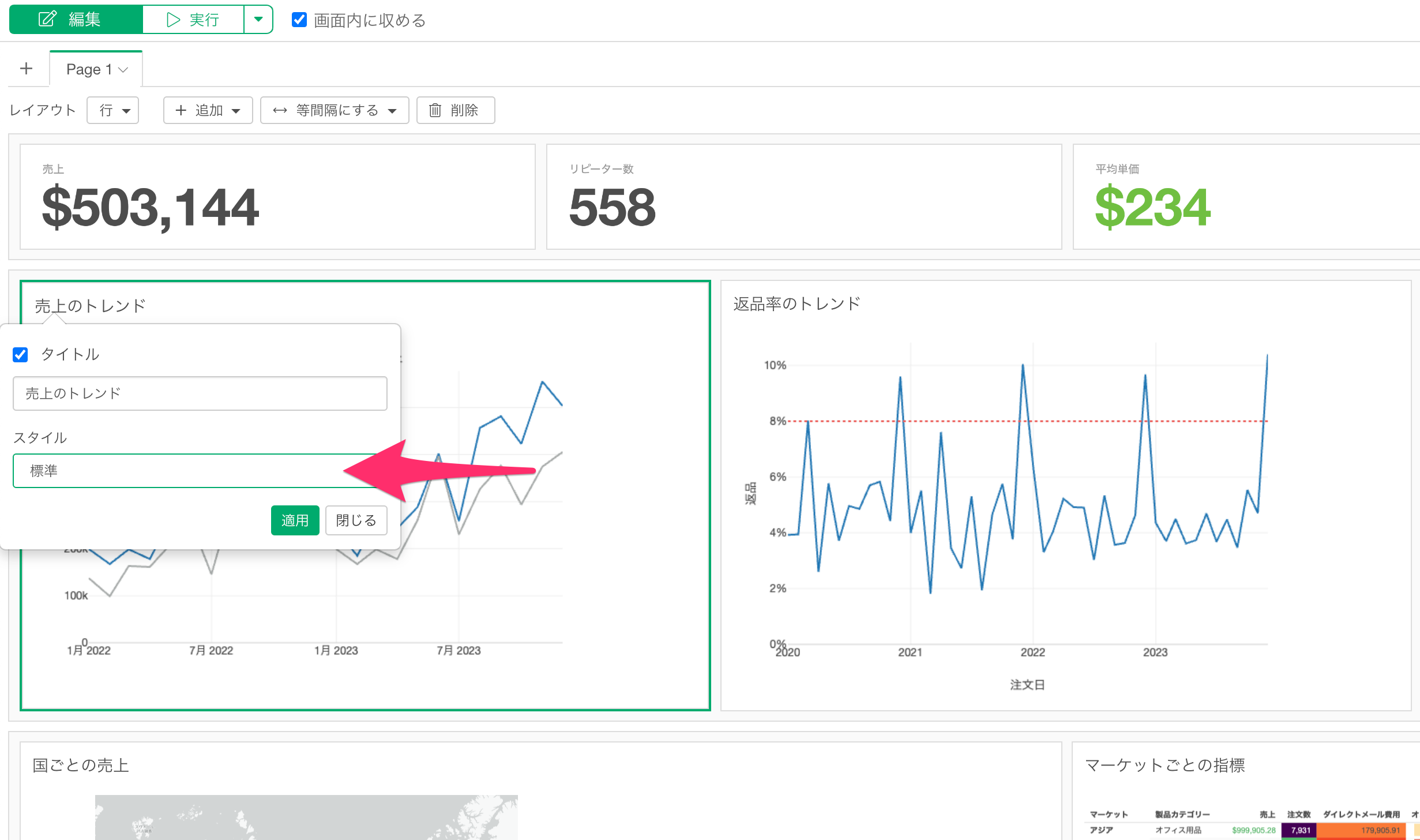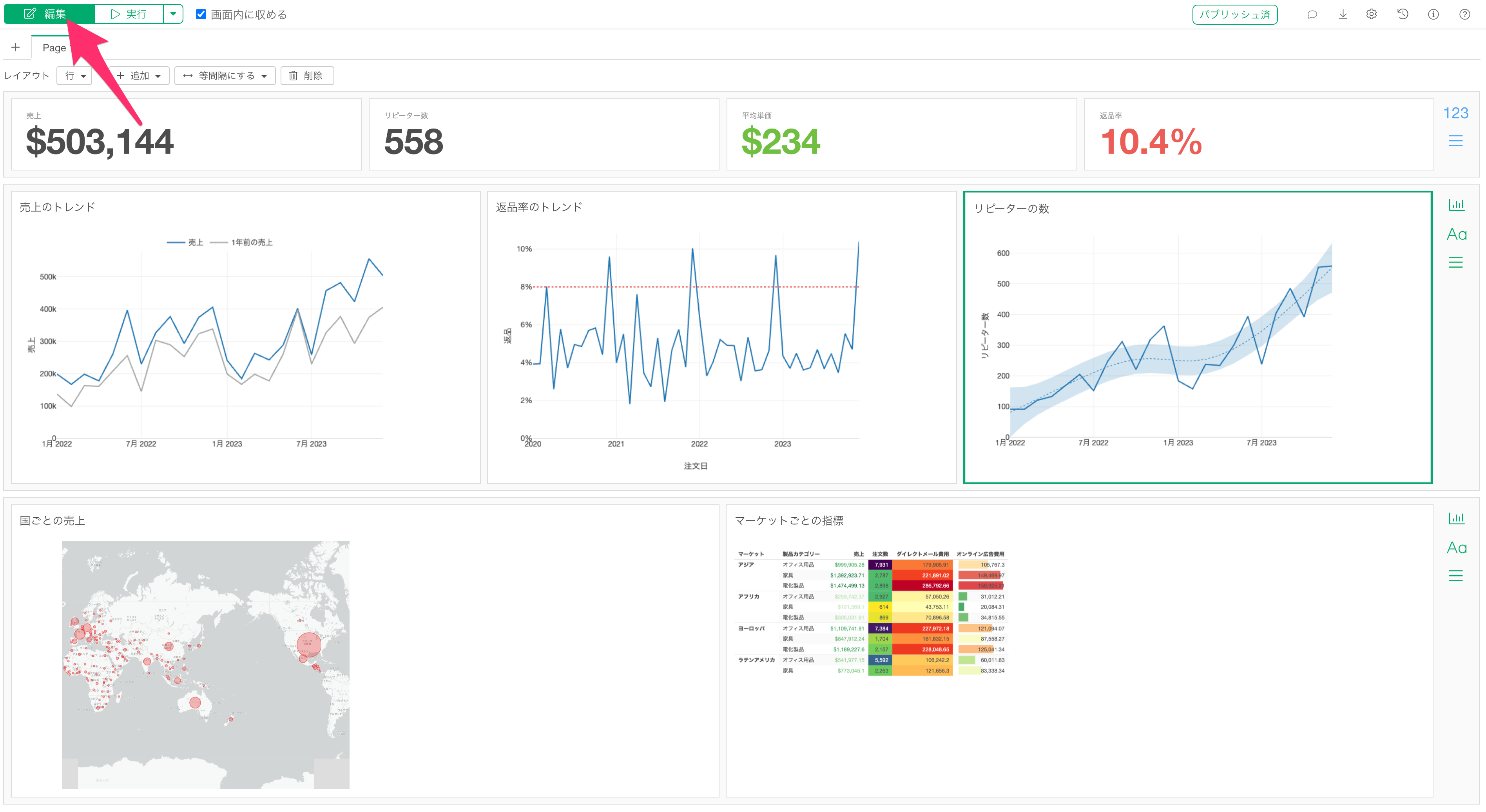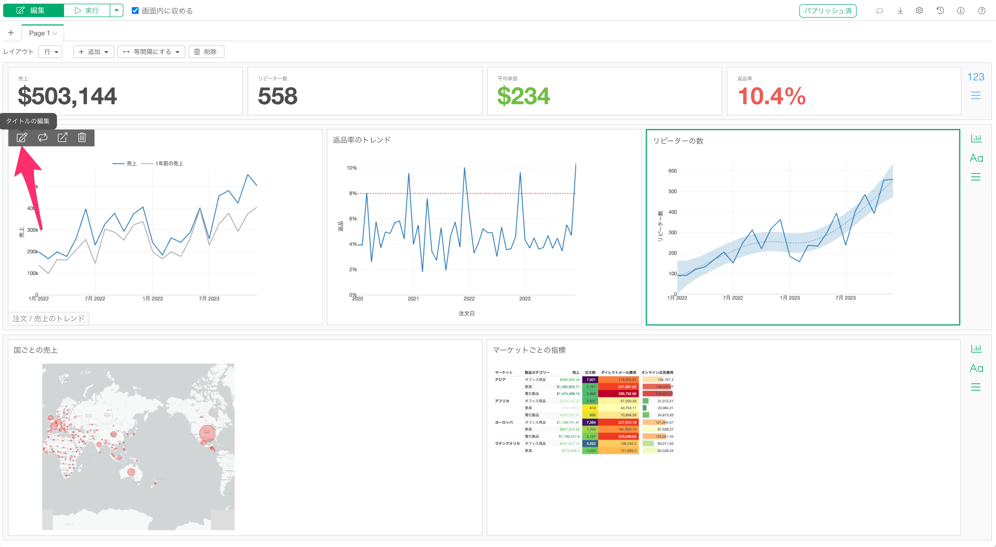 ダッシュボード上のチャートタイトルのスタイルを変更するには、まずダッシュボードを編集モードに切り替えます。
