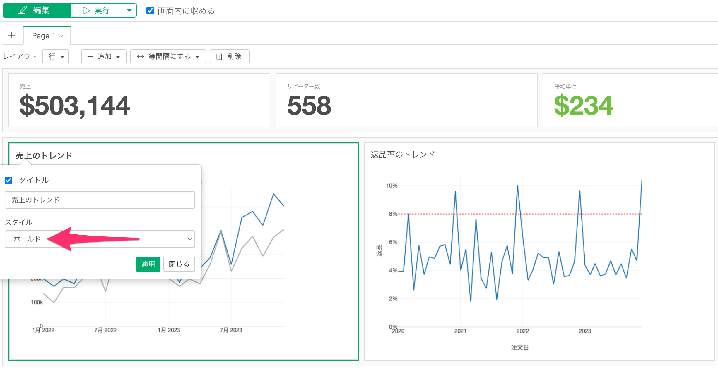 Exploratoryのダッシュボードでは、各チャートのタイトルに対してボールド(太字)、イタリック(斜体)、またはその両方を組み合わせたスタイルを適用できます。これにより、ダッシュボードの視覚的な統一感を高め、重要な情報を強調することが可能になります。
