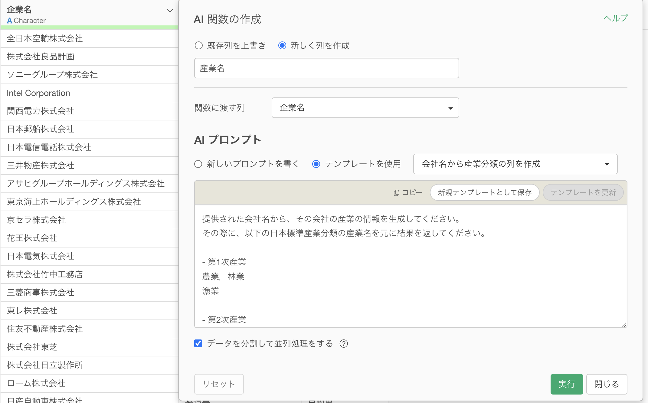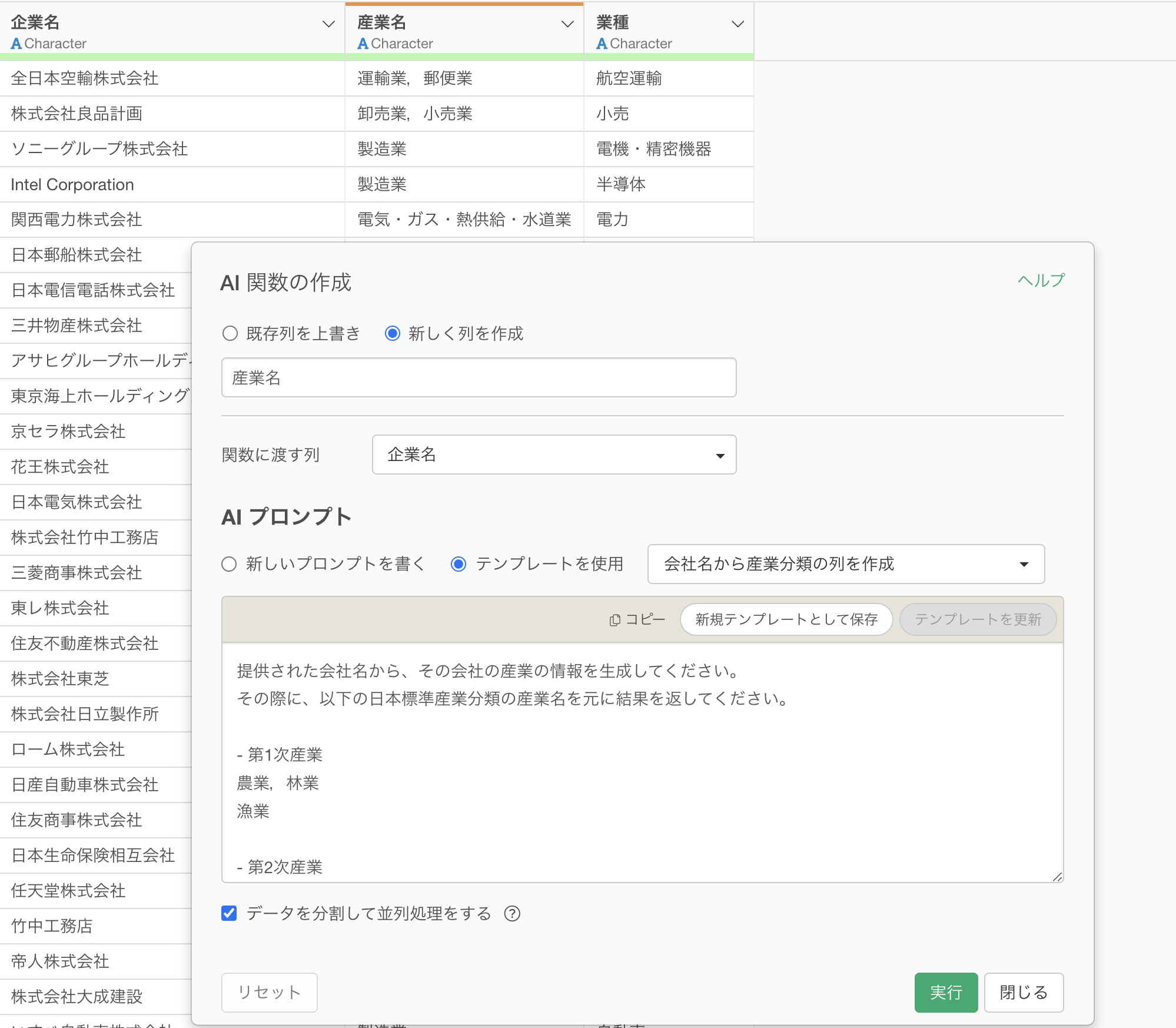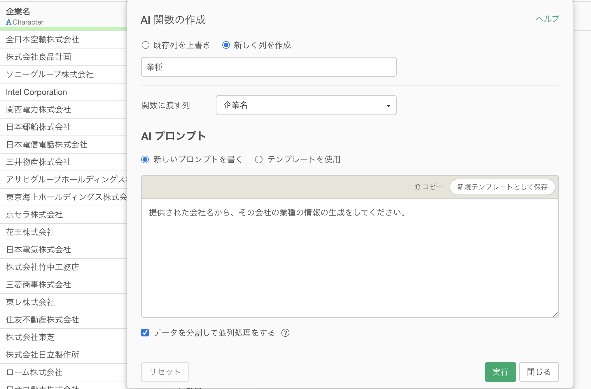 企業名の列ヘッダーメニューから「AI関数を作成」を選択します。