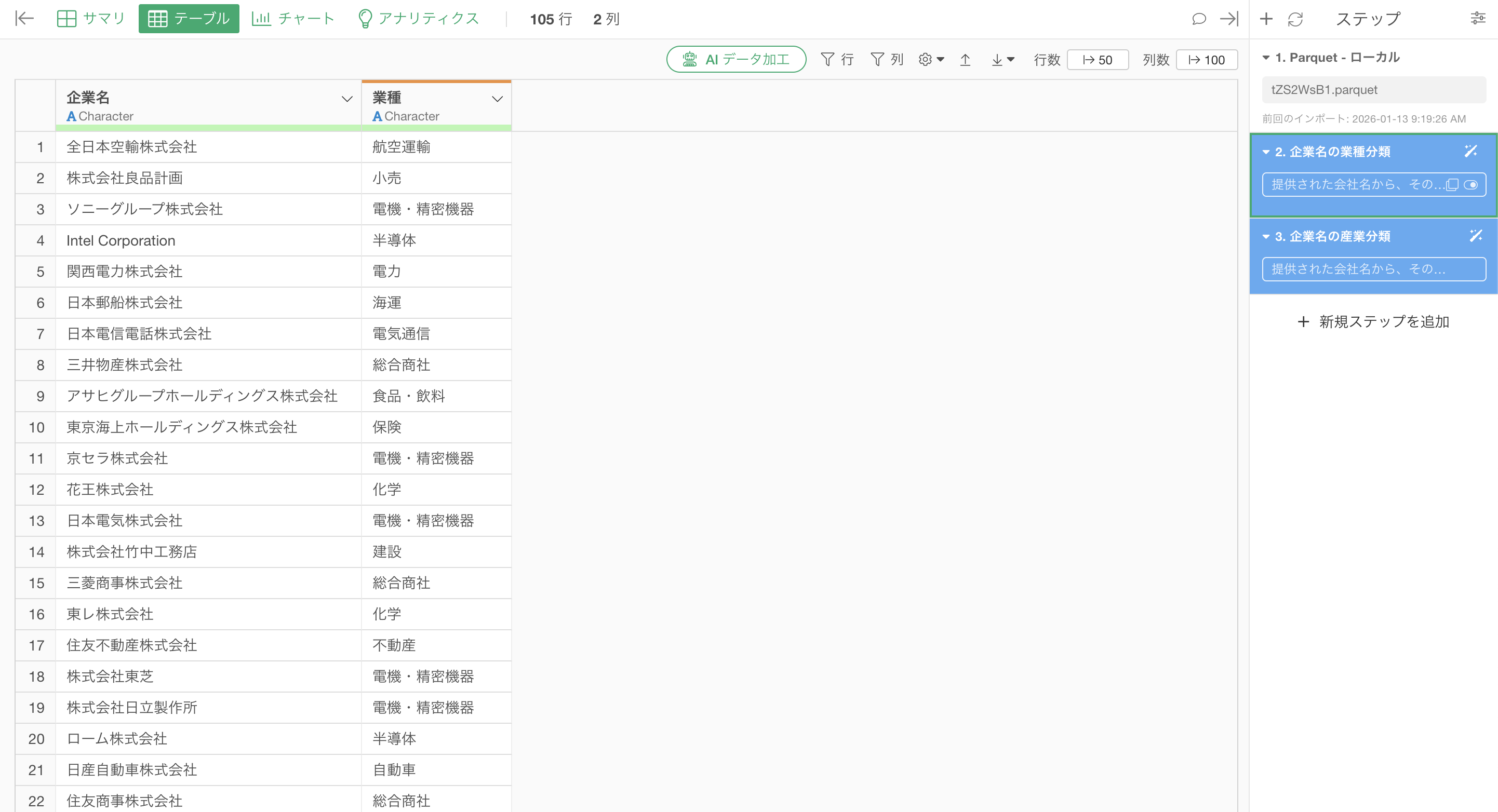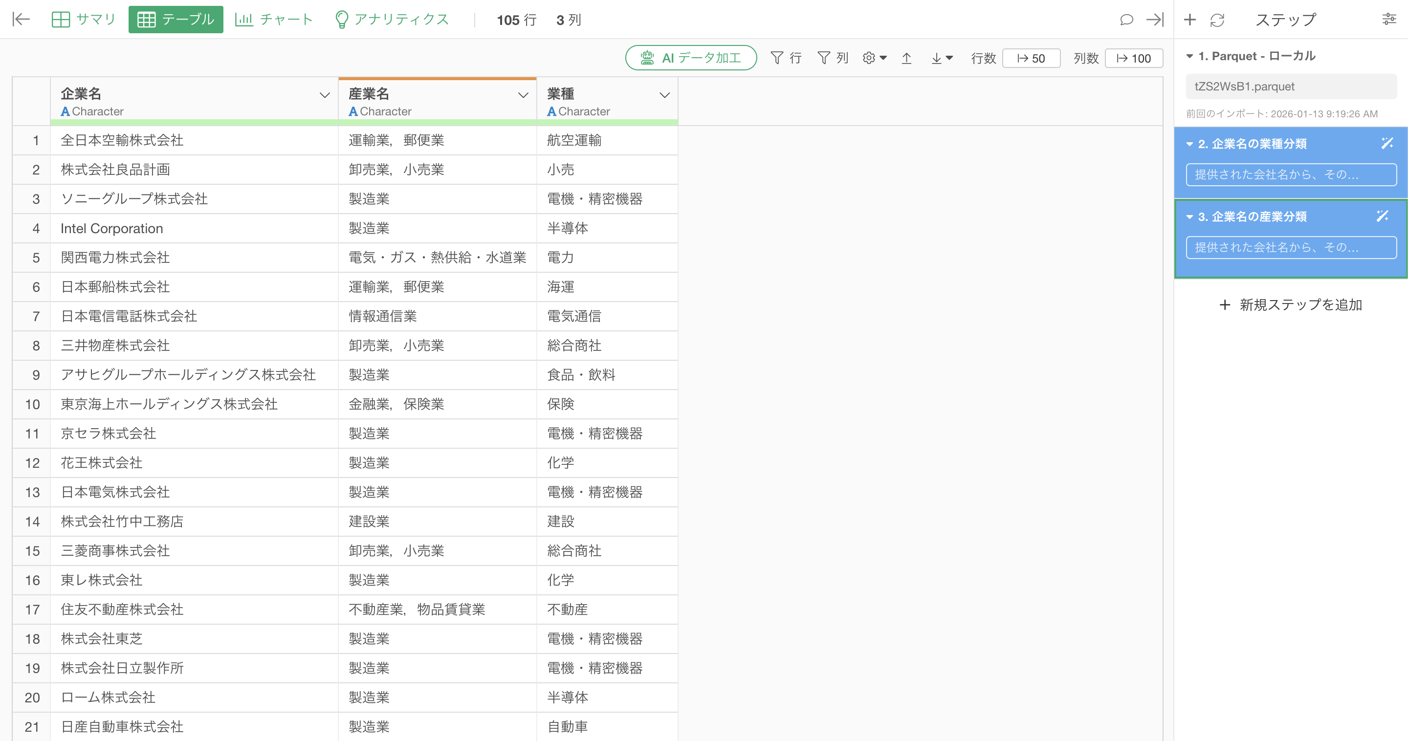 生成された業種名は、例えば「全日本空輸株式会社」に対して「航空運送」といった形で、直感的で適切な結果が返されることを確認できます。これにより、手動での分類作業を大幅に削減し、データの品質を向上させることが可能になります。