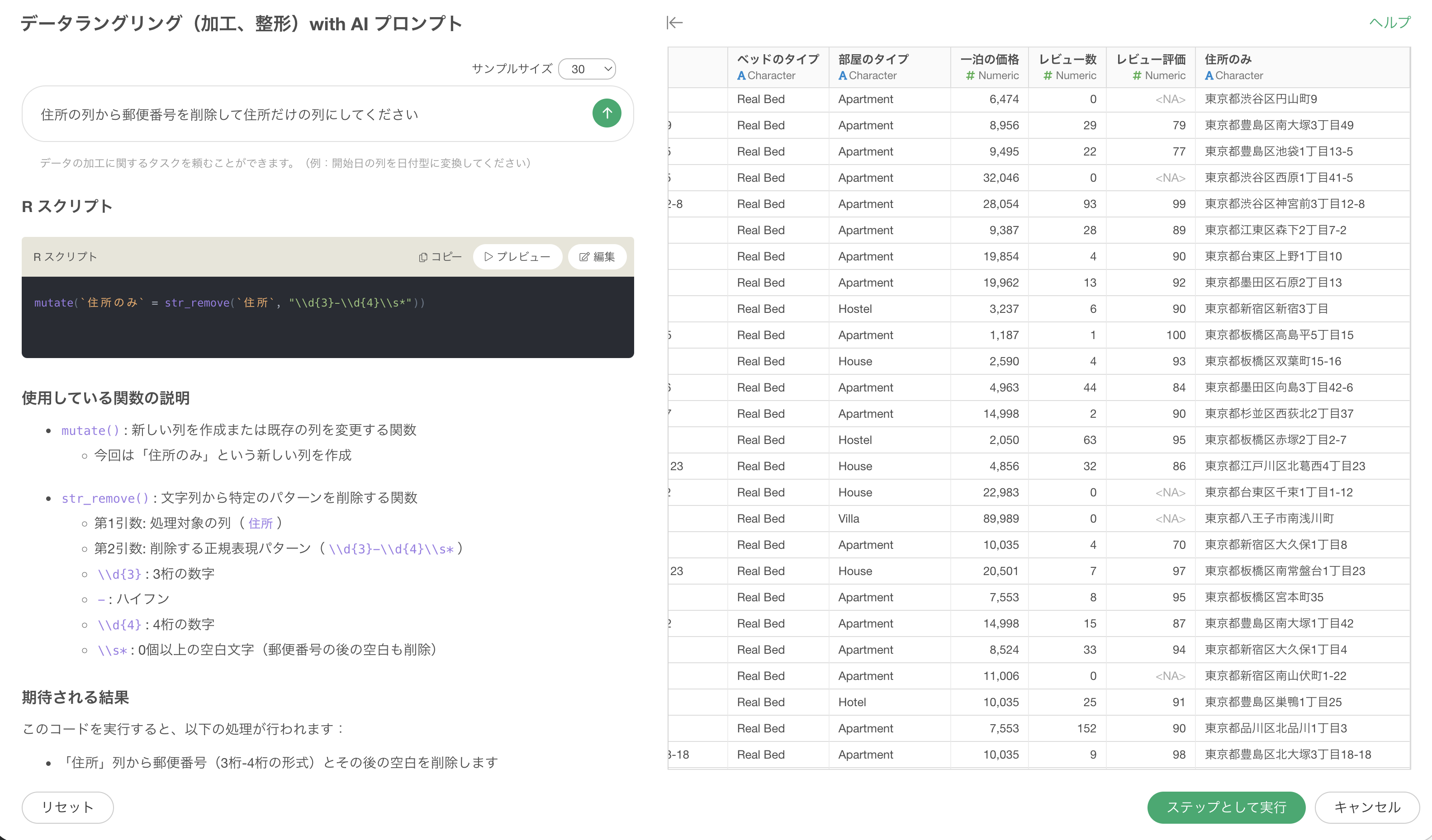 実行すると、Exploratoryが内部的にRのスクリプト(mutate関数など)を生成します。この際、AIは「3桁の数字、ハイフン、4桁の数字」というパターンを正規表現(\\d{3}-\\d{4}など)として自動的に解釈し、該当する部分を削除した新しい住所列を作成します。
