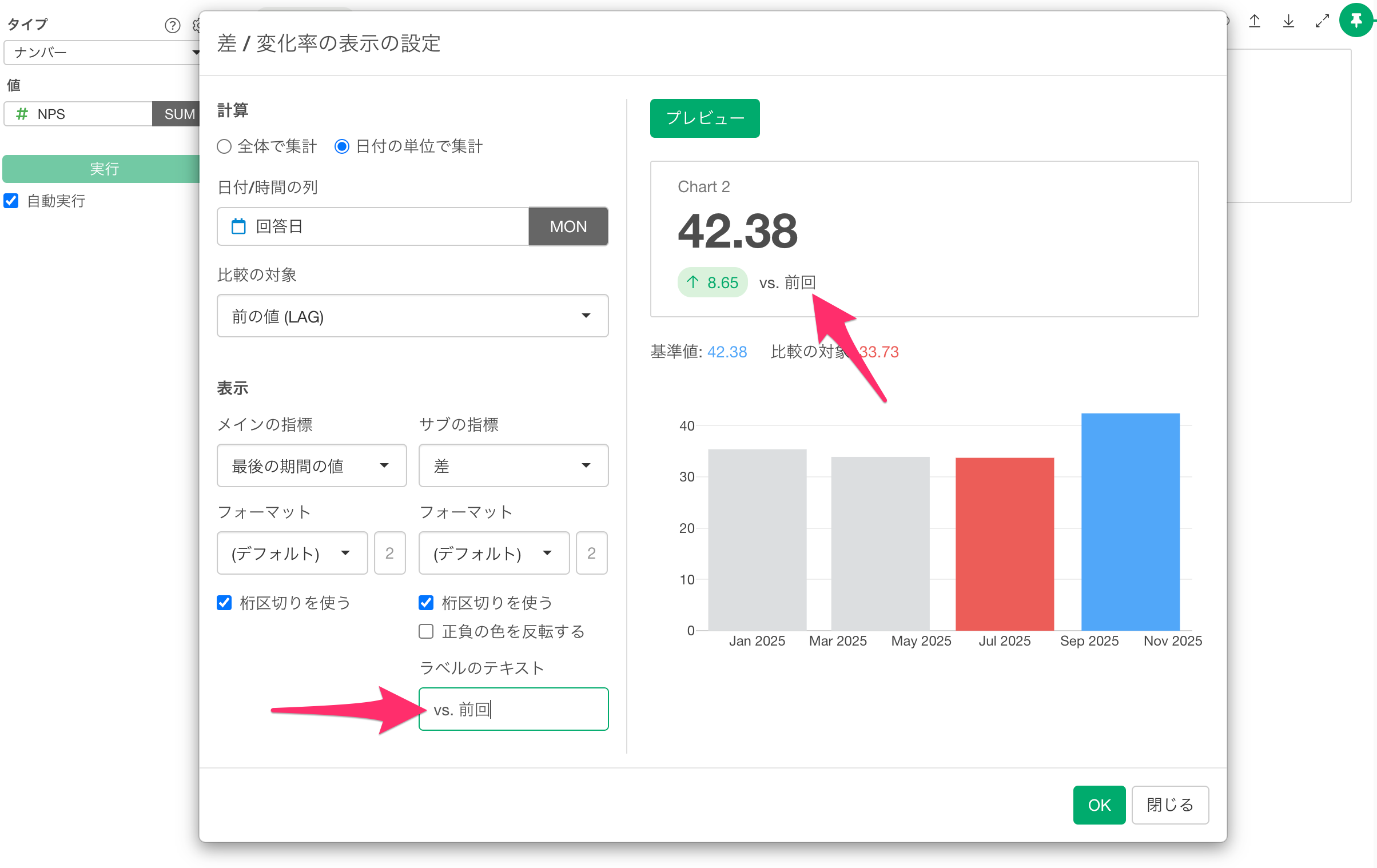 そこでラベルのテキスト欄に「vs. 前回」など、実態に合った表現を入力し、プレビューボタンをクリックすると、指定したラベルテキストでサブ指標が表示されます。