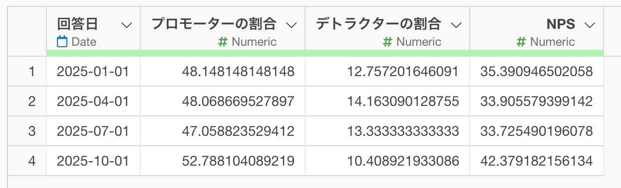 今回は1行が1つのアンケート回答を表し、列には回答日時、NPS(顧客推奨度)などの情報を持つデータを利用します。このデータは不定期に集計されたNPSの値が含まれています。