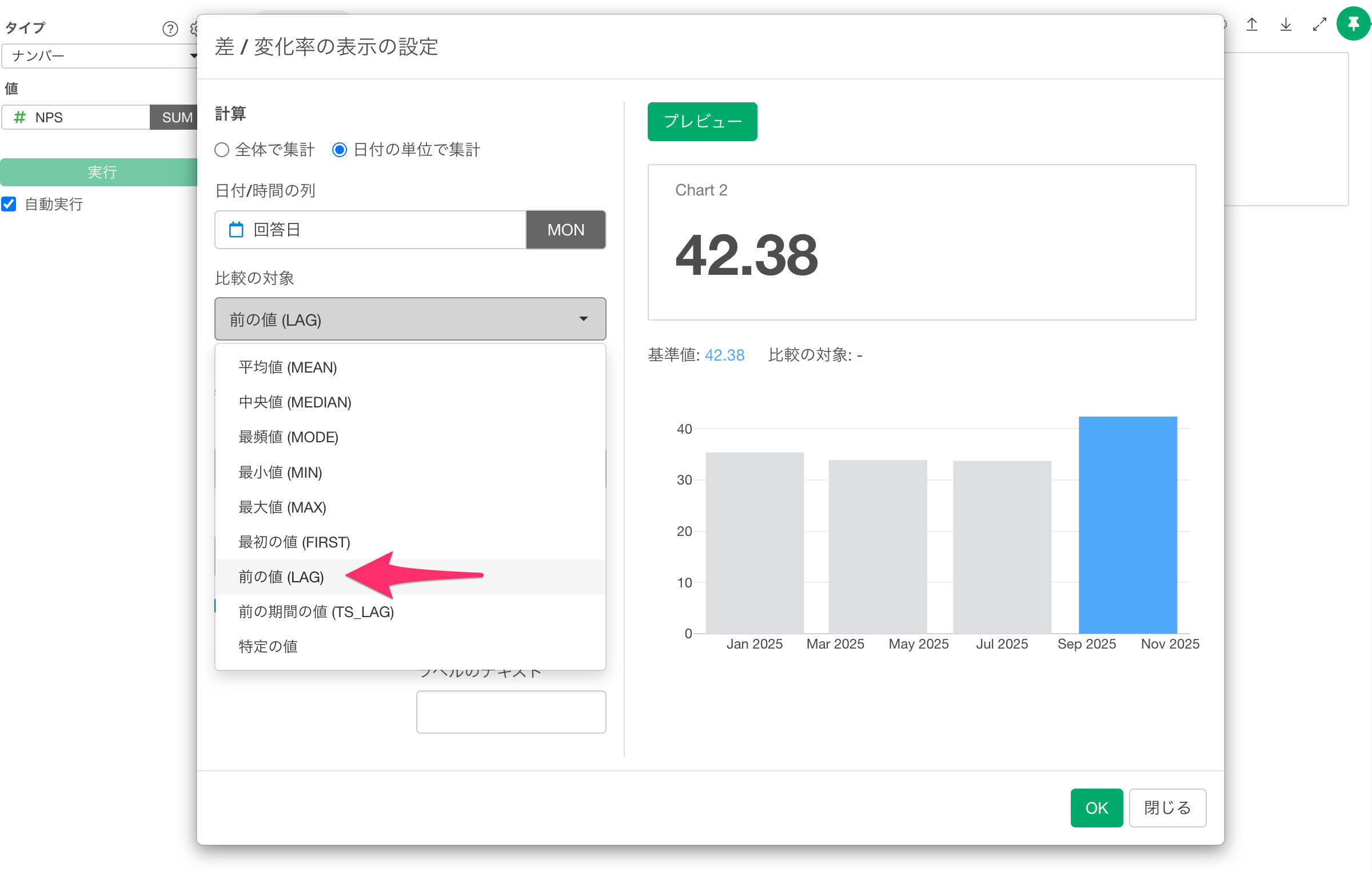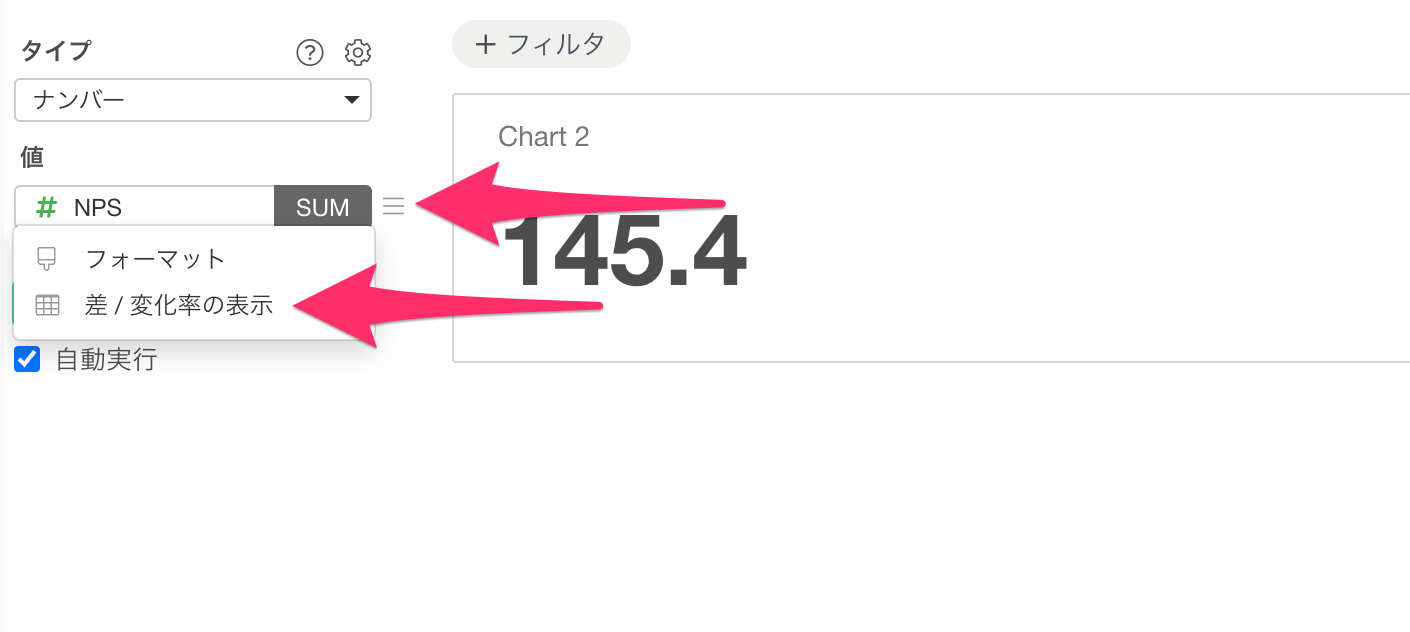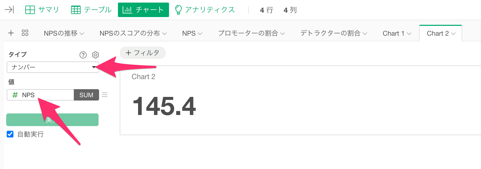 チャートタイプのメニューから「ナンバー」を選択し、今回はあらかじめ計算されている「NPS」を選択します。