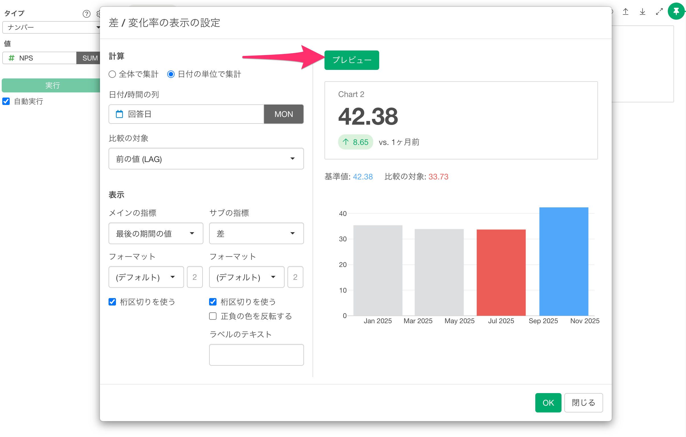 プレビューボタンをクリックすると、前回の値との差がサブ指標として表示されます。